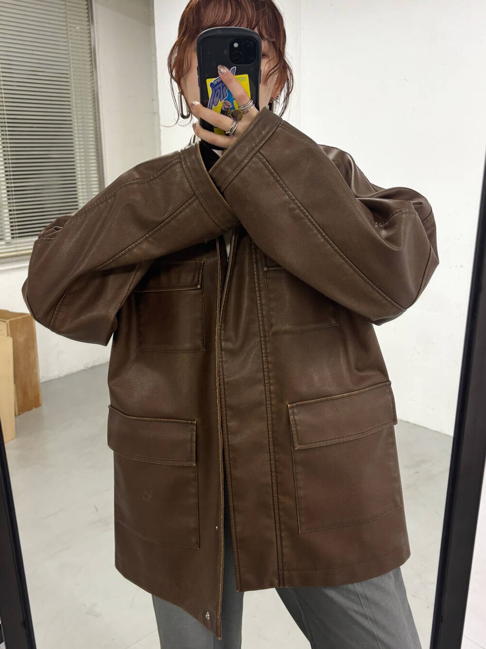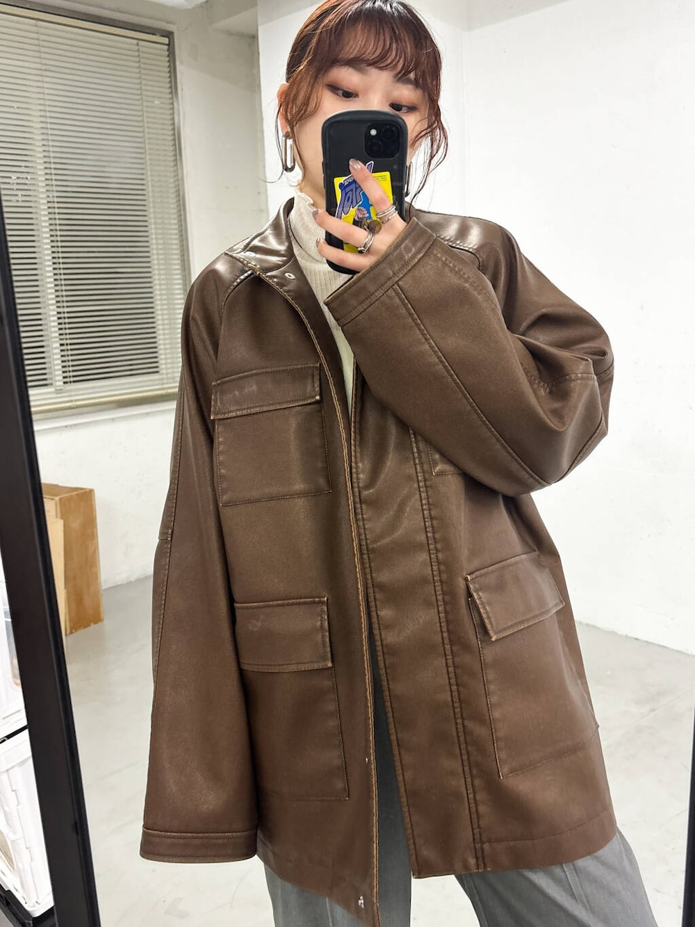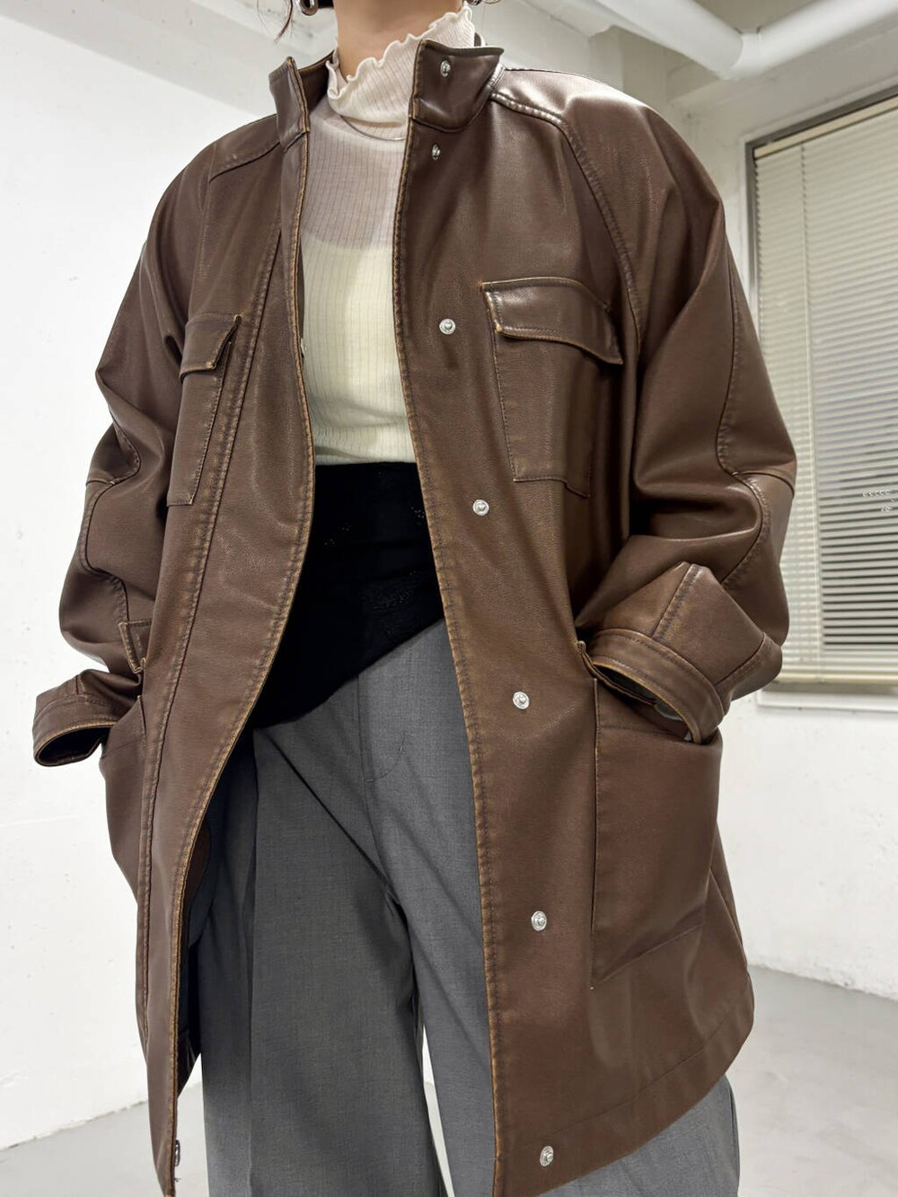 ヴィンテージ感のあるウォッシュ加工が目を引くフェイクレザージャケット
