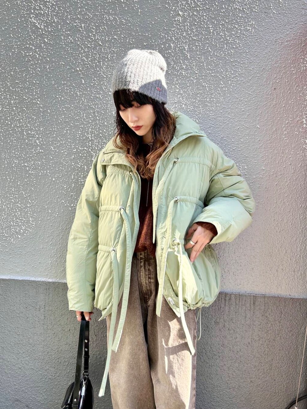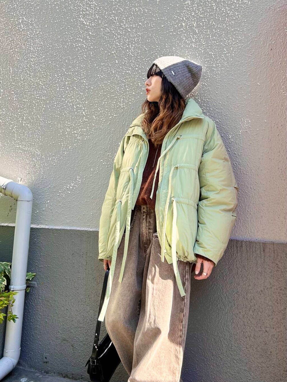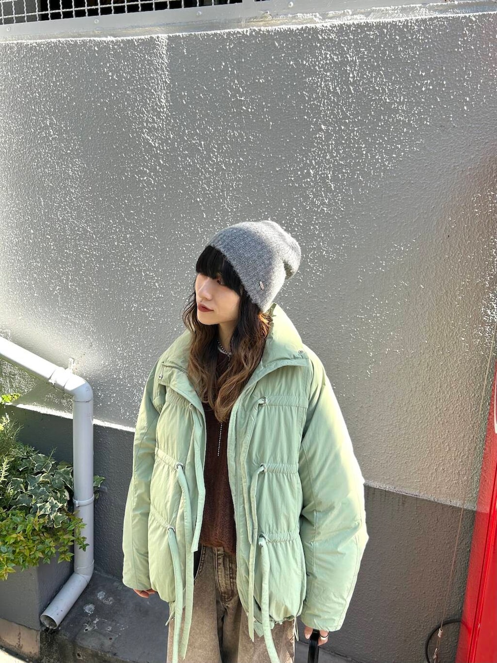 ポイントにグレーのニットビーニーをプラス。