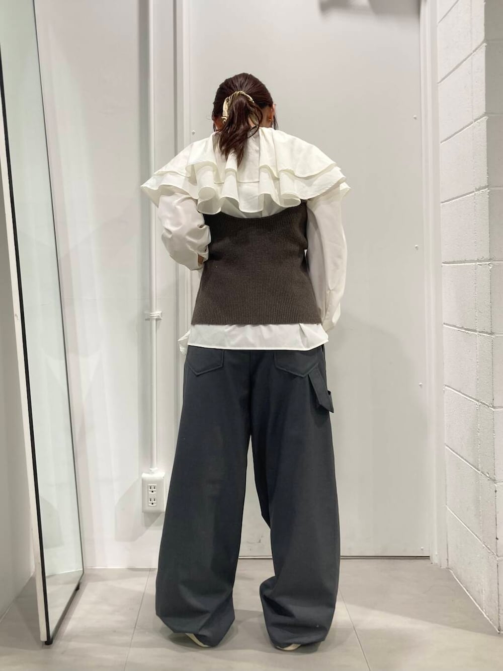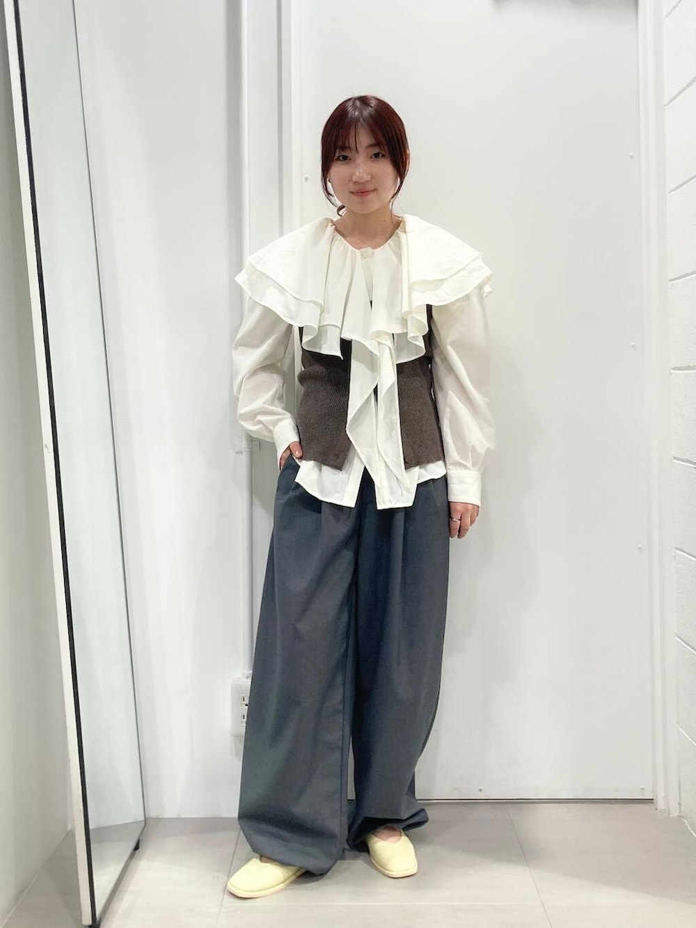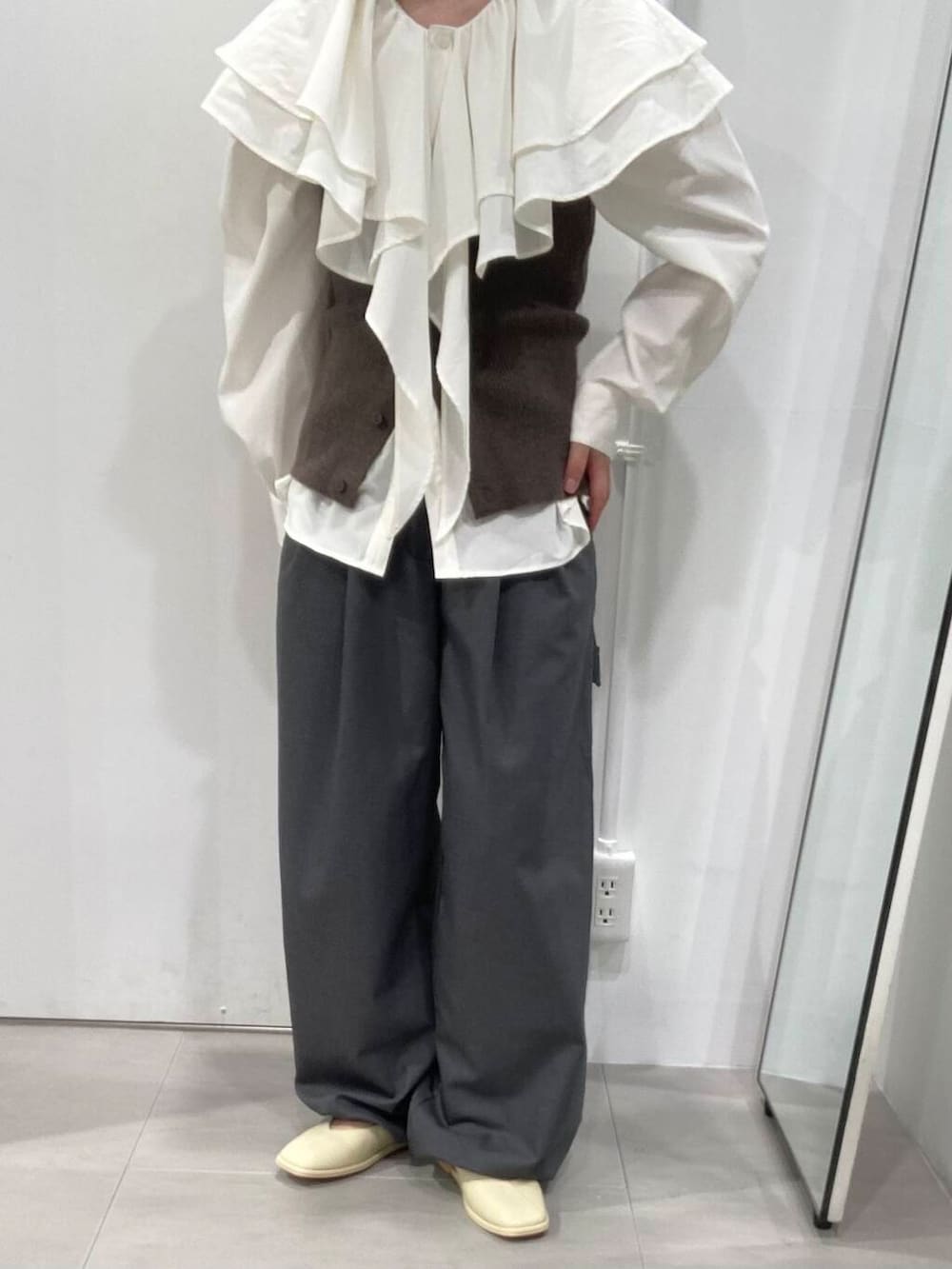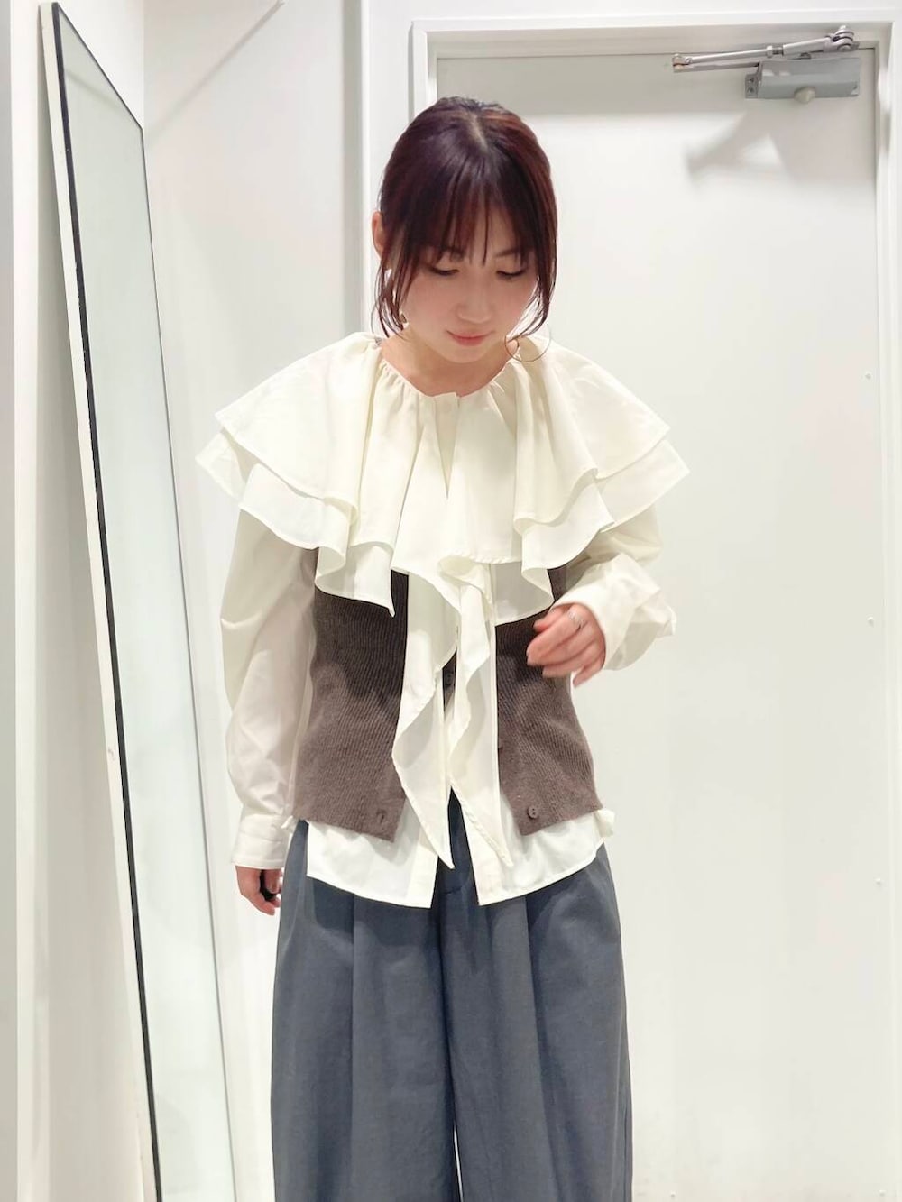 衿のボリュームが際立つよう、ニットビスチェを重ねてウエストをすっきり見せています!