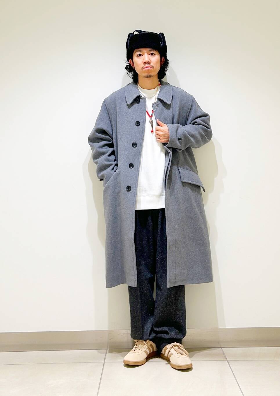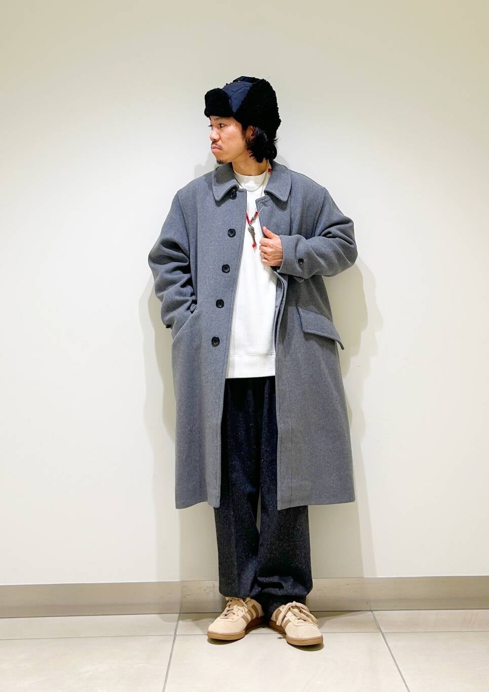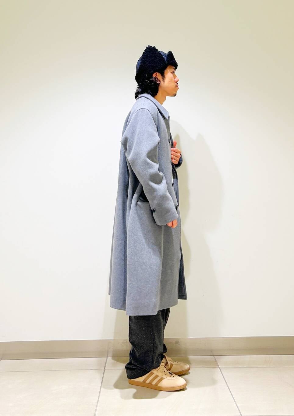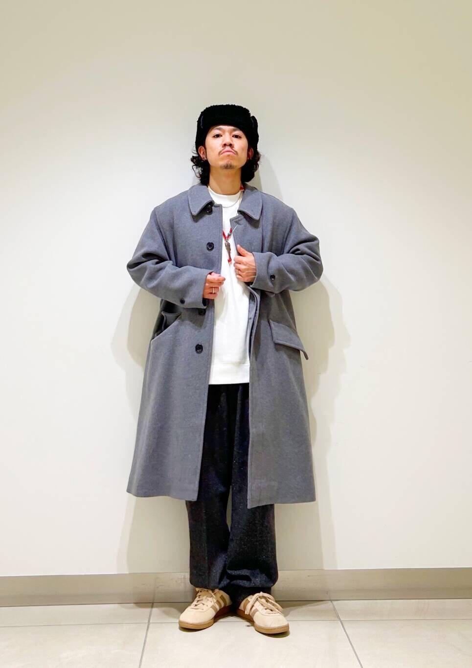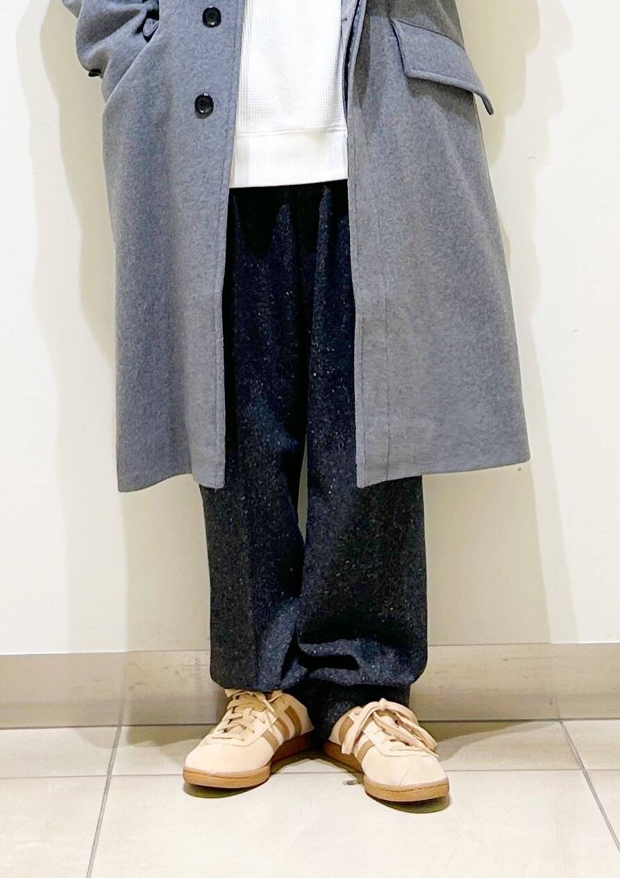 今回はバルカラーコートとネップパンツを使用したコーディネート。
