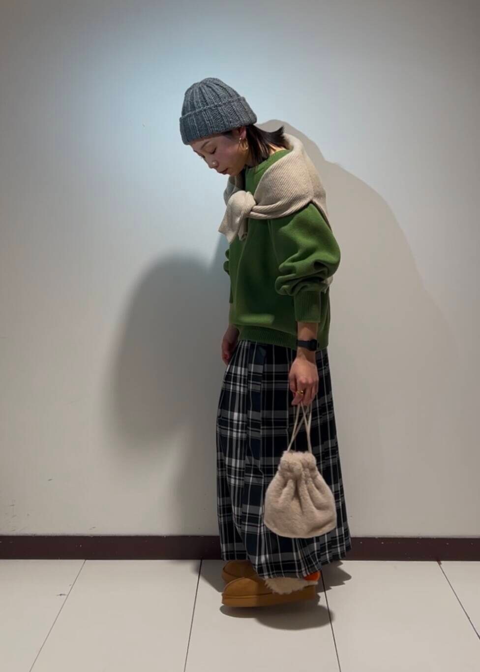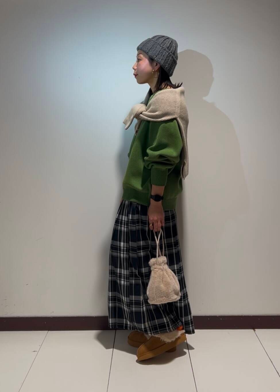 チェックのプリーツスカートを合わせれば一気に女性らしく可愛らしい雰囲気になりますね😌