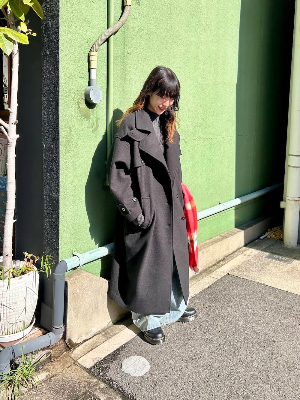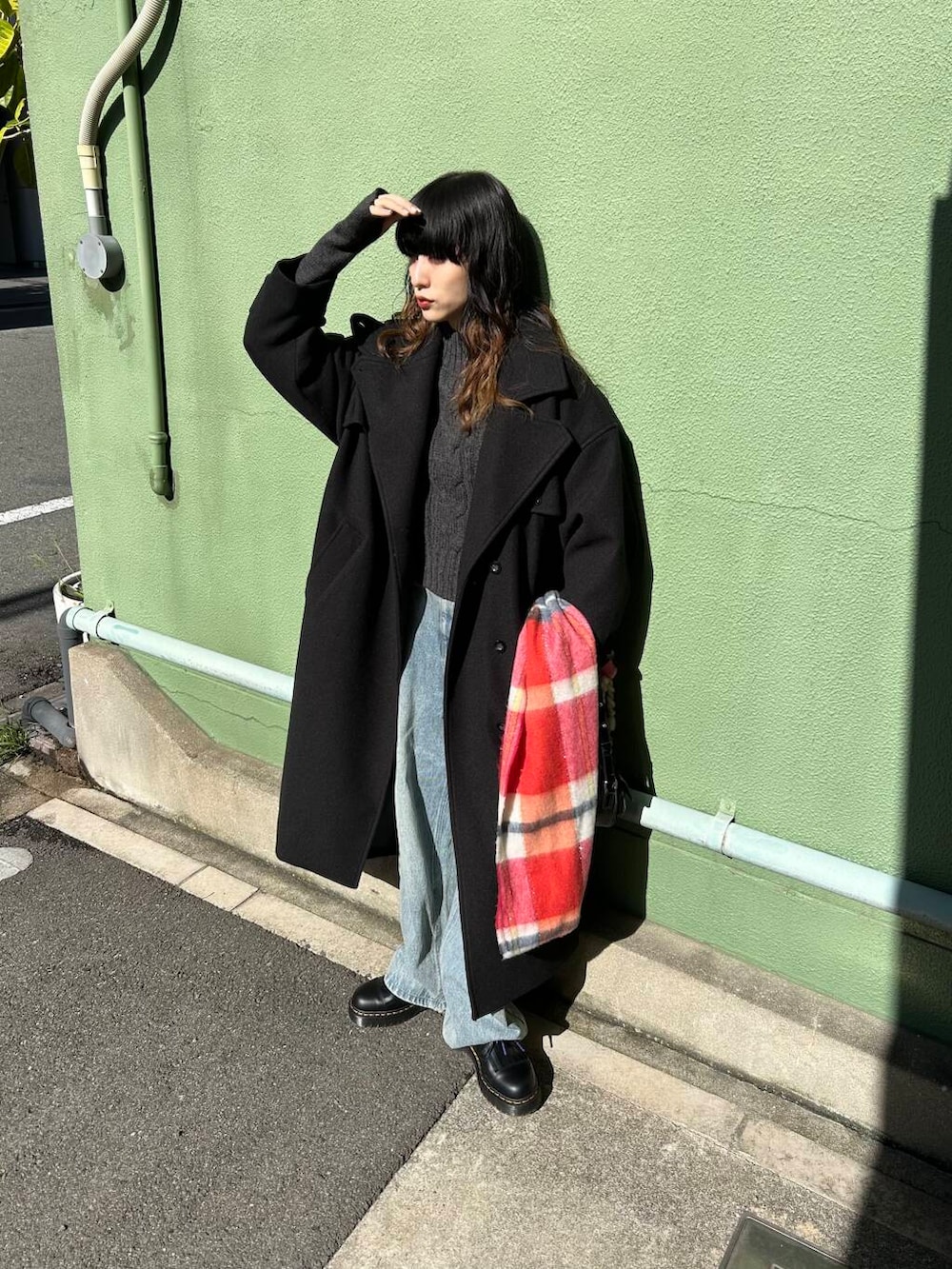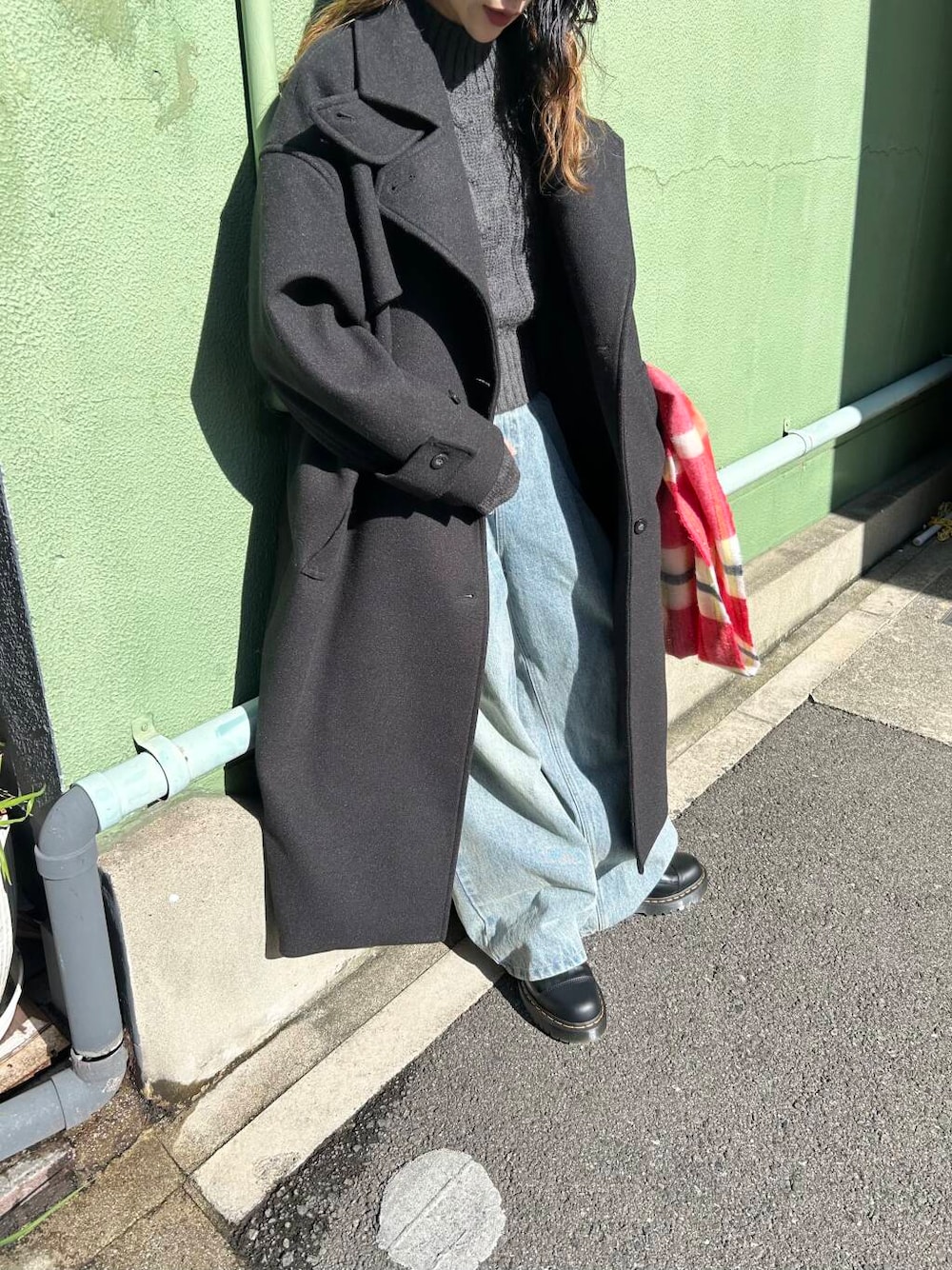 ポイントに赤のラメチェックマフラーをプラス。
