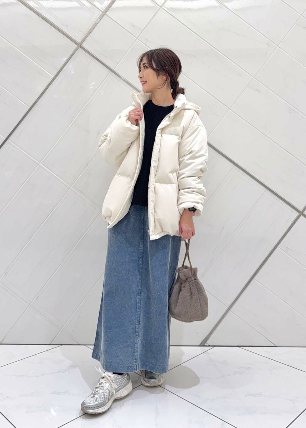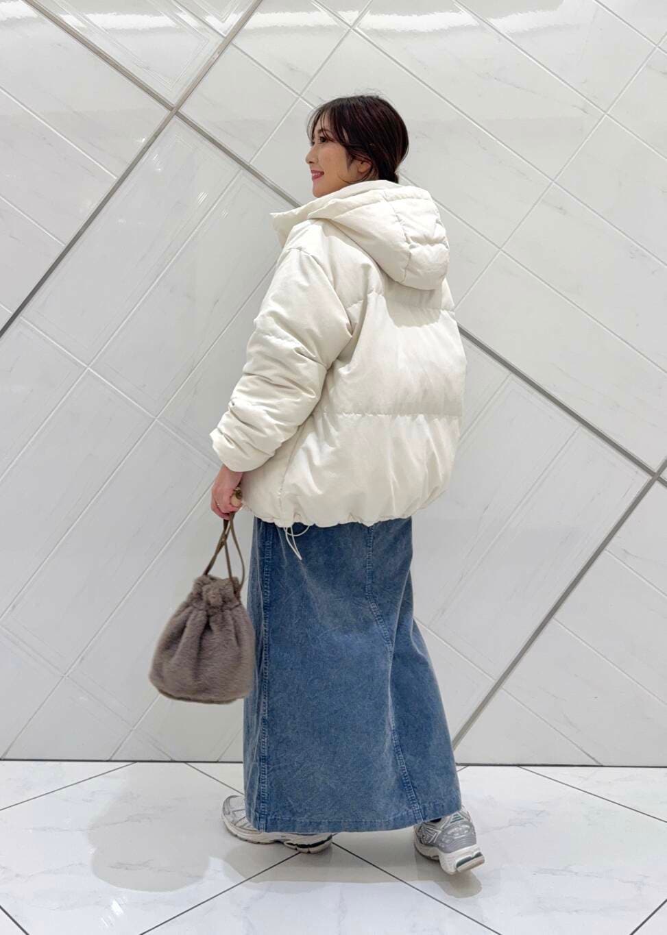アウターは軽くてふかふかで厚みがあるので暖かく、裾のドローコードを調整するとすっきりめのシルエットになります。