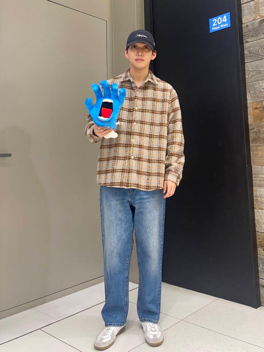 ベージュ系のチェックシャツにブルーデニムで爽やかな感じの合わせにしてます