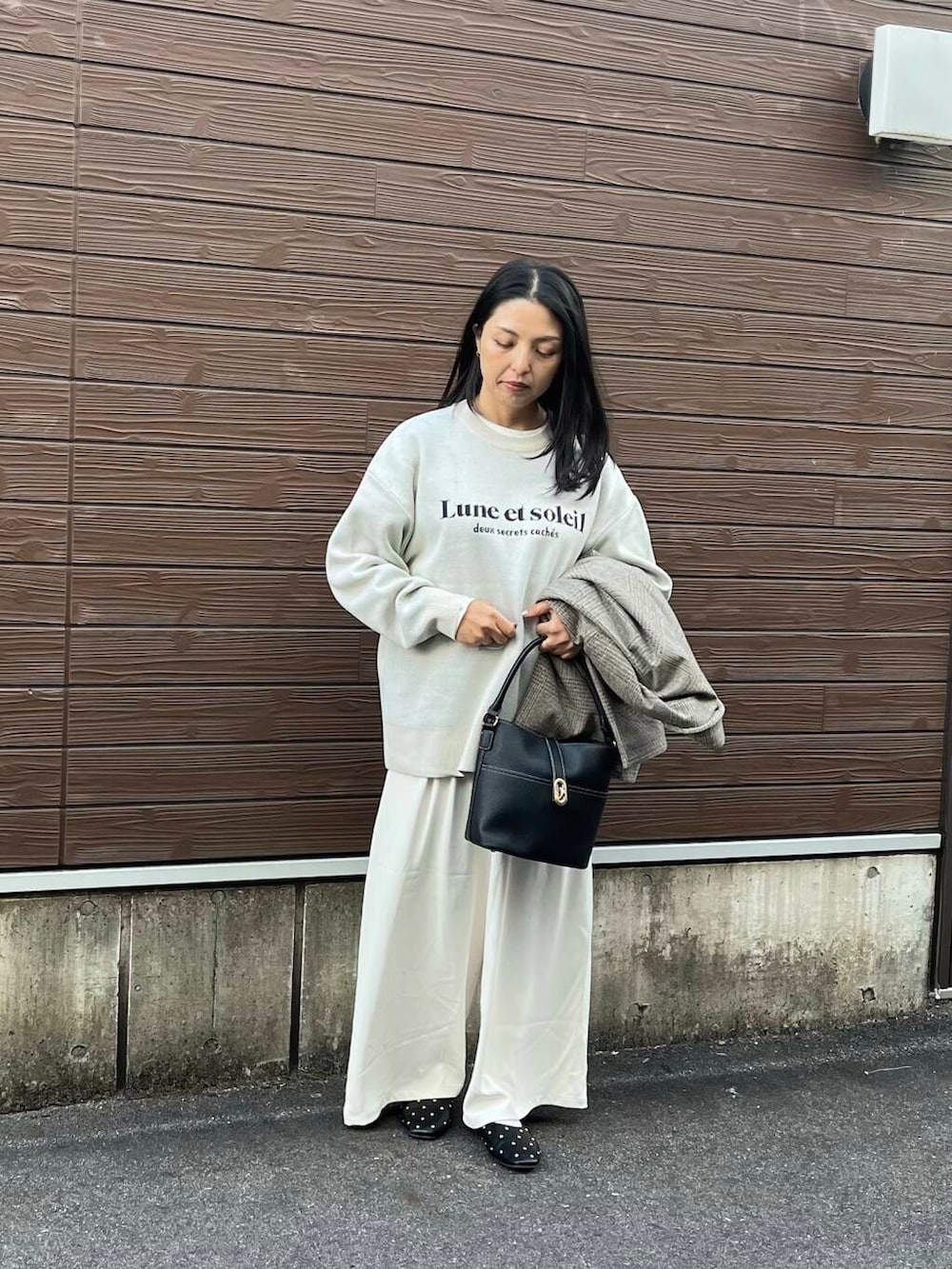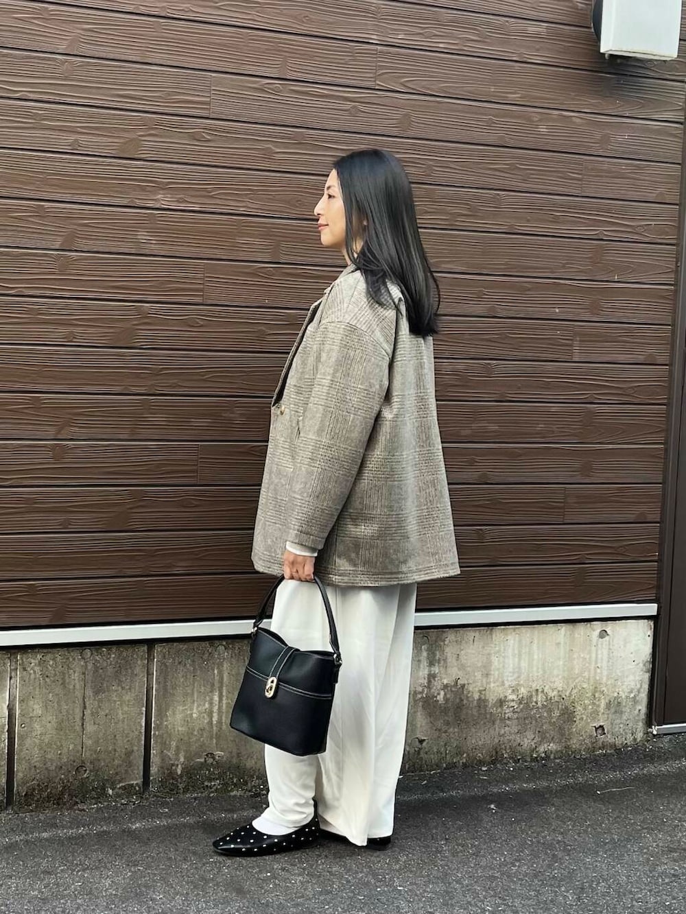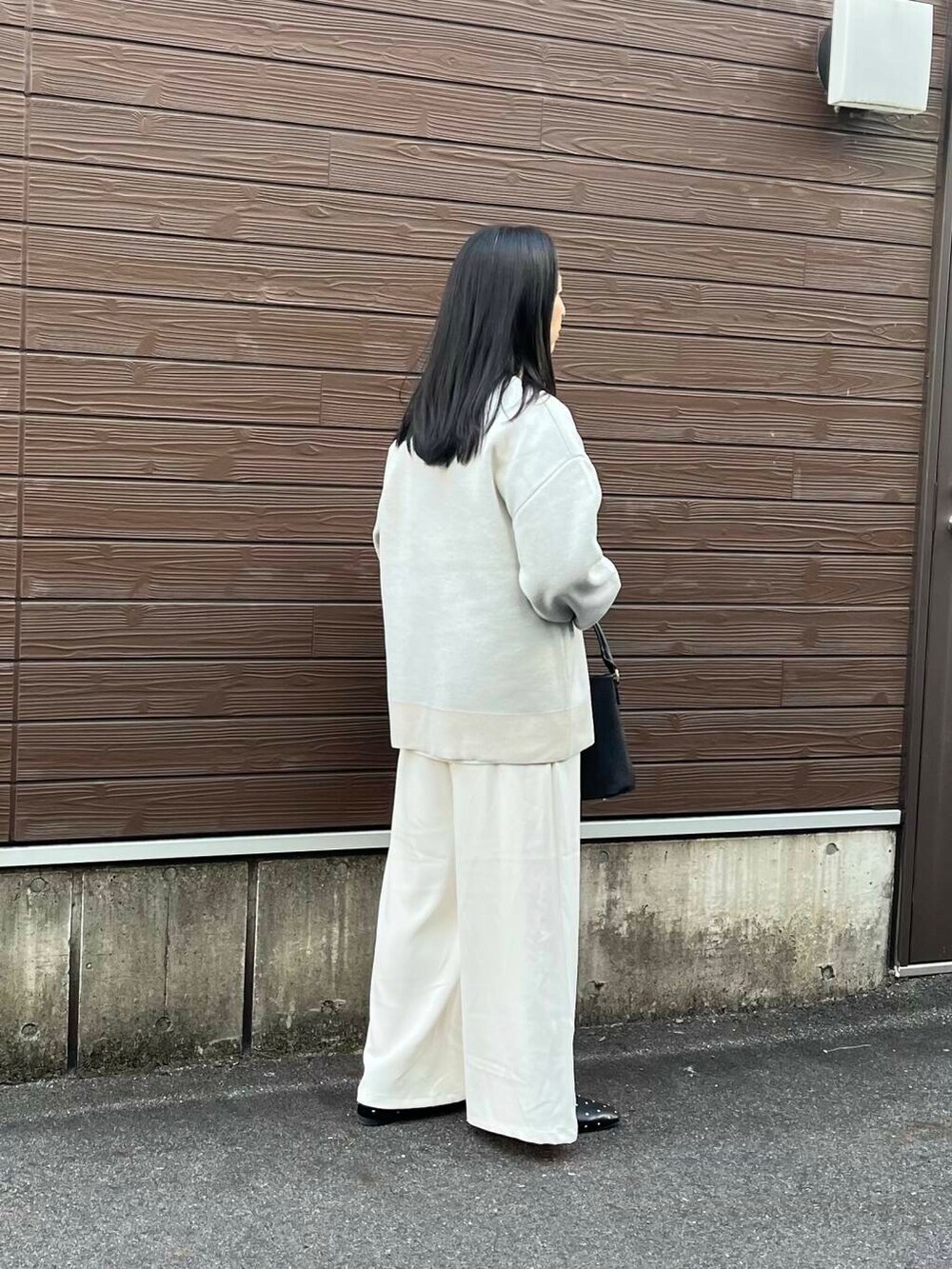 ワイドパンツは落ち感ある生地でさらりと