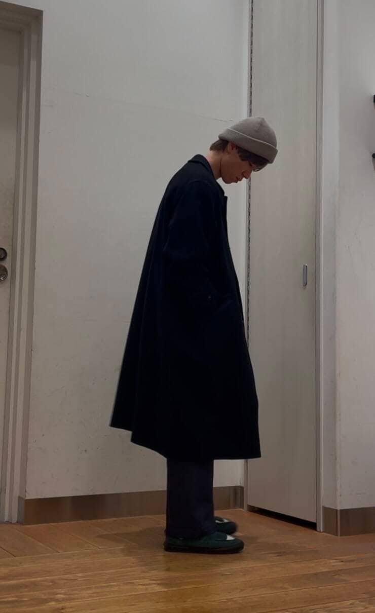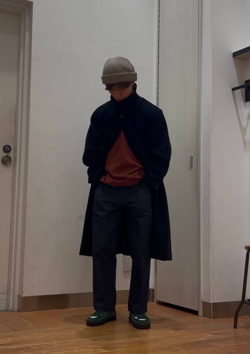 今回はインナーのニットに差し色を入れ、FOXのニットキャップでカジュアル要素を強めてみました。