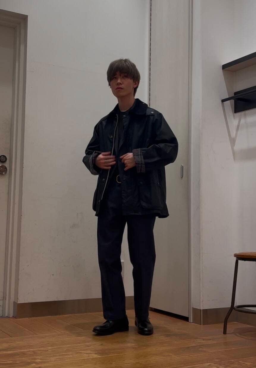 チェックのジャケットとオリーブカラーのハイゲージニットでカジュアルさを出しながらも、ブラックのビデイルで引き締まった印象を与えてくれます。