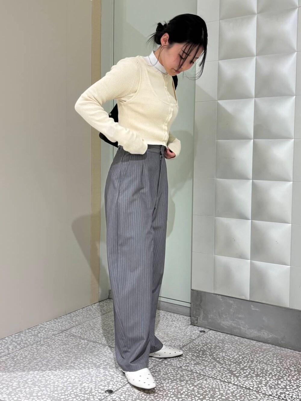 細いストライプで縦のラインがでるのでスタイルアップ効果◎