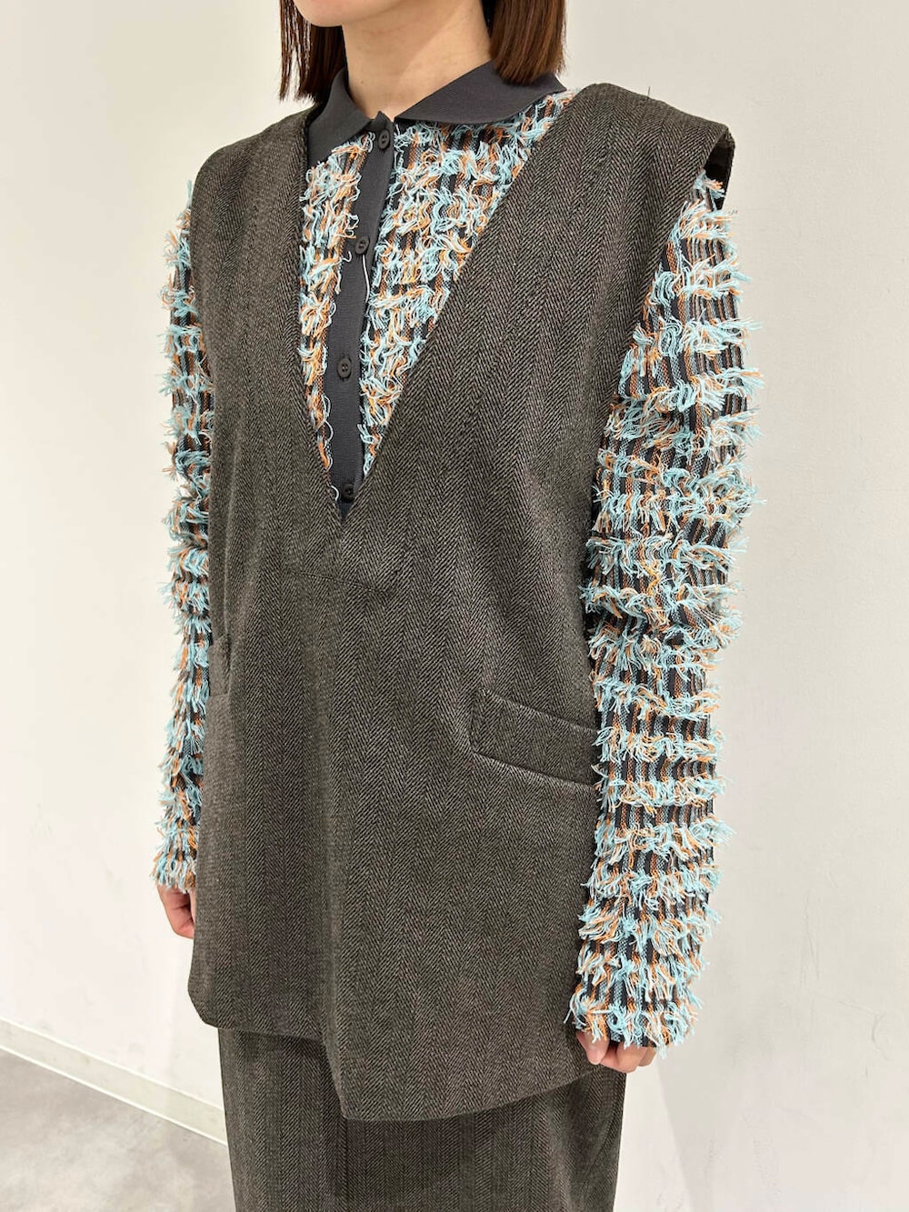 ツイードフリンジニットは色合いが目を惹く一枚です。
