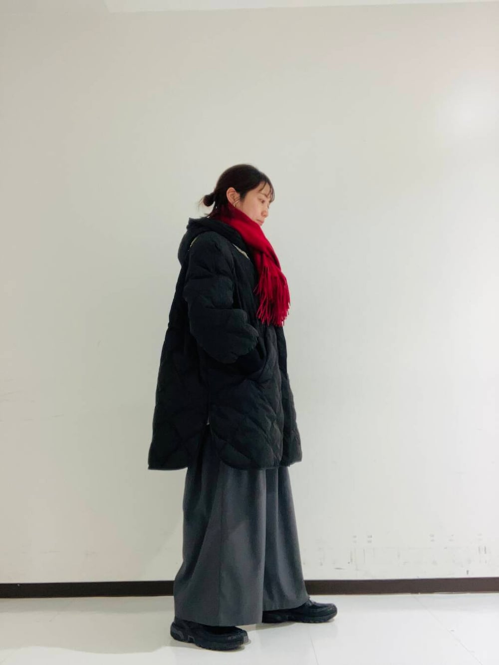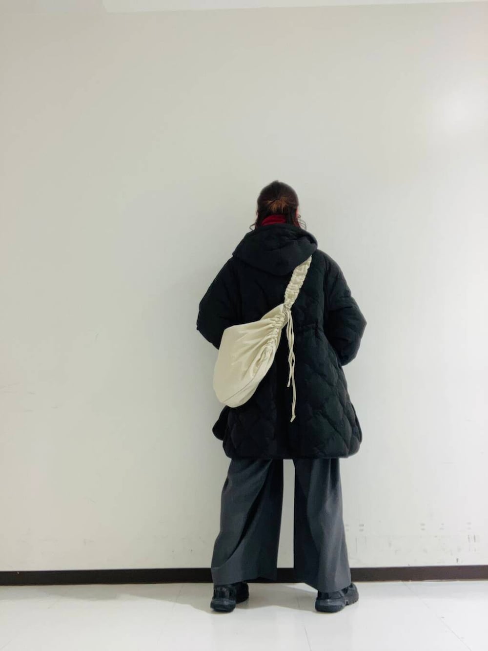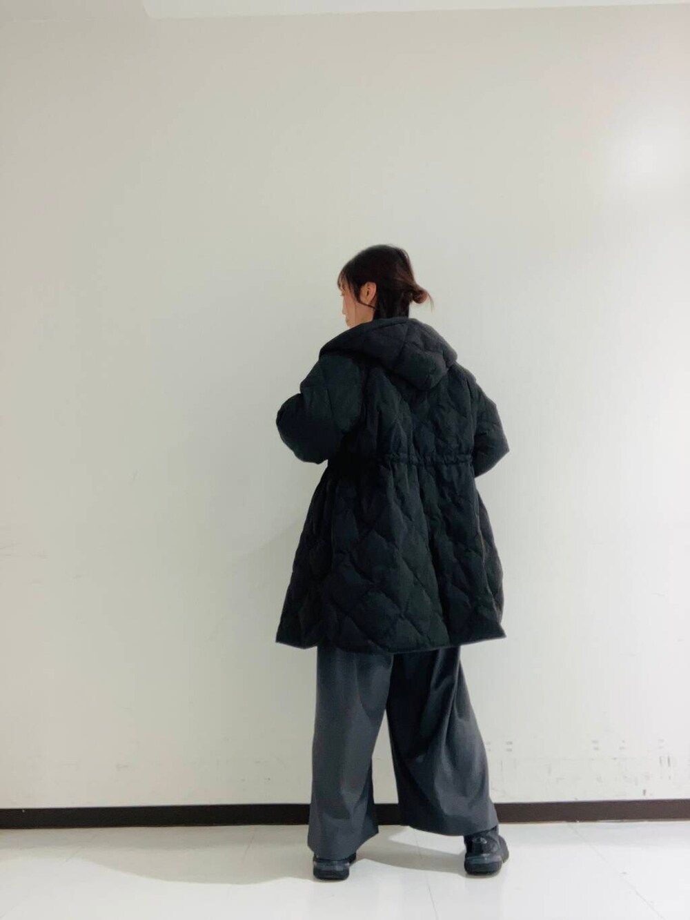アウター🧥は、キルティングドロストダウンコートになります。サイズ感はゆったりとしているので、厚めのニットでも長めのトップスでも大丈夫です。