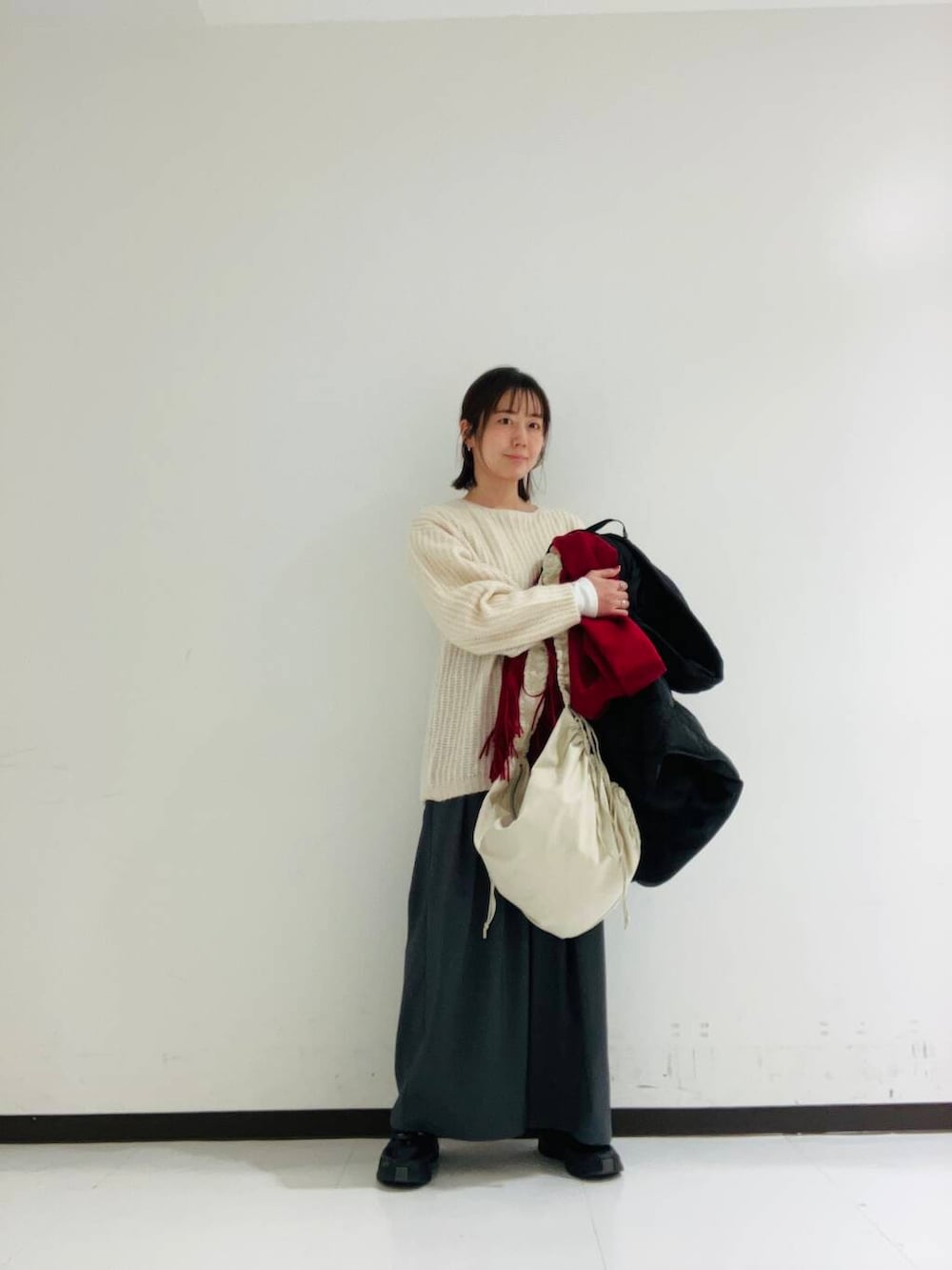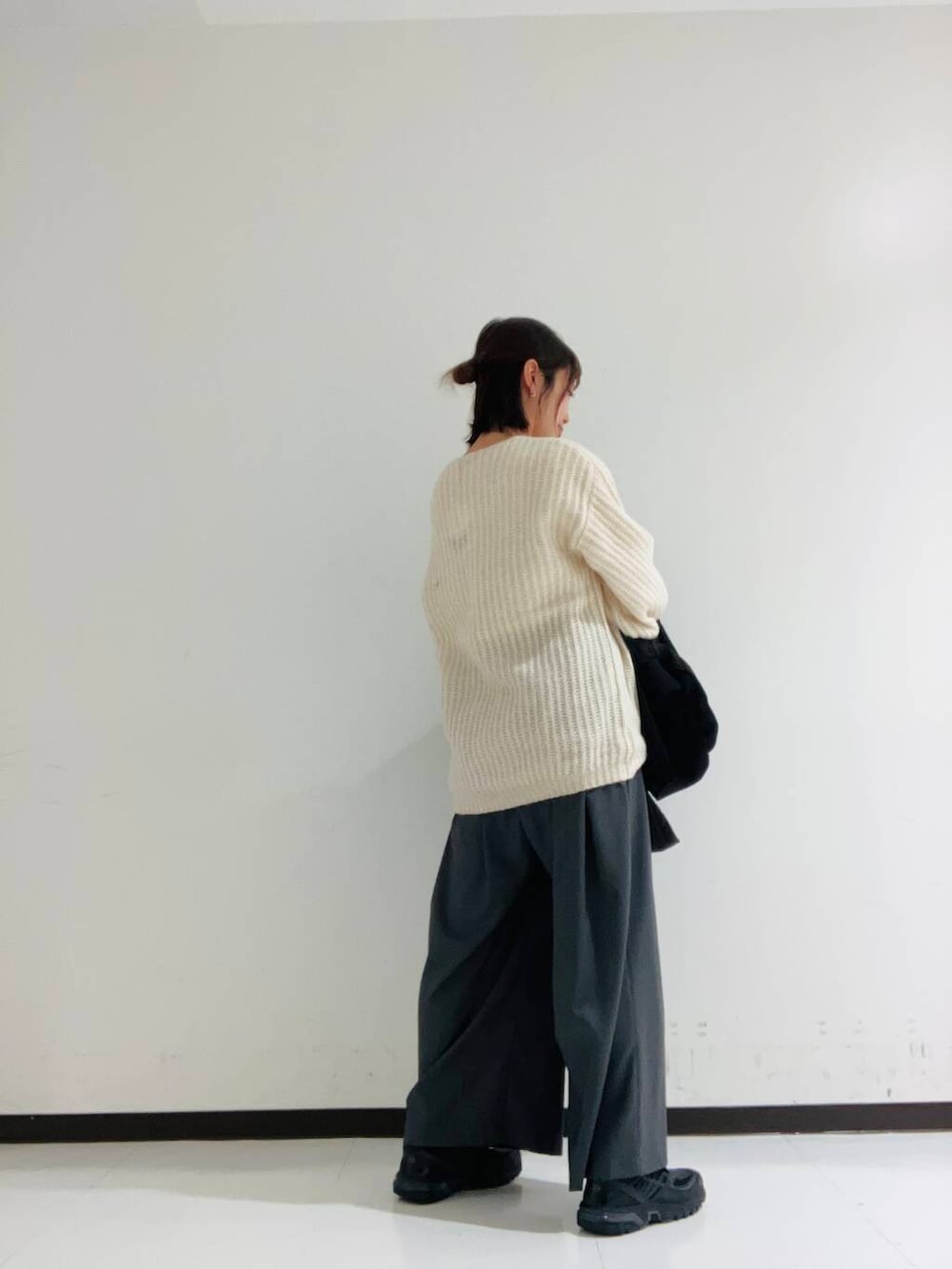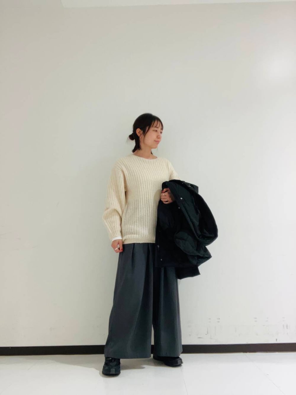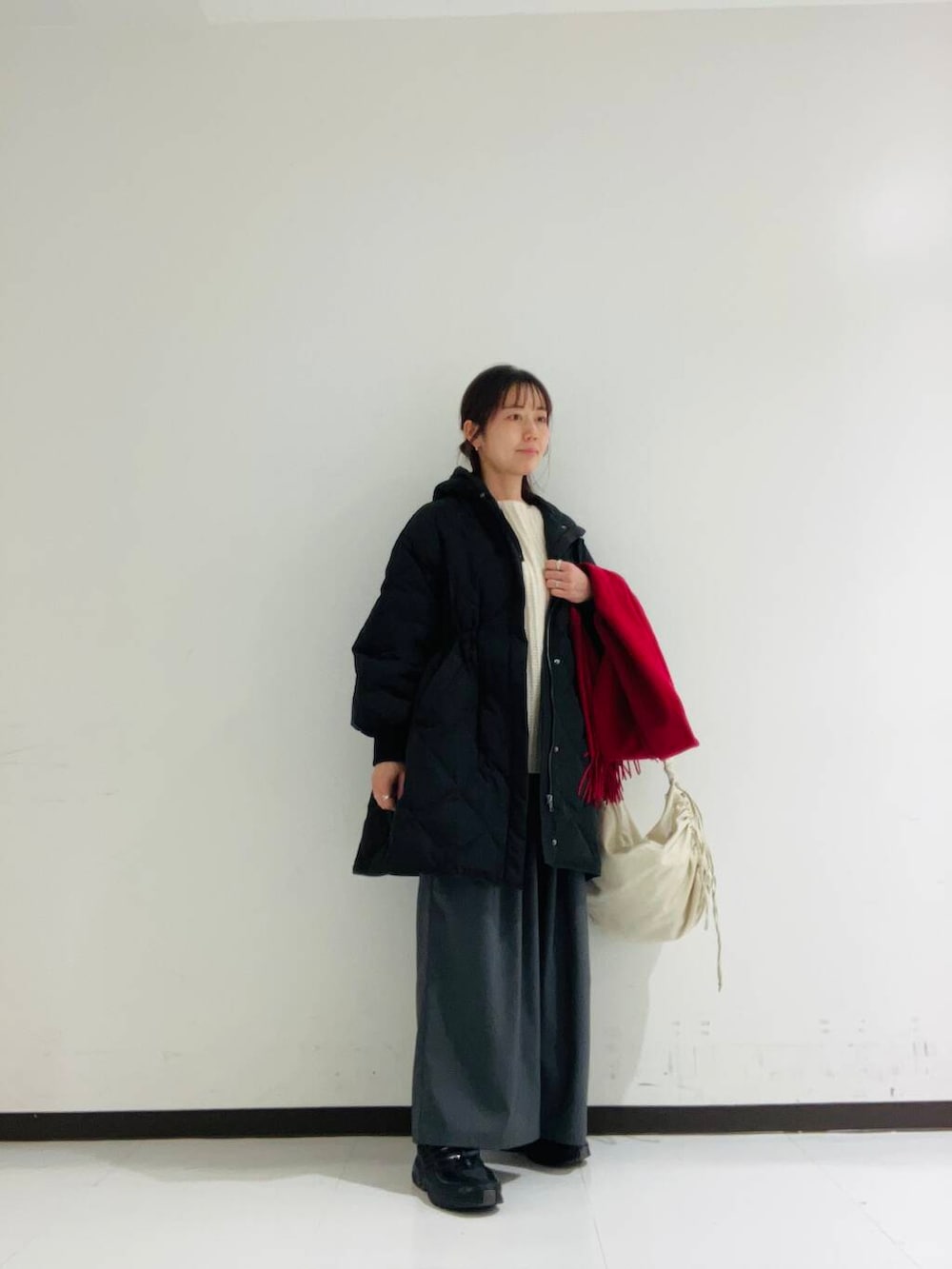 アウター🧥は、キルティングドロストダウンコートになります。サイズ感はゆったりとしているので、厚めのニットでも長めのトップスでも大丈夫です。