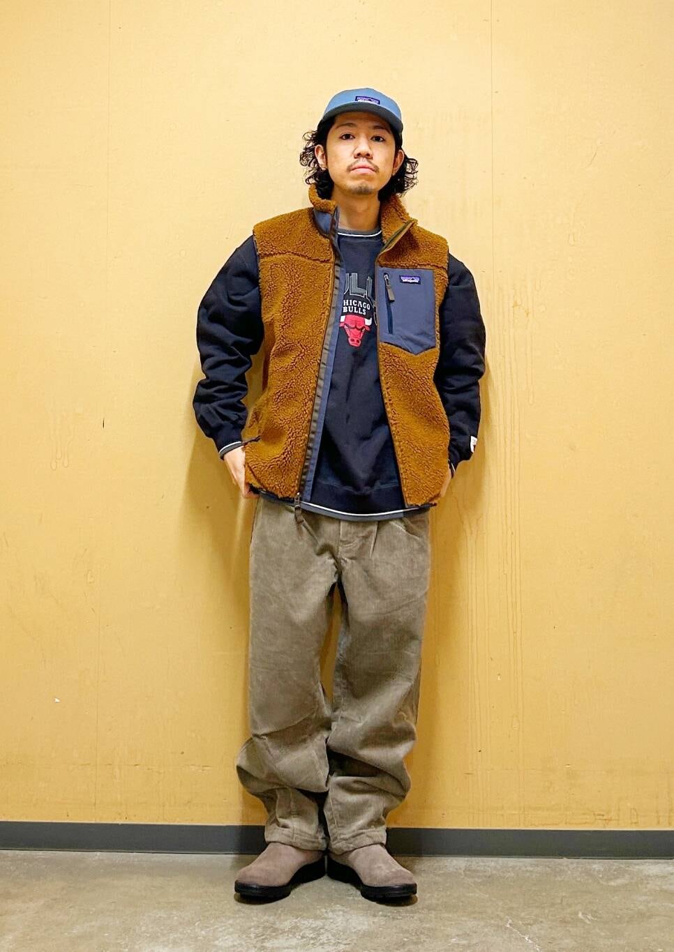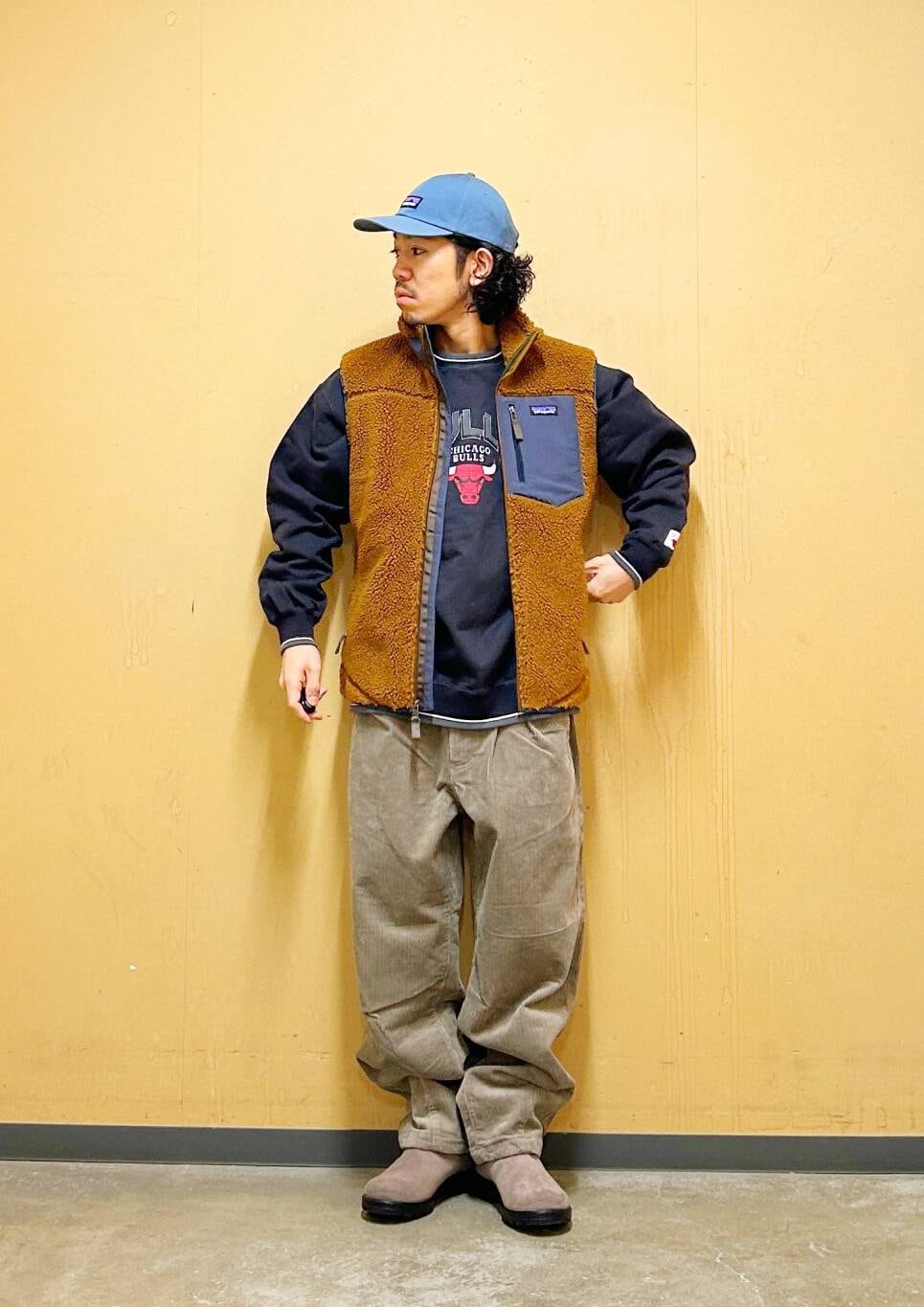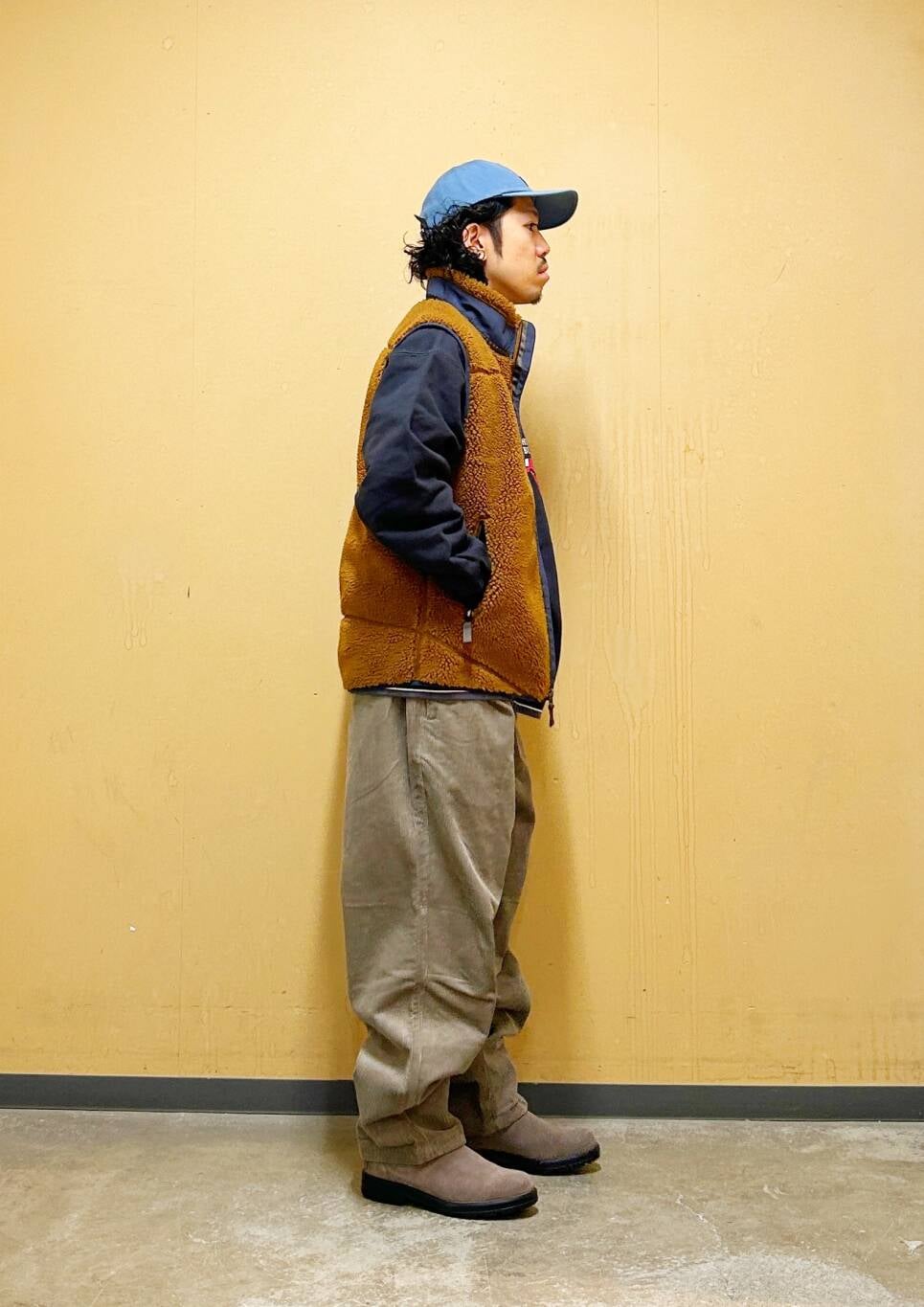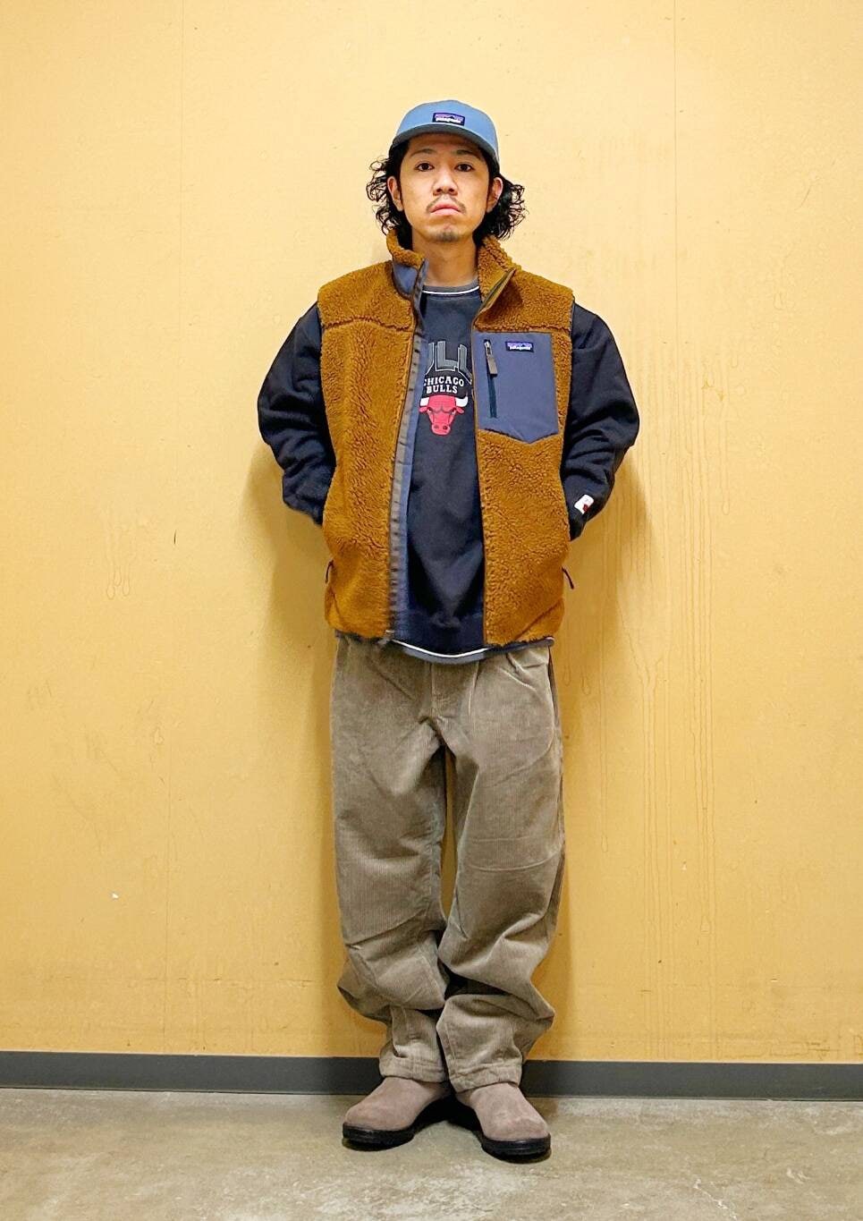 今回はpatagonia Ms Classic Retro-X Vestとコーデュロイトラウザーを使用したコーディネート。