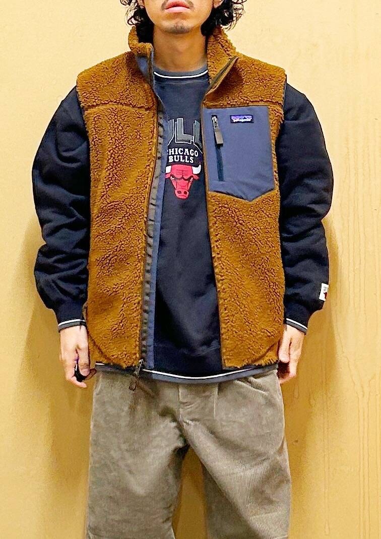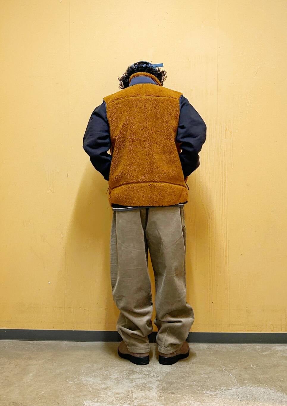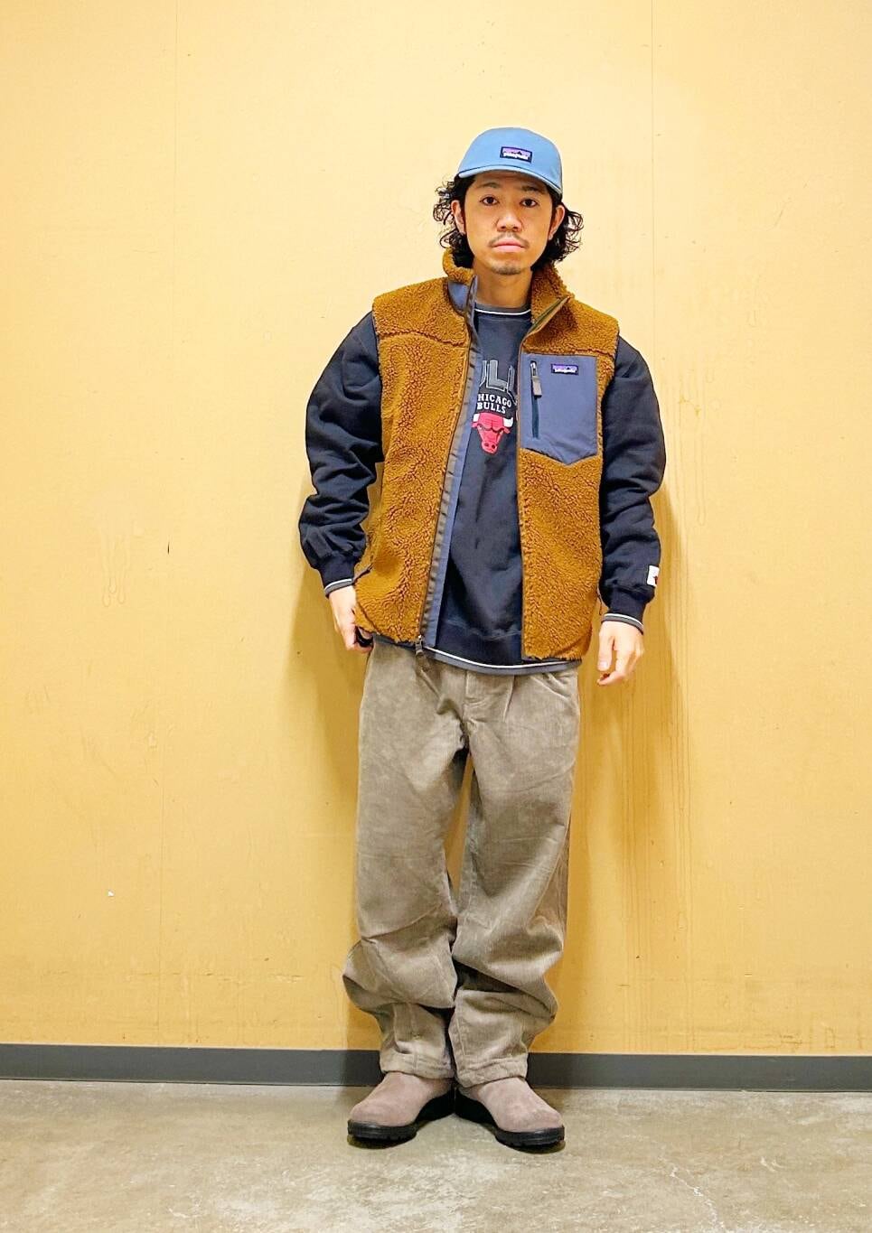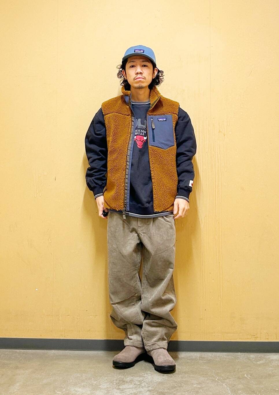 今回はpatagonia Ms Classic Retro-X Vestとコーデュロイトラウザーを使用したコーディネート。