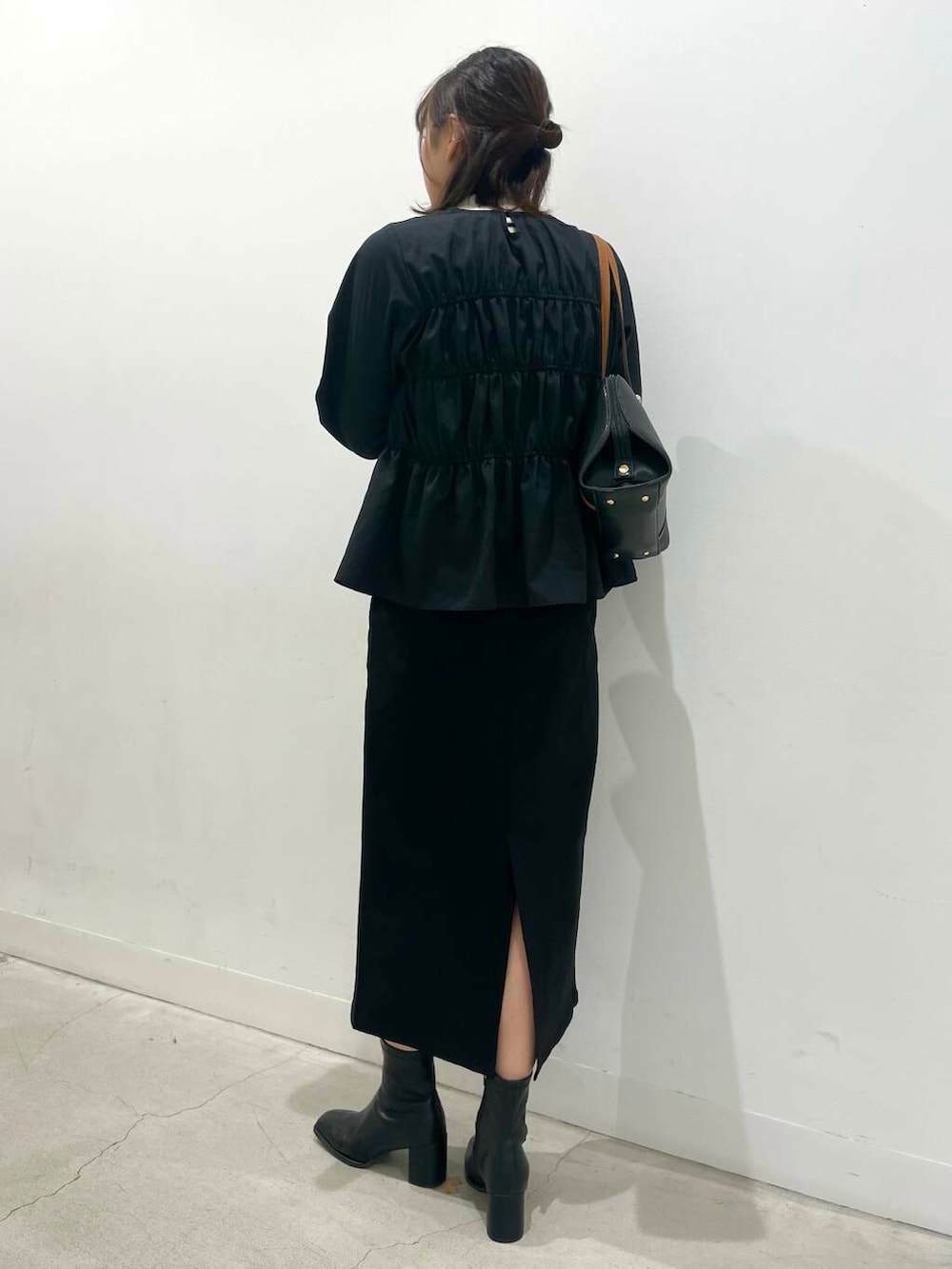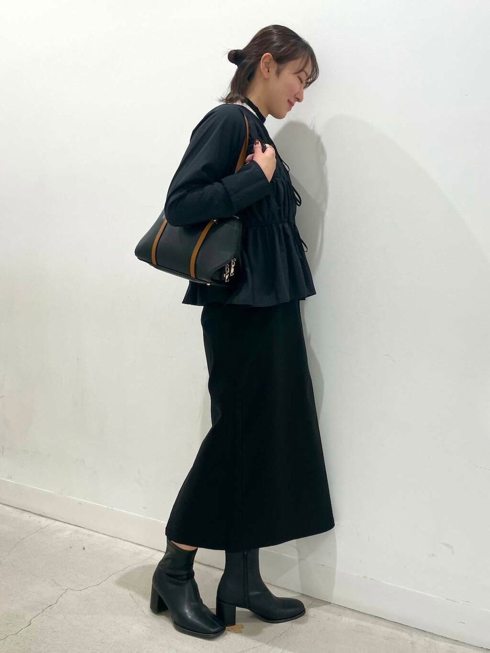 スカート、ブーツ、バッグはシンプルで綺麗めなアイテムを合わせて上品な印象に✨