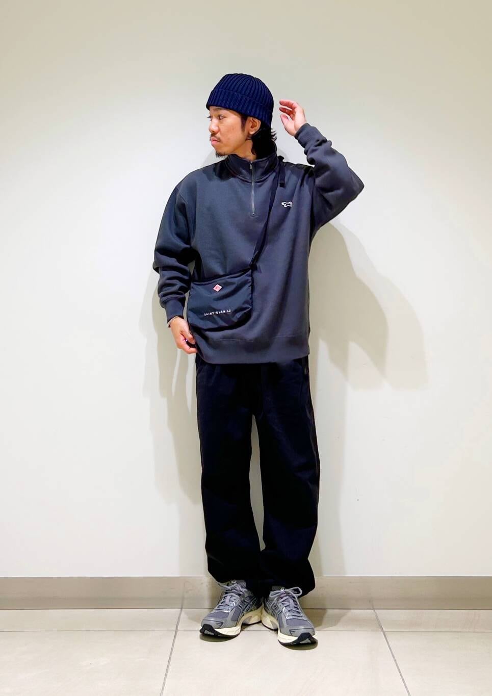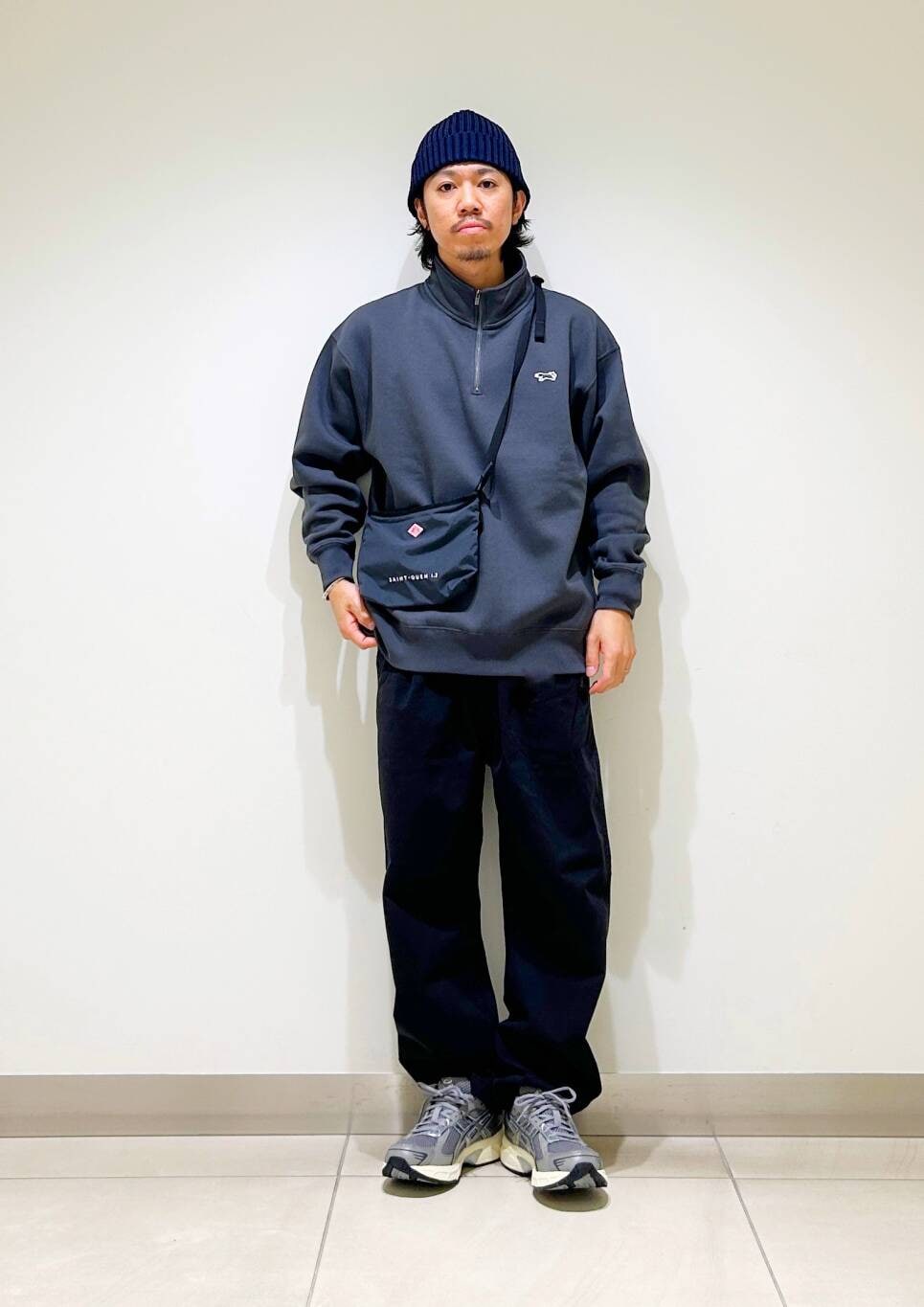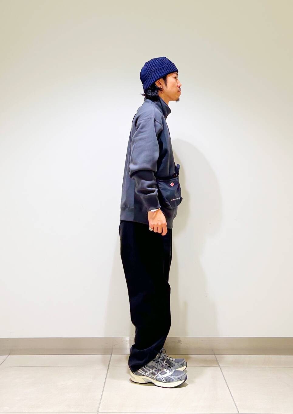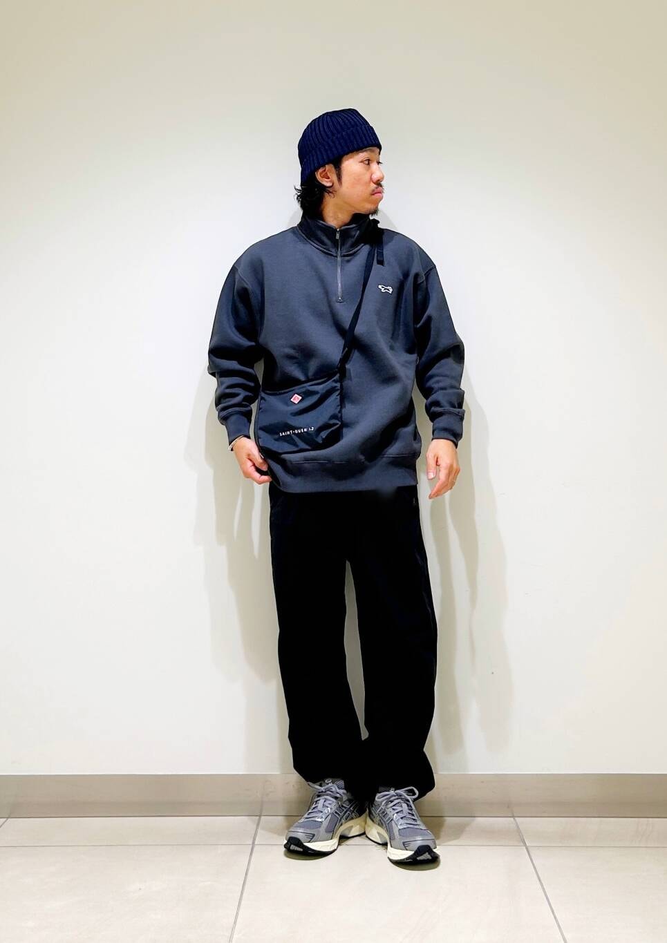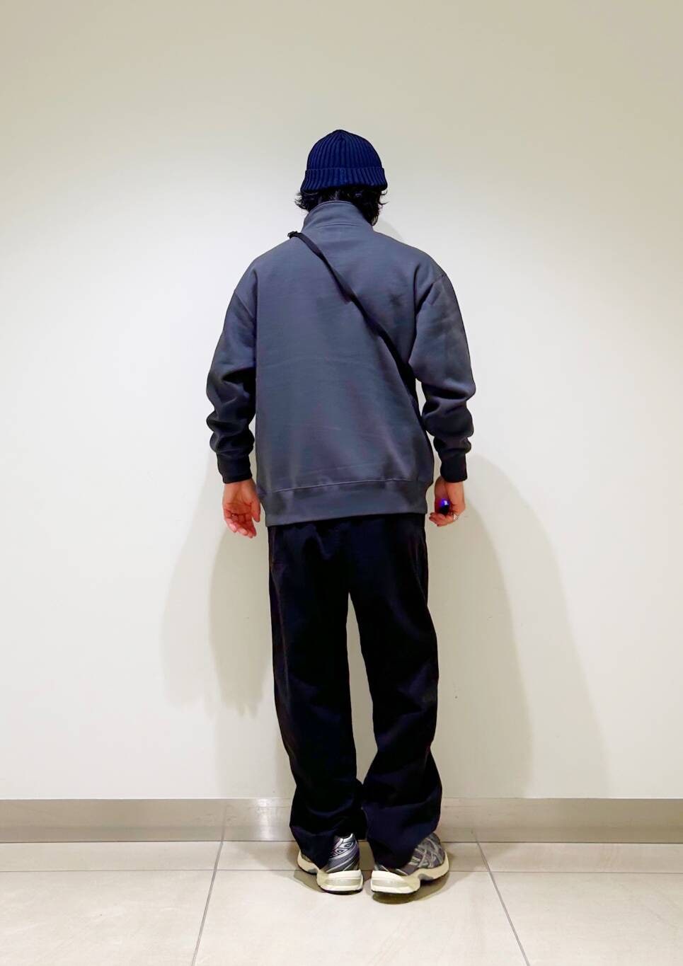 今回はハーフジップスウェットとチノトラウザーを使用したコーディネート。 "PENNEY'S"に別注をかけたハーフジップスウェットです。