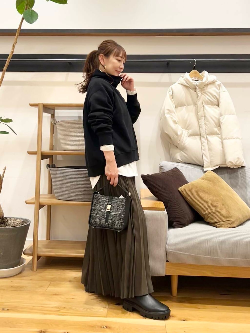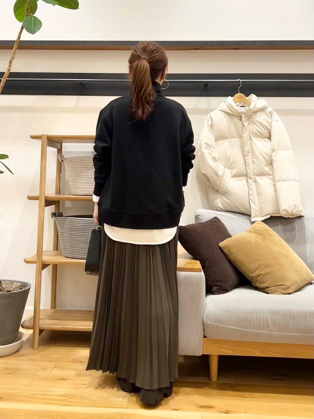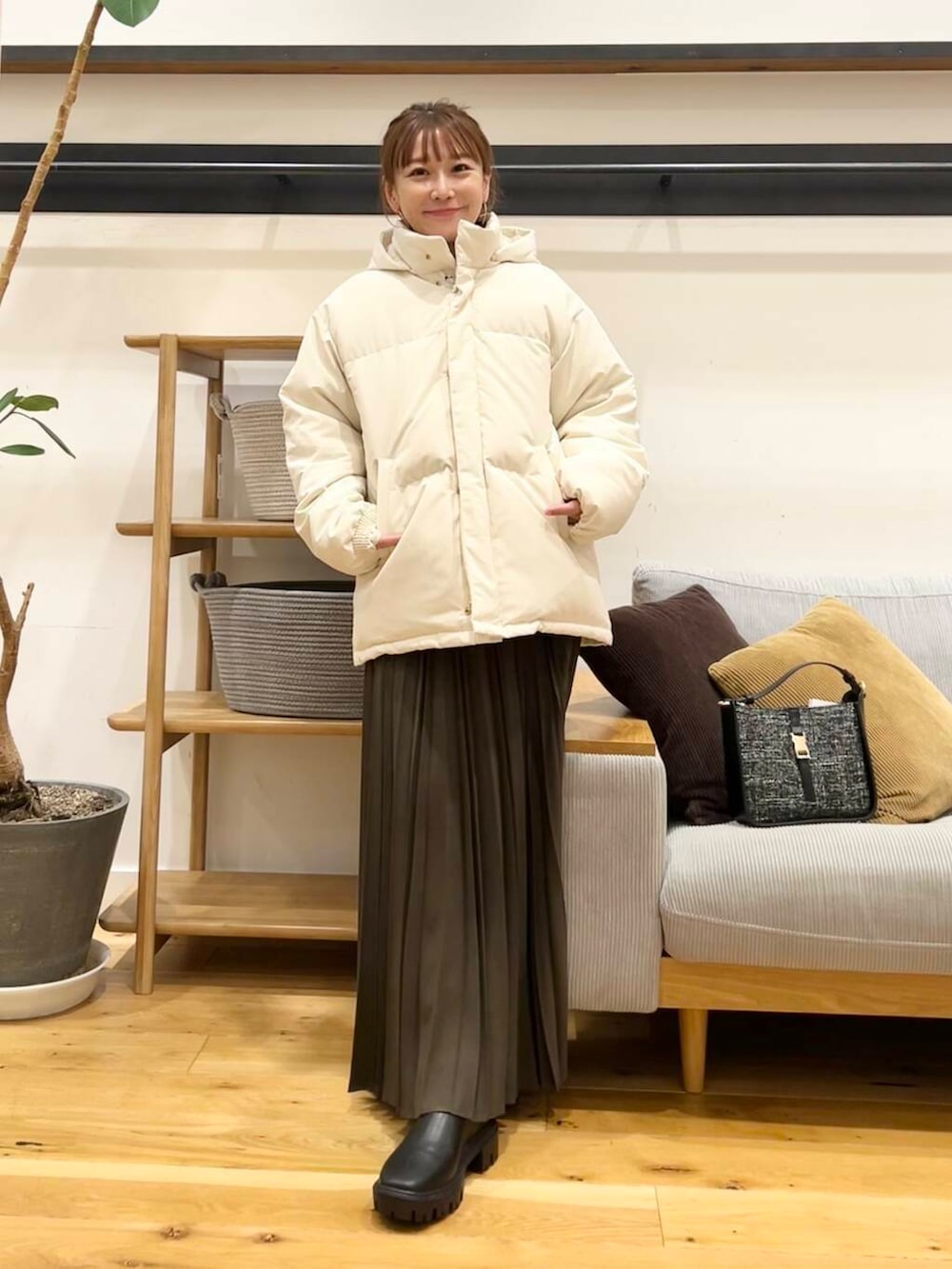 ツイルプリーツスカートのカーキブラウンを合わせてます。