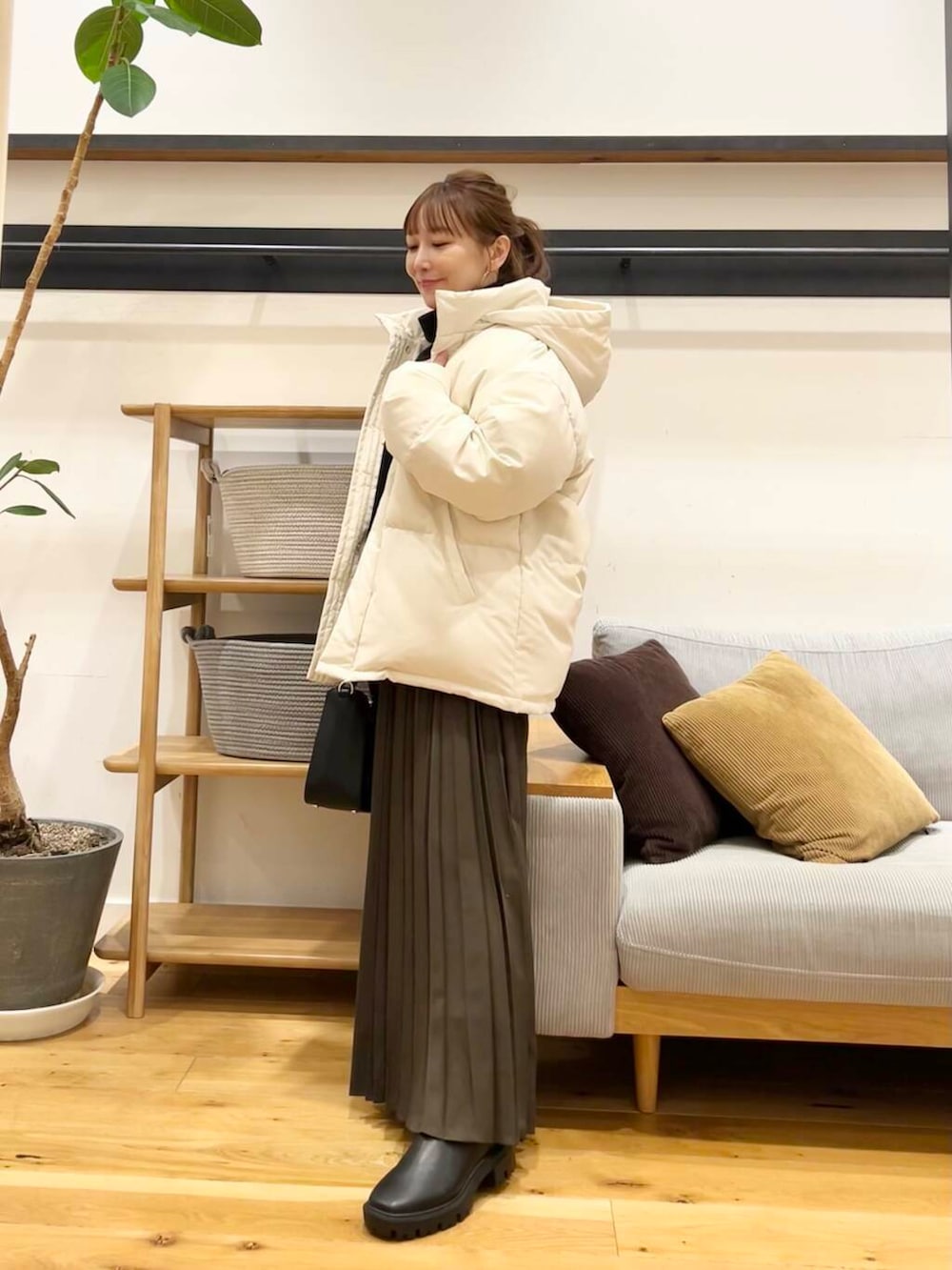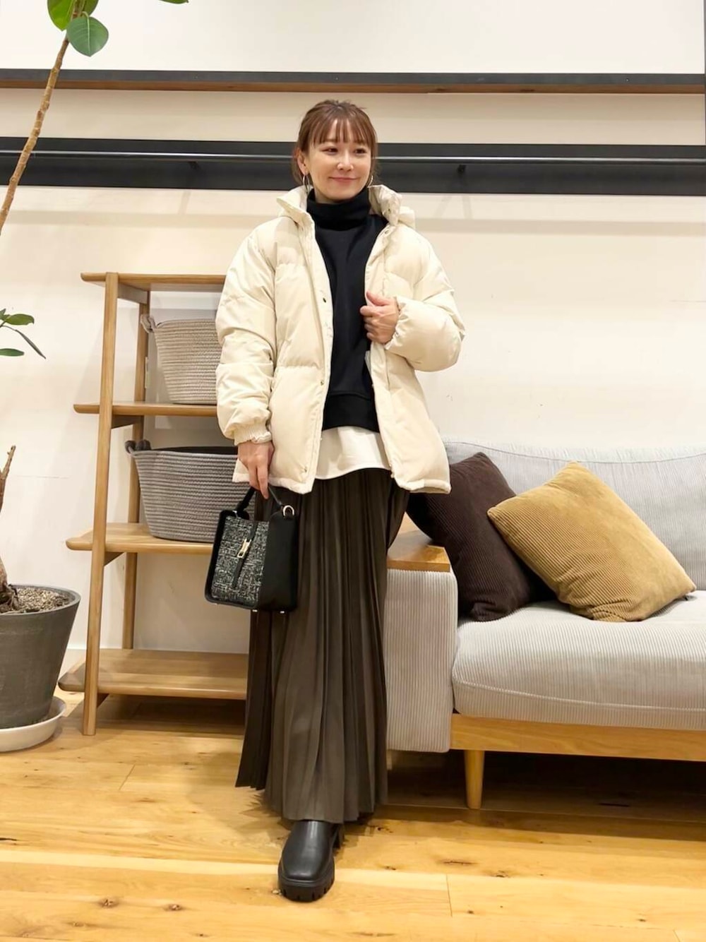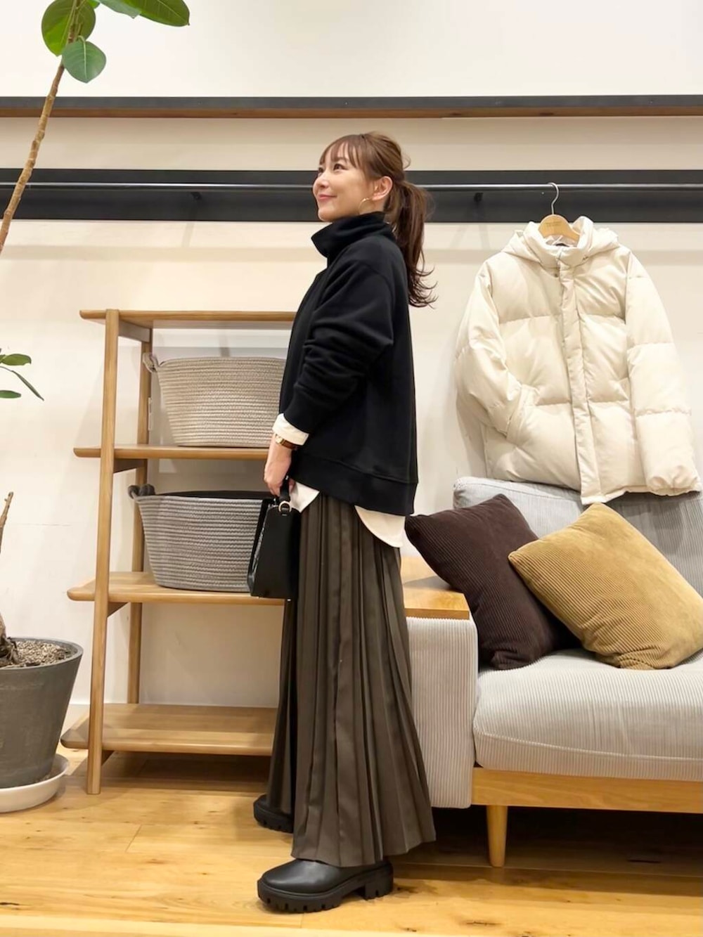ツイルプリーツスカートのカーキブラウンを合わせてます。