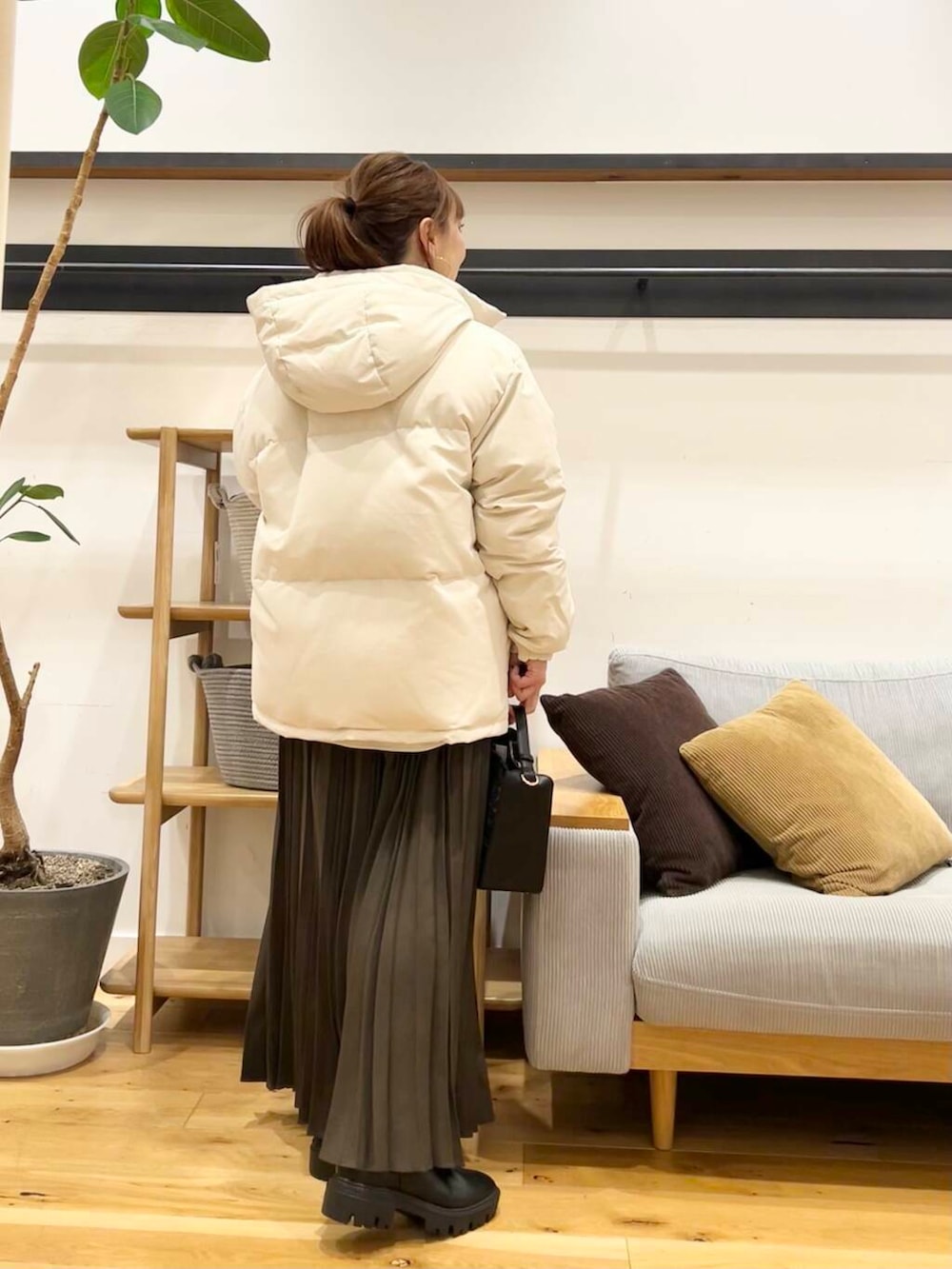アウターにはグリーンダウンミドルジャケットを着てます。