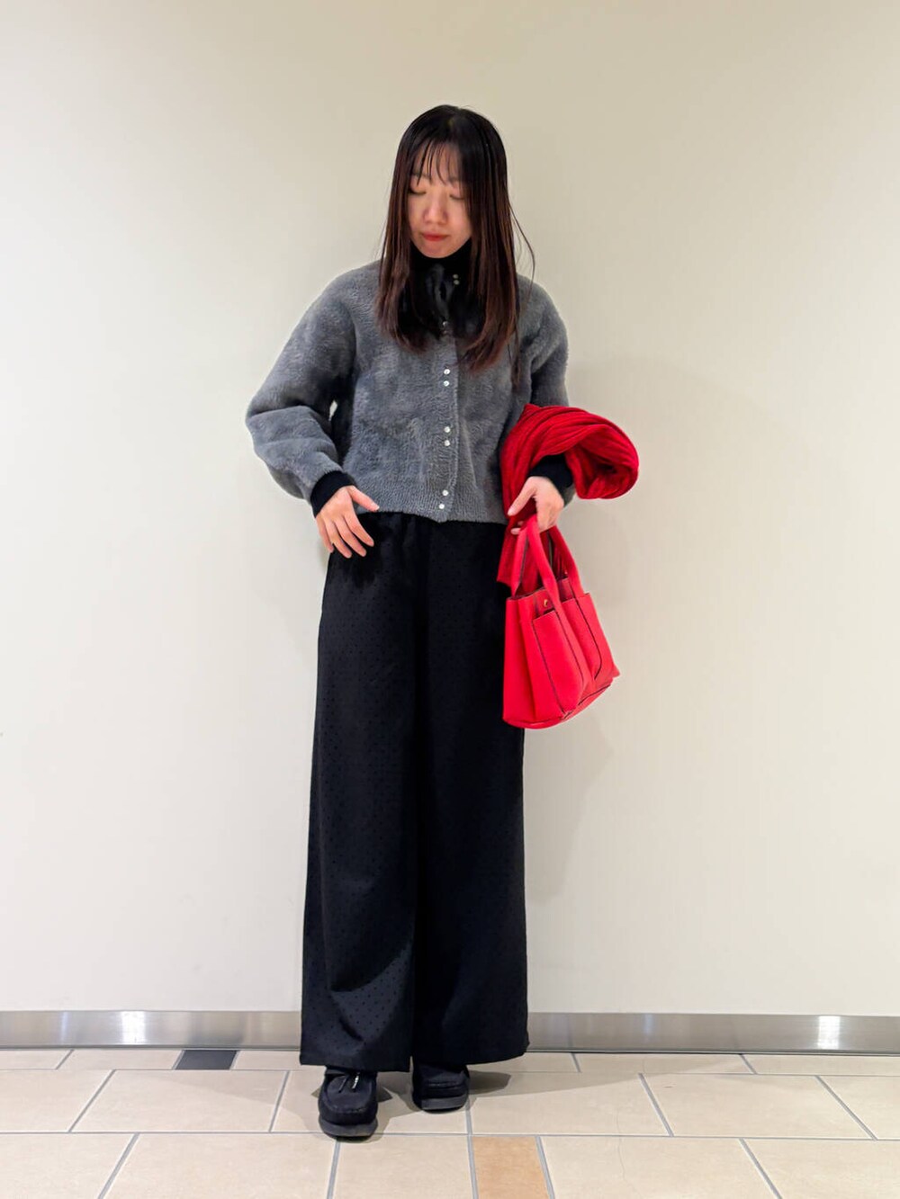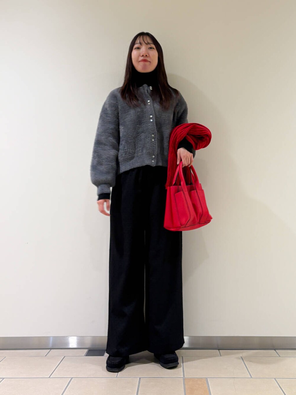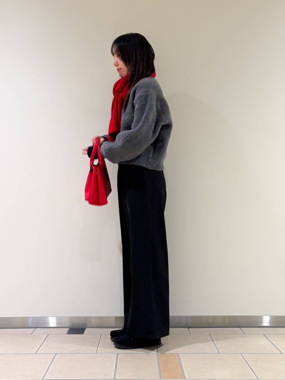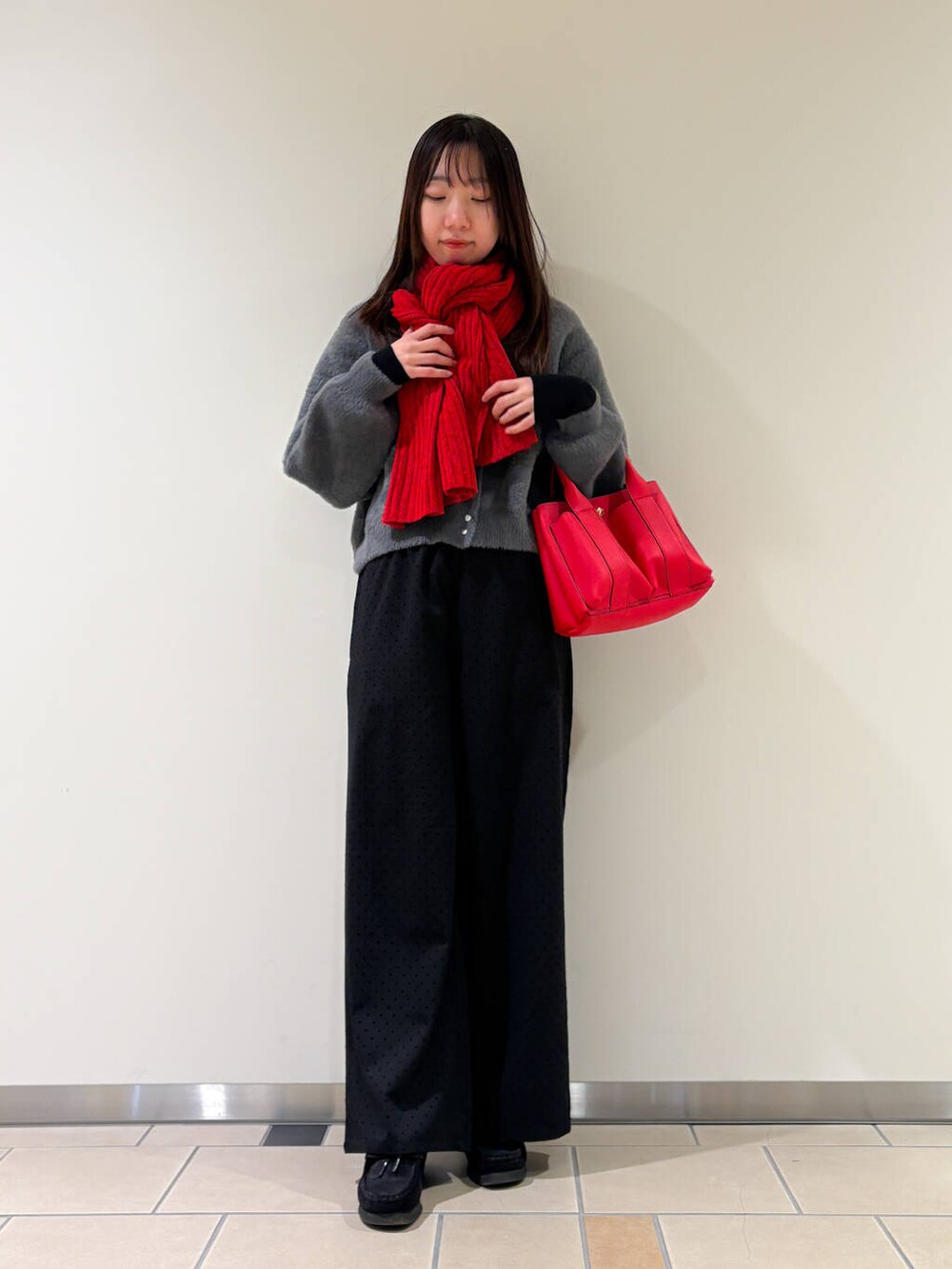 バッグとマフラーを同じ赤にして色が浮かないように合わせてみました!