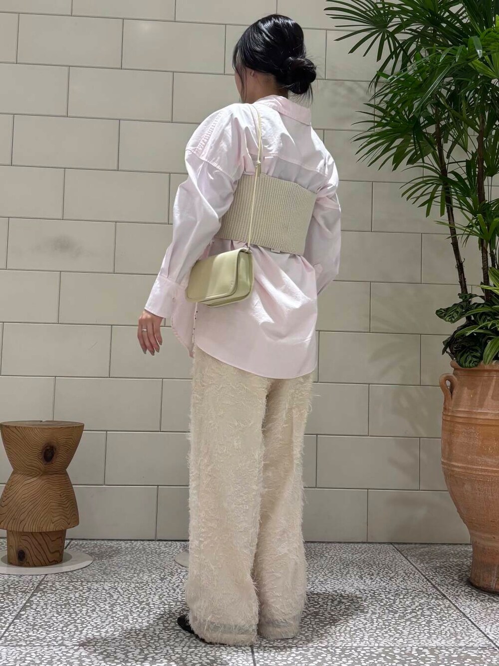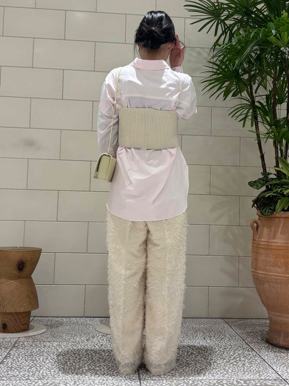 質感に特徴のあるパンツです。ウエスト部分は紐で調節できるのでとても楽に履いていただけます。丈感は身長155cmだと長めなのでソールの厚いシューズと合わせてます。
