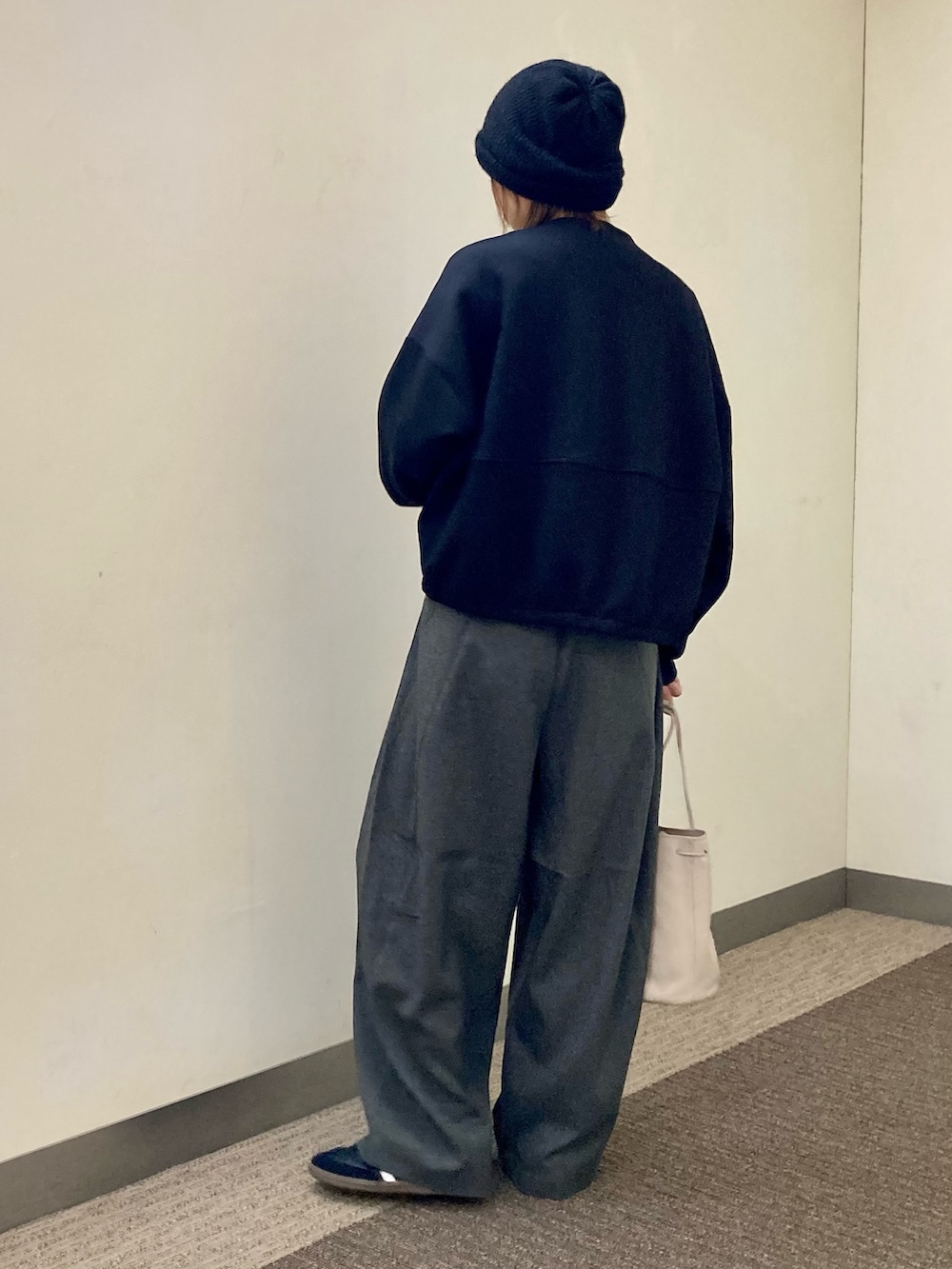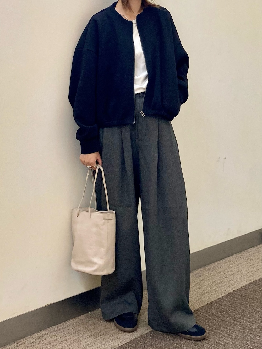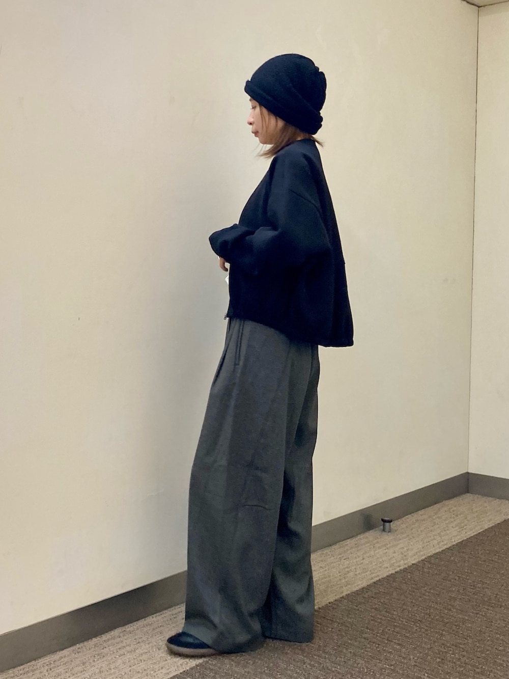 丈は長すぎないのでスカートやワイドパンツ、ワンピースの上にも羽織りやすいです!