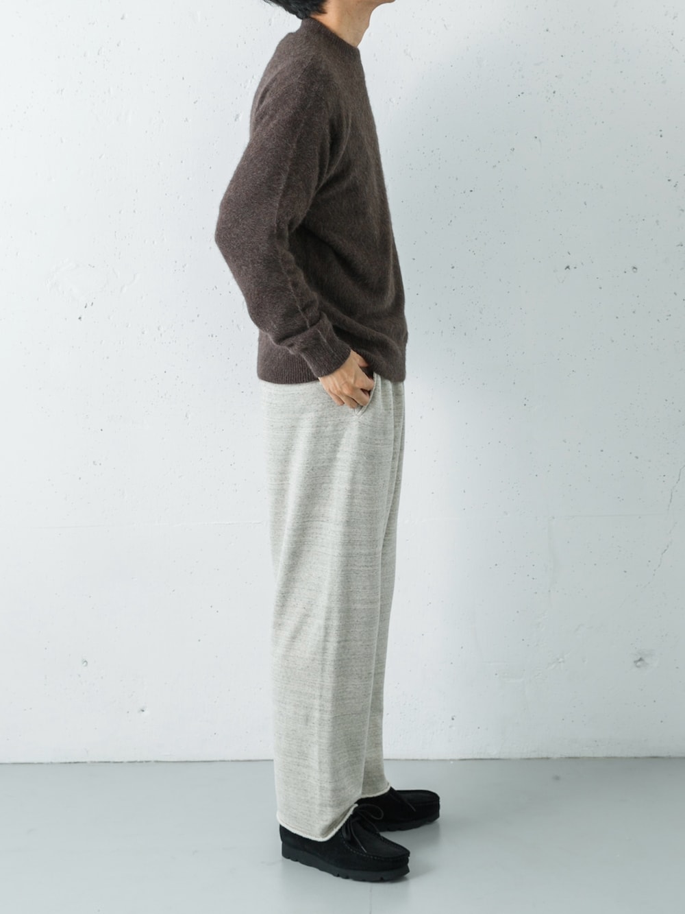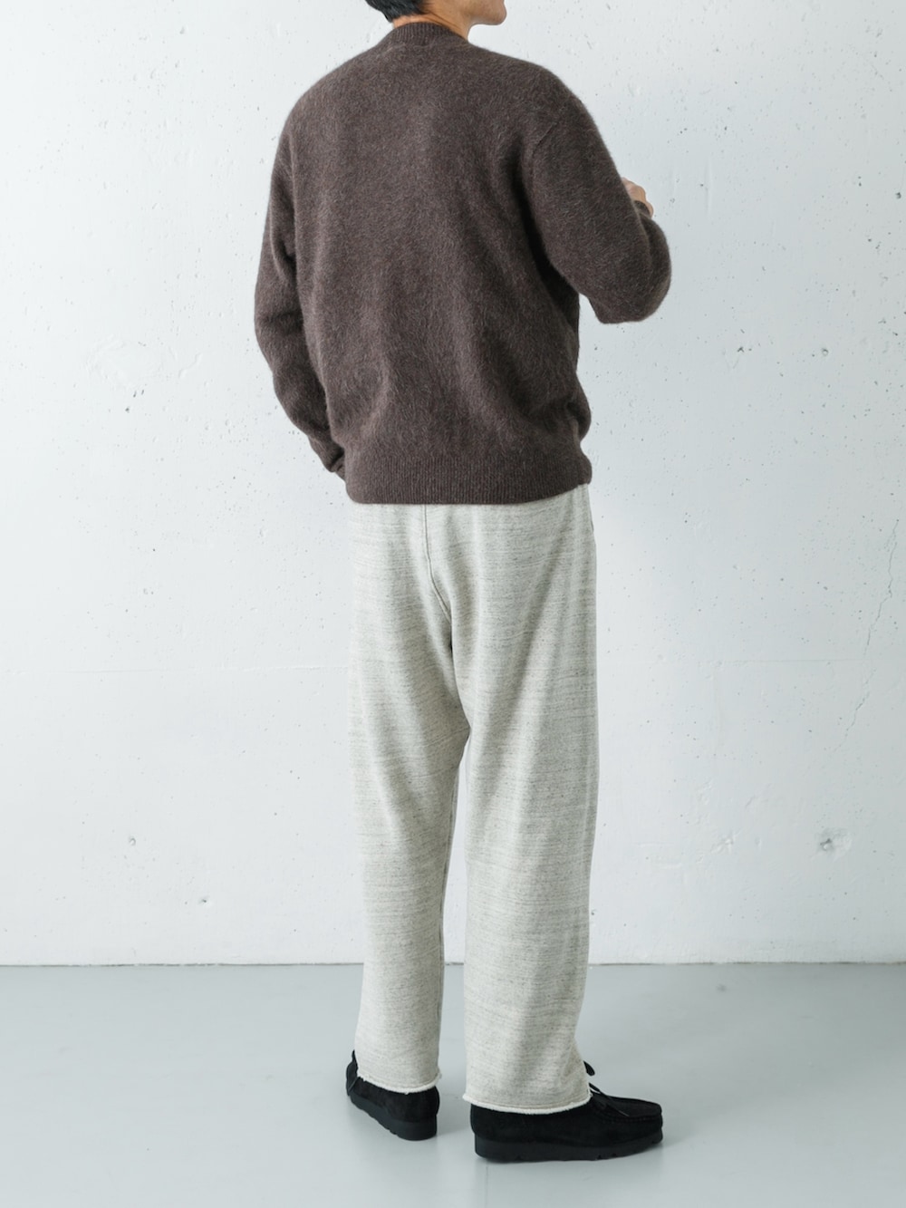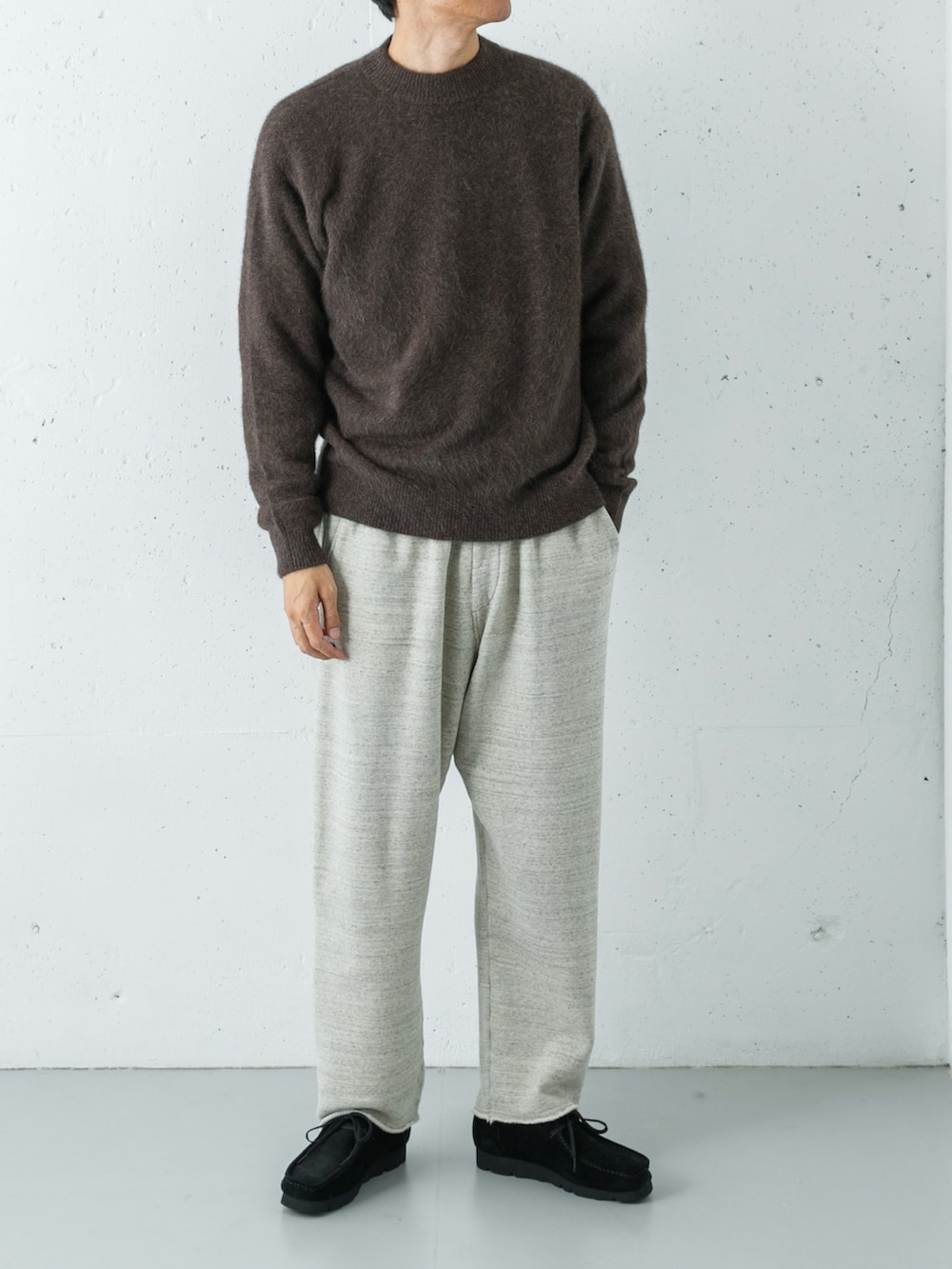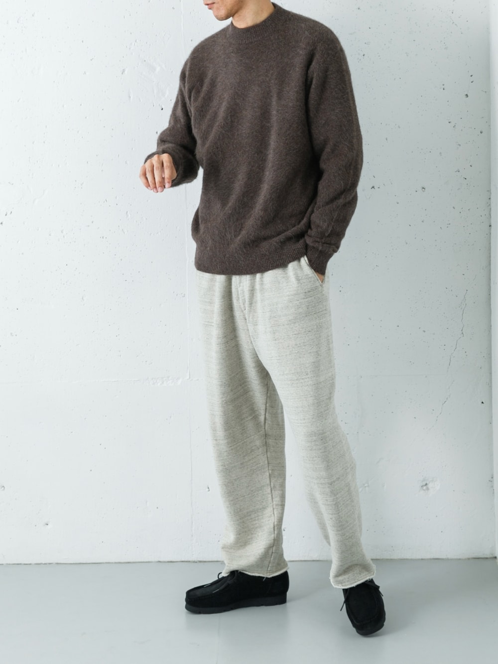 カシミヤニットの上質な風合いにスウェットパンツを合わせ、リラックス感と品の良さを両立したスタイル。