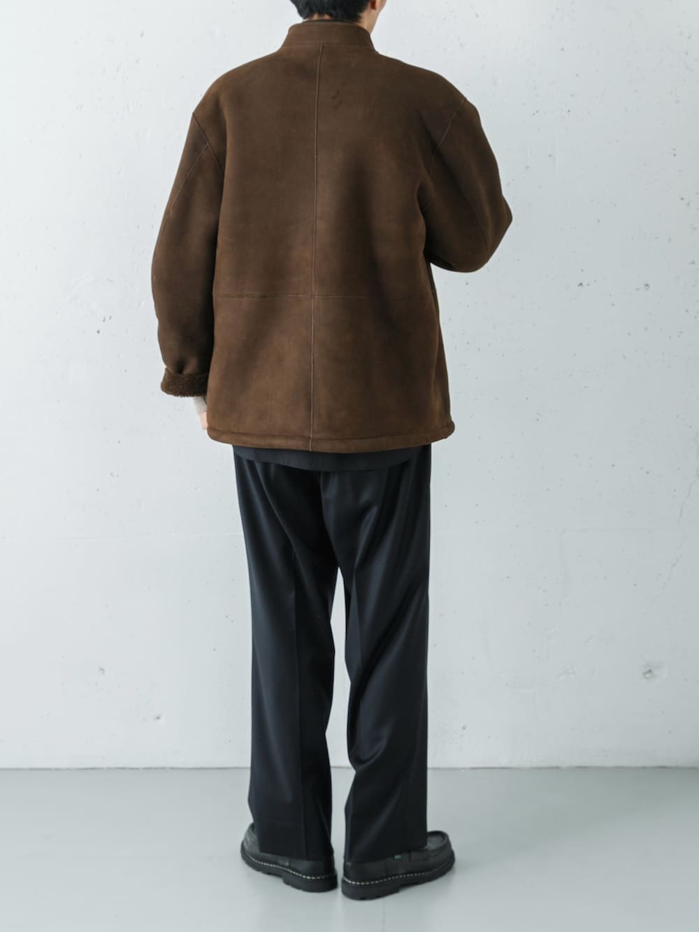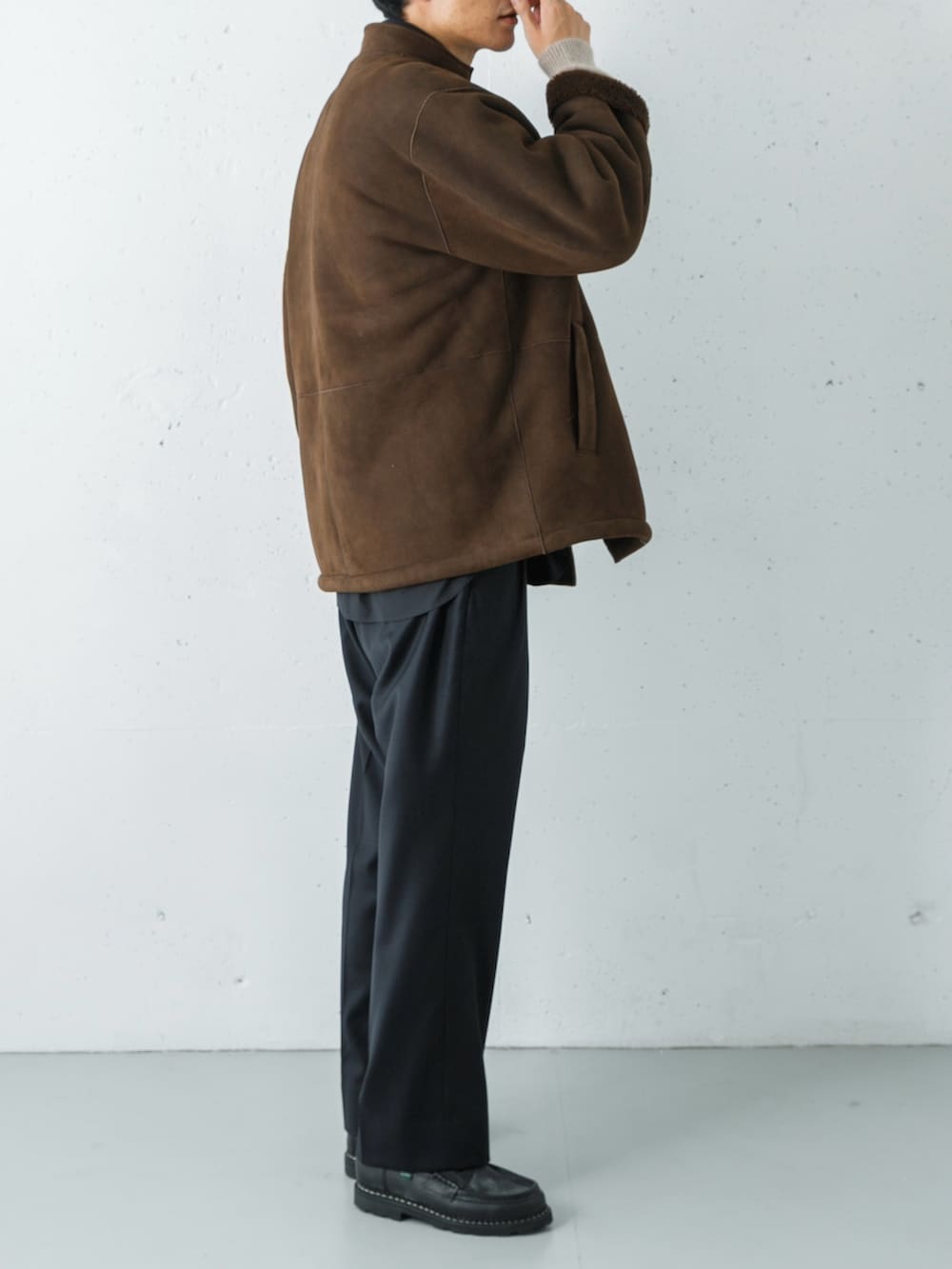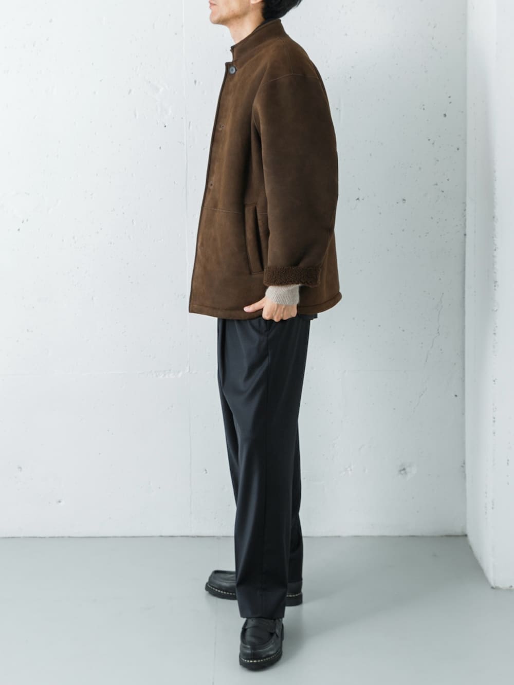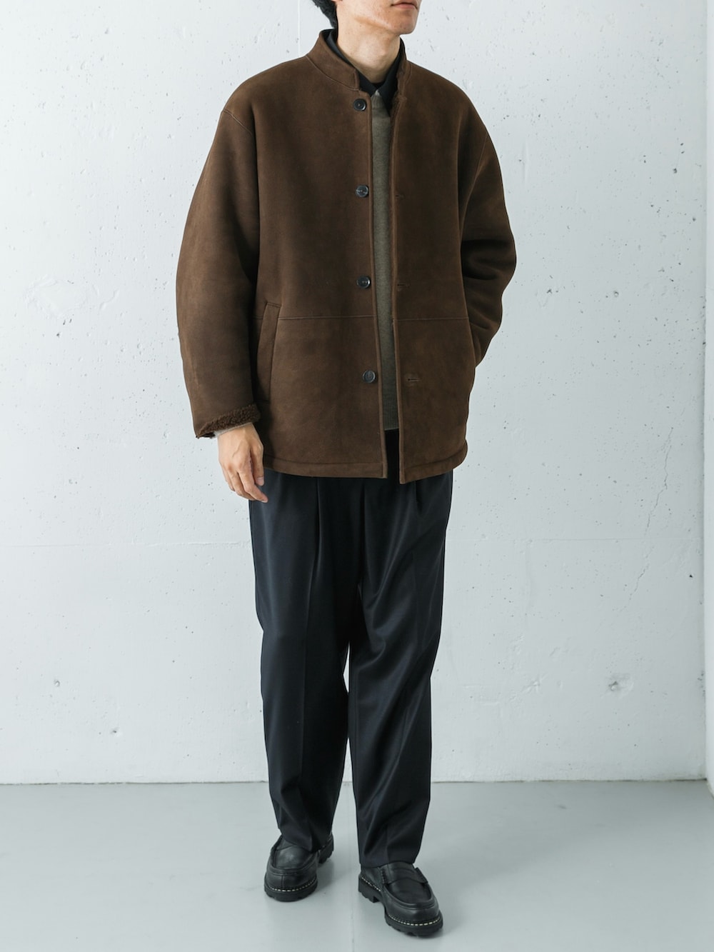 存在感あるムートンジャケットを主役に、ニットとオーバーシャツを重ねた上品なレイヤードスタイル。