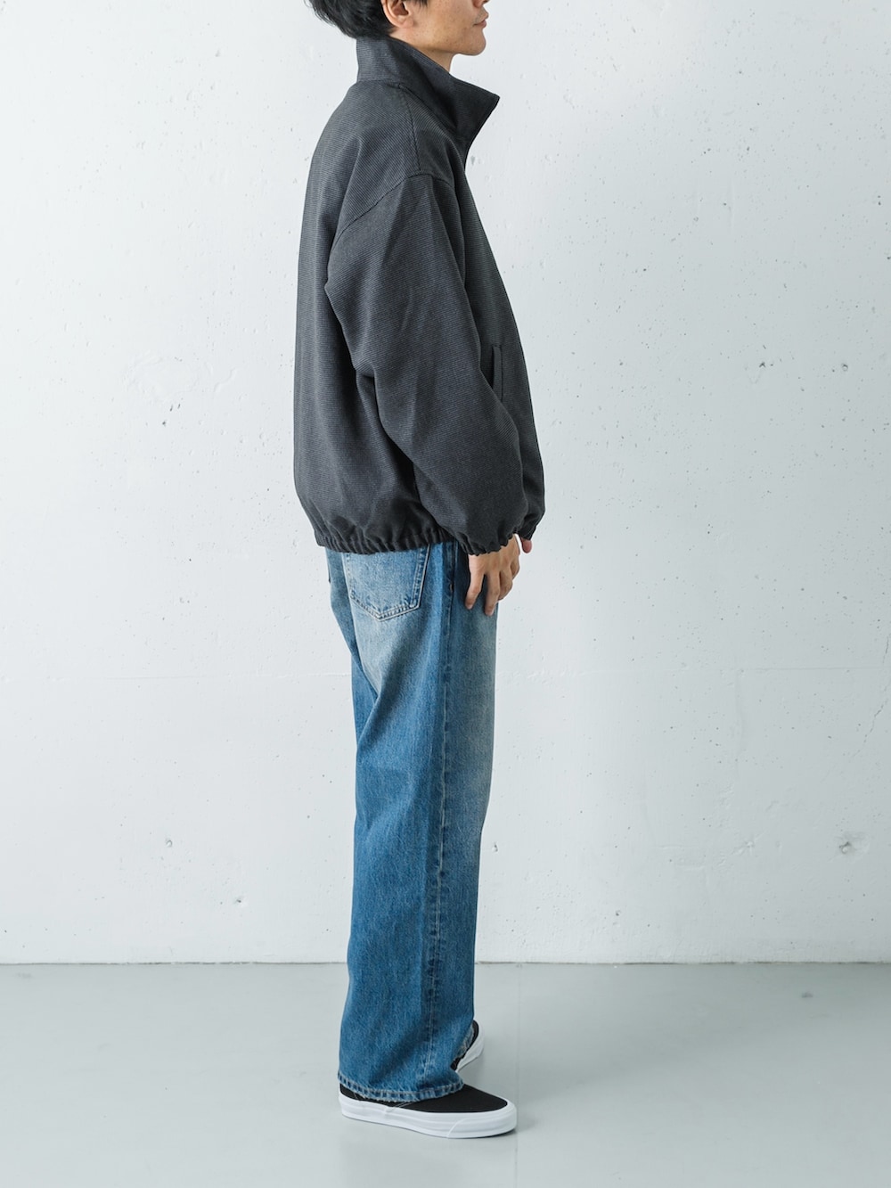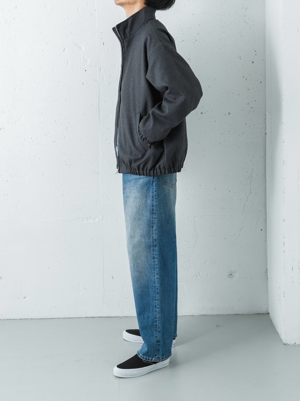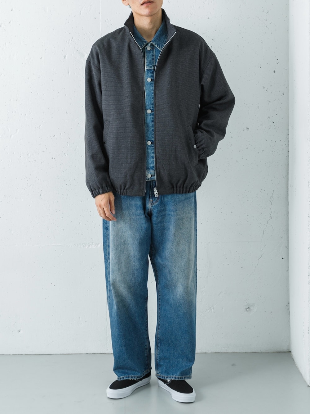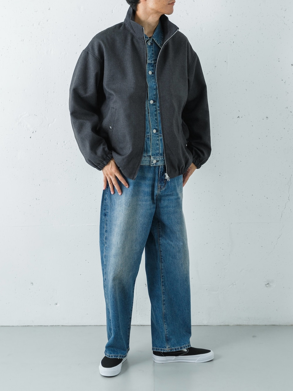 ツイードブルゾンの上品さにデニムジャケットをインナーとして重ね、同素材のワイドパンツで統一感を持たせたスタイル。