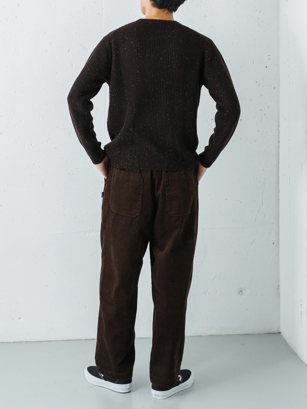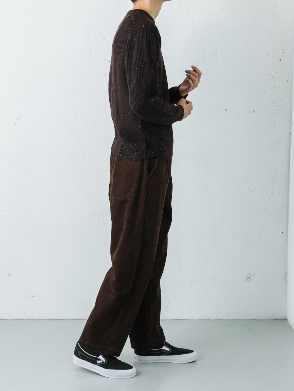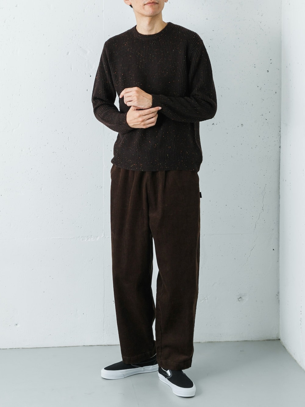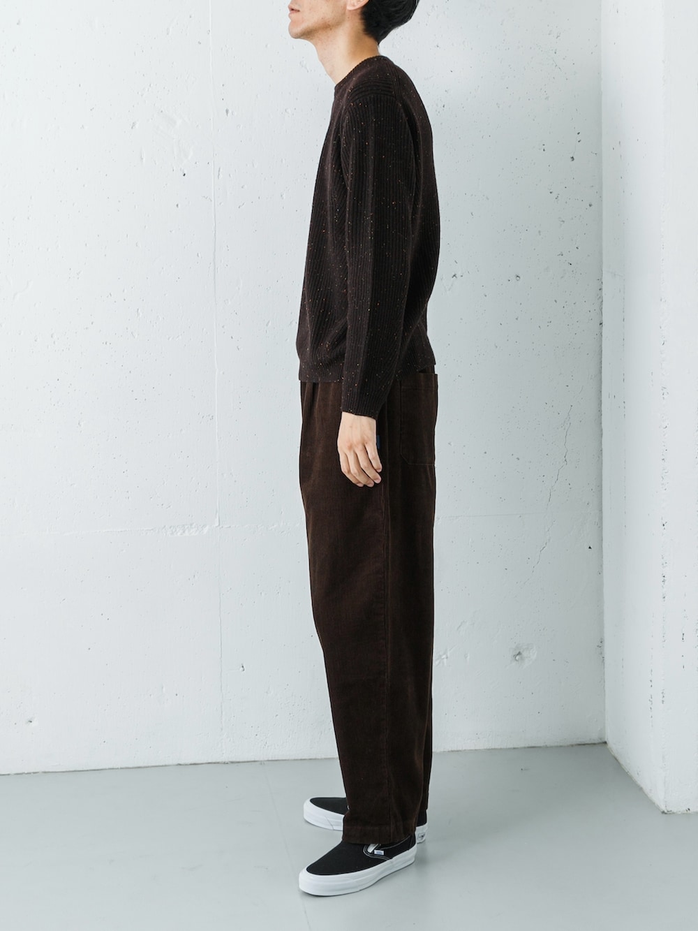 クリーンな印象のウォッシャブルウールニットに、表情豊かなコーデュロイのワイドテーパードパンツを合わせたスタイル。