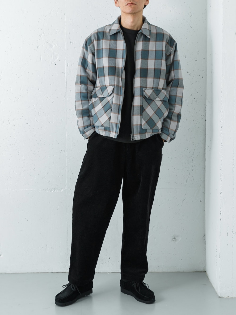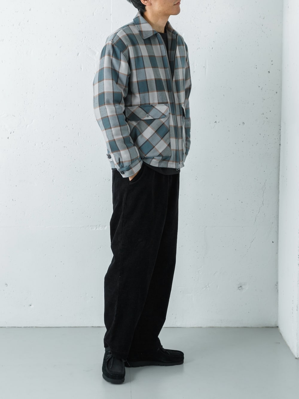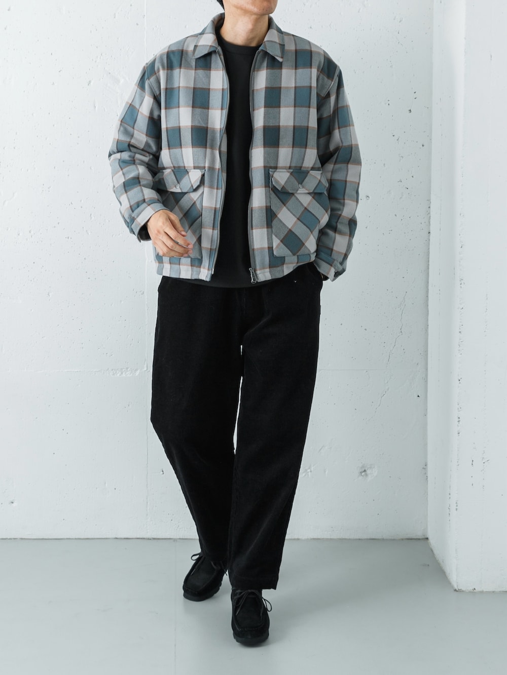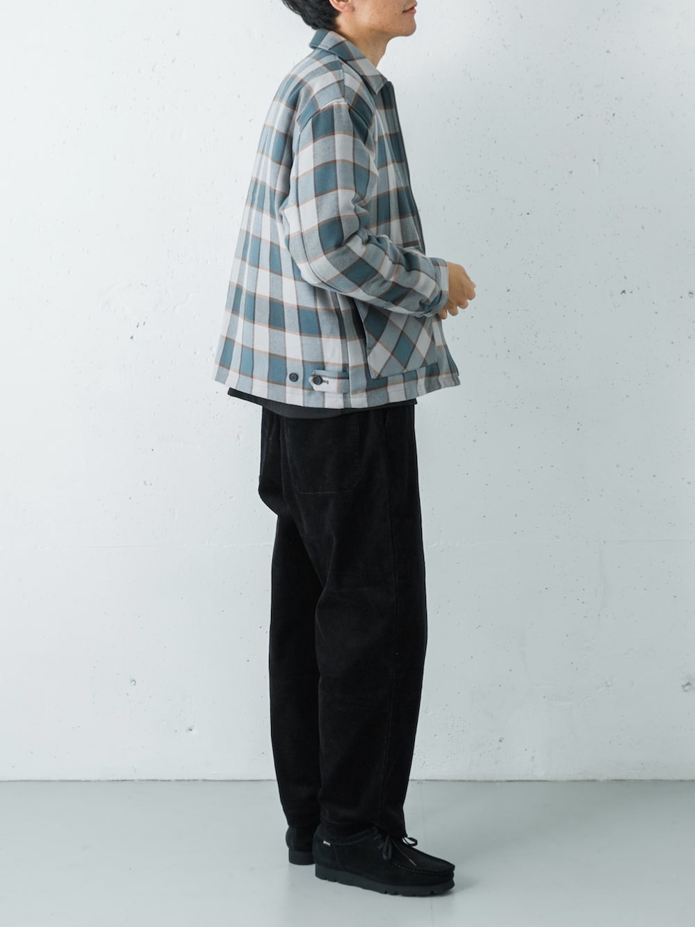 コーデュロイのワイドテーパードパンツで季節感を添え、バランスよくまとまりのある大人のリラックスコーデに仕上げています。
