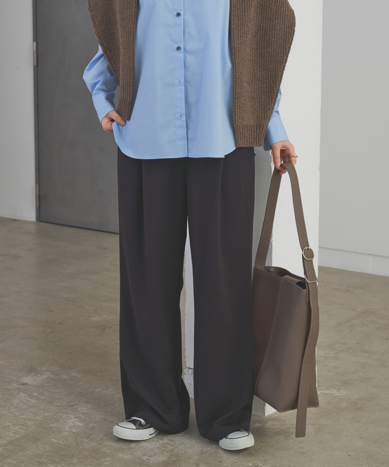 200日ニットを使ってメンズライクなコーデを組んでみました!200日ニットは肌触りももちもちで気持ちよく、着心地もとてもいいです♪
