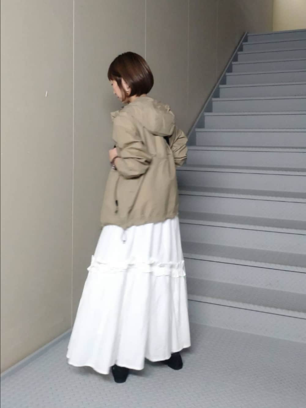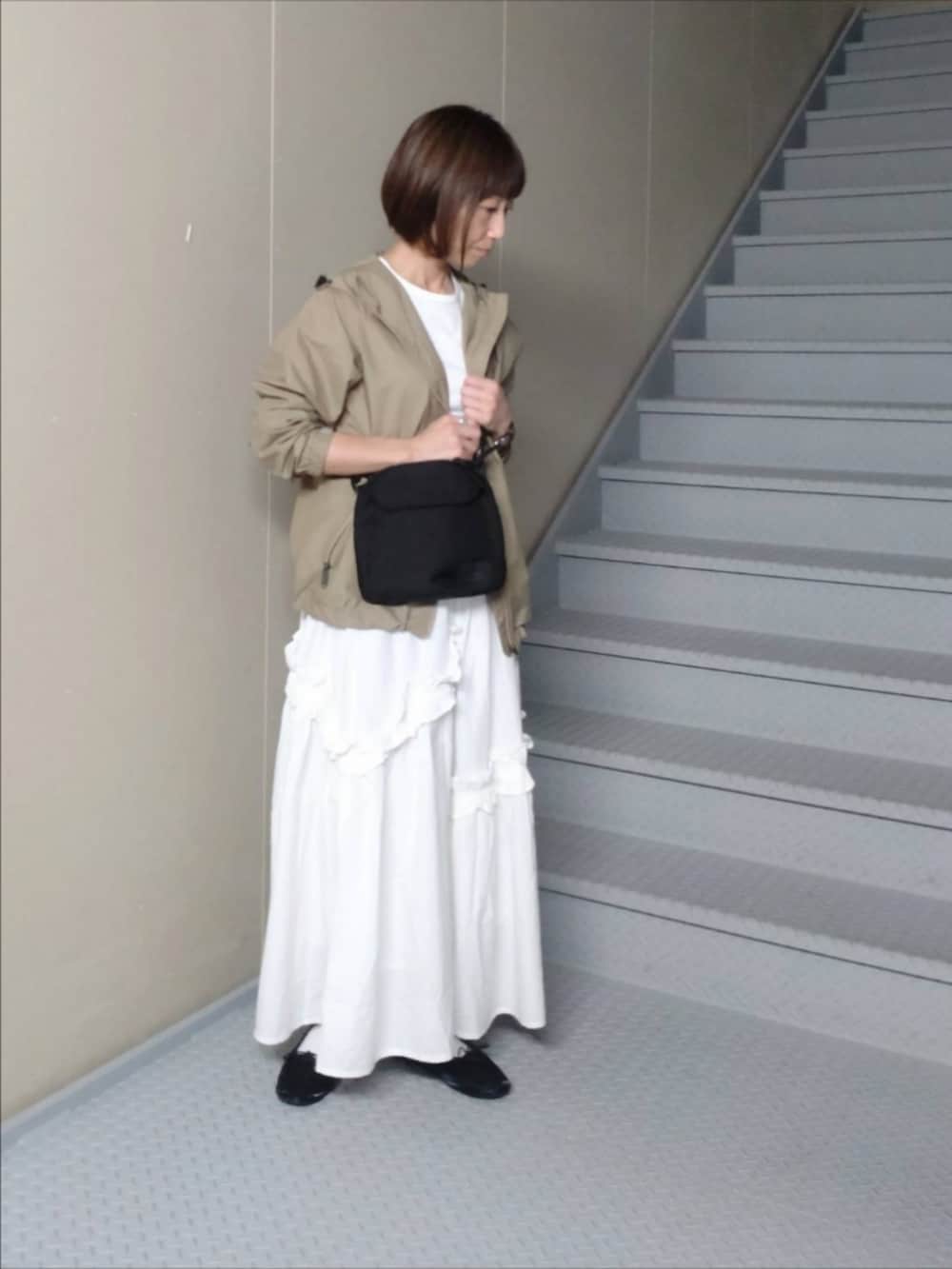 朝晩の羽織をお探しの方。ぜひ、お試しください!!アウターがカジュアルなアイテムなので、あえて少し甘めのスカートとコーディネートしてみました。軽くてコンパクトにたためるので、旅行にも便利です。