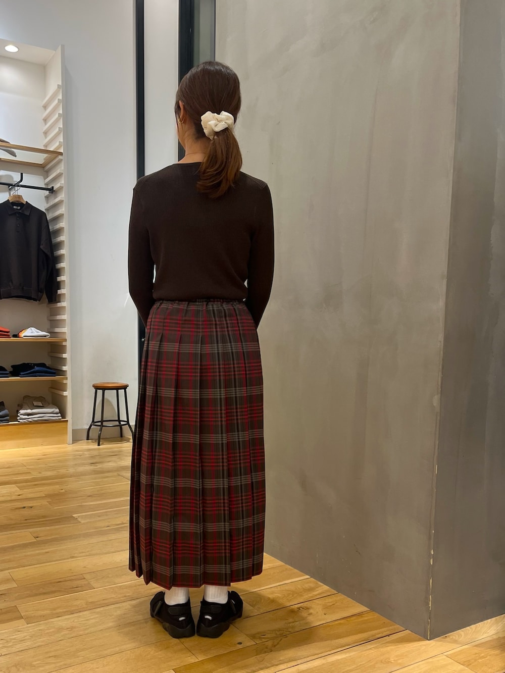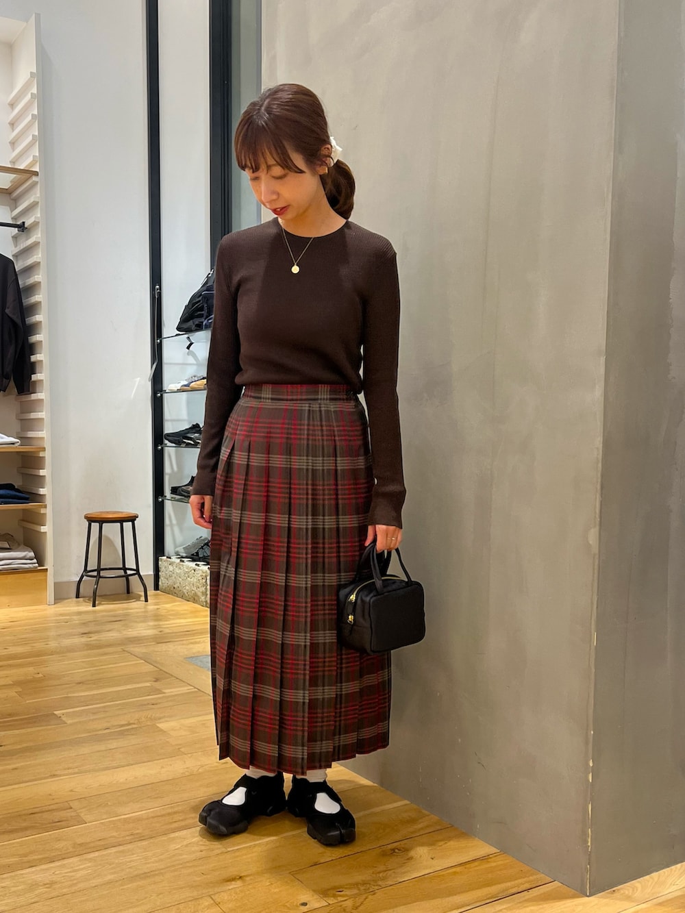 ブラウンのトップスと赤いチェックスカートを合わせて秋らしいコーデに。