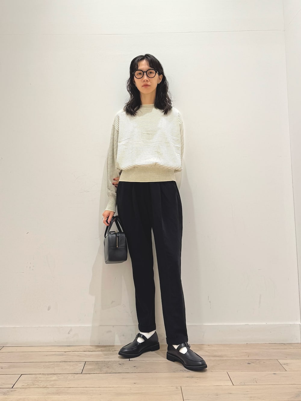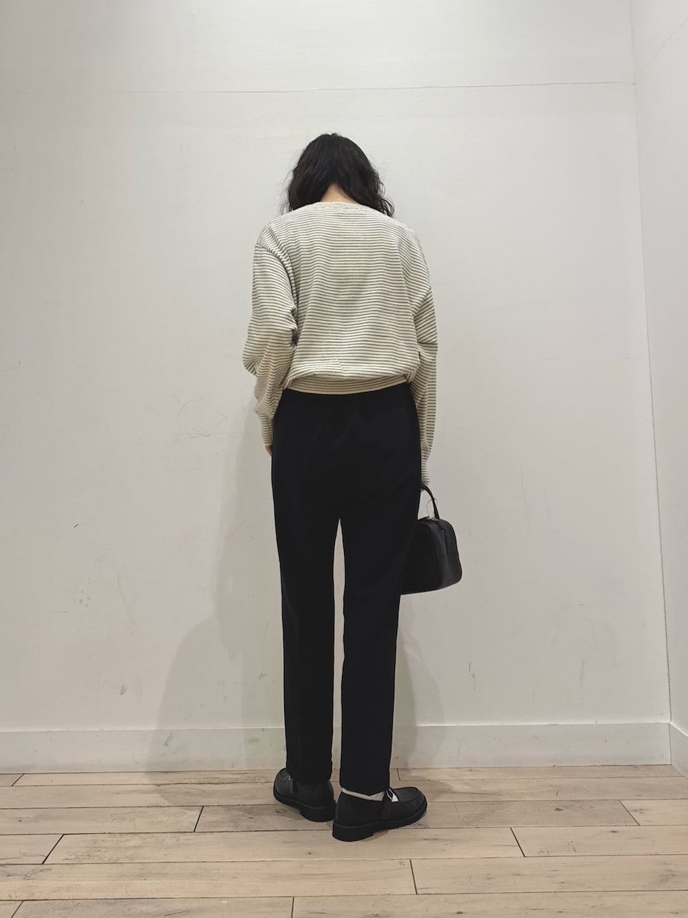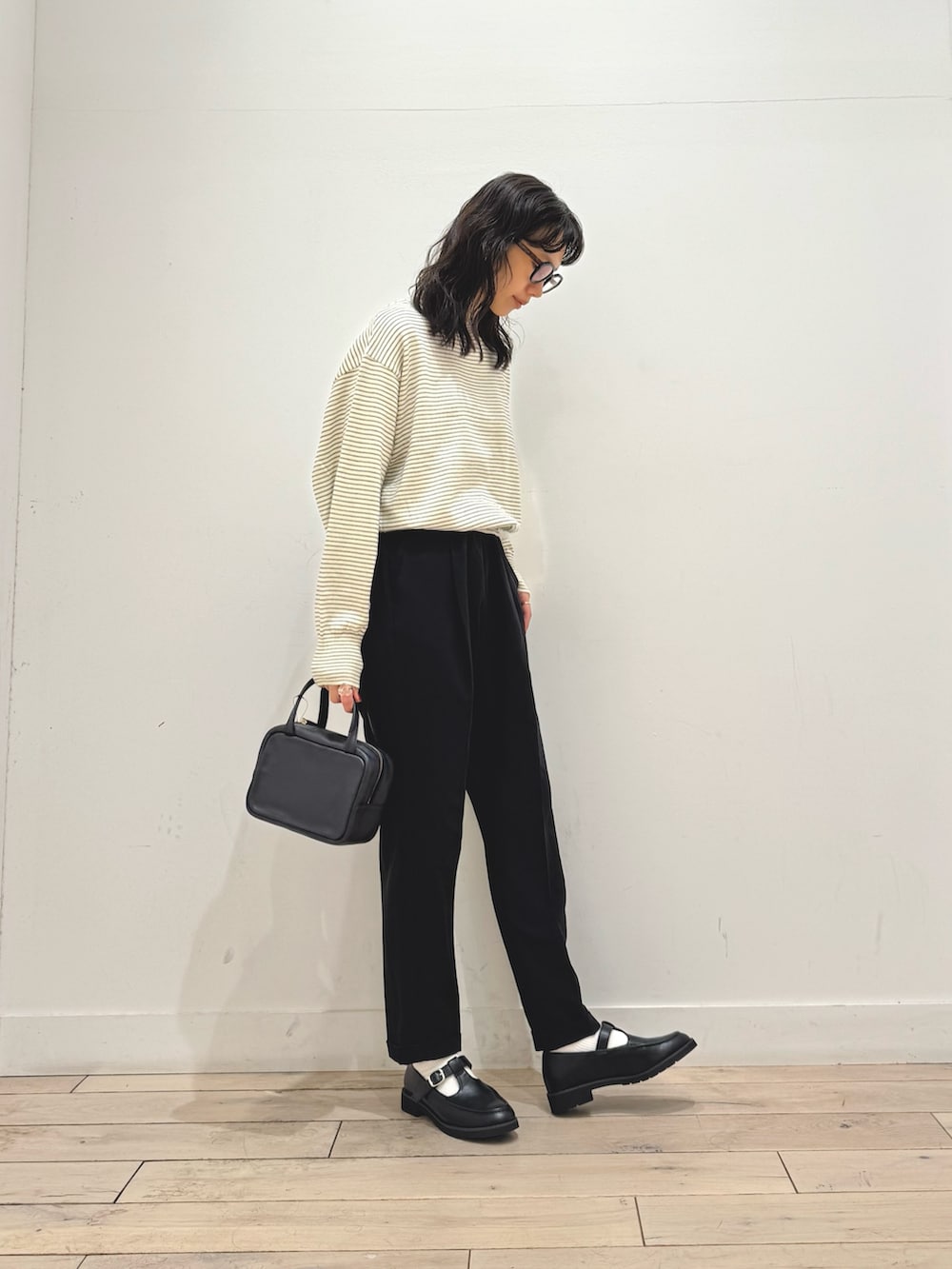 トップスのボーダーニットは裾と袖口のリブがしっかりしているのでゆとりがありつつ、メリハリも出ます◎