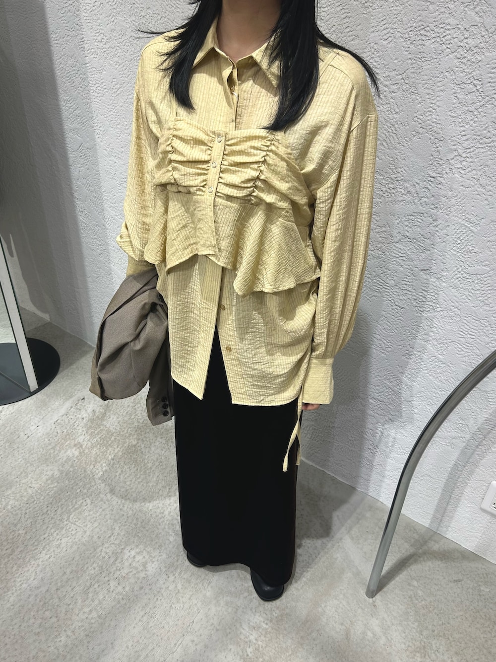 ビスチェSETのシャツは、サイドがドロストでシルエットも可愛く、別々で着回しても◎