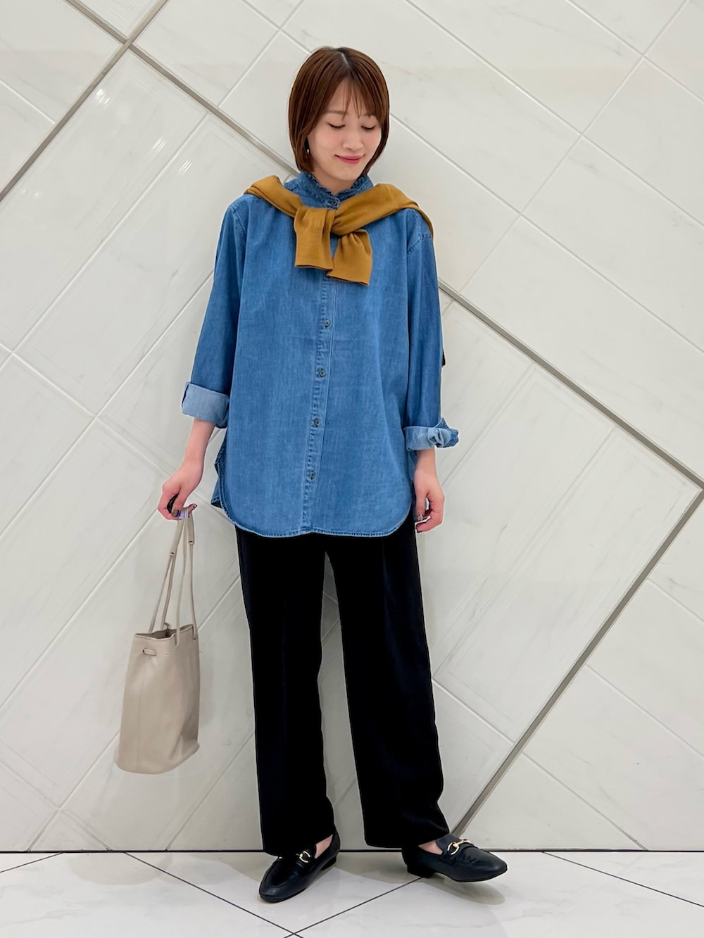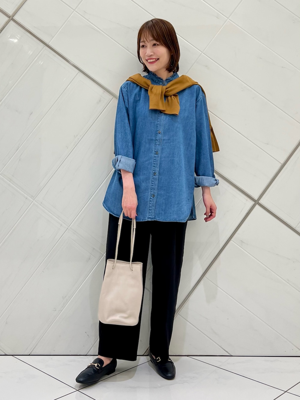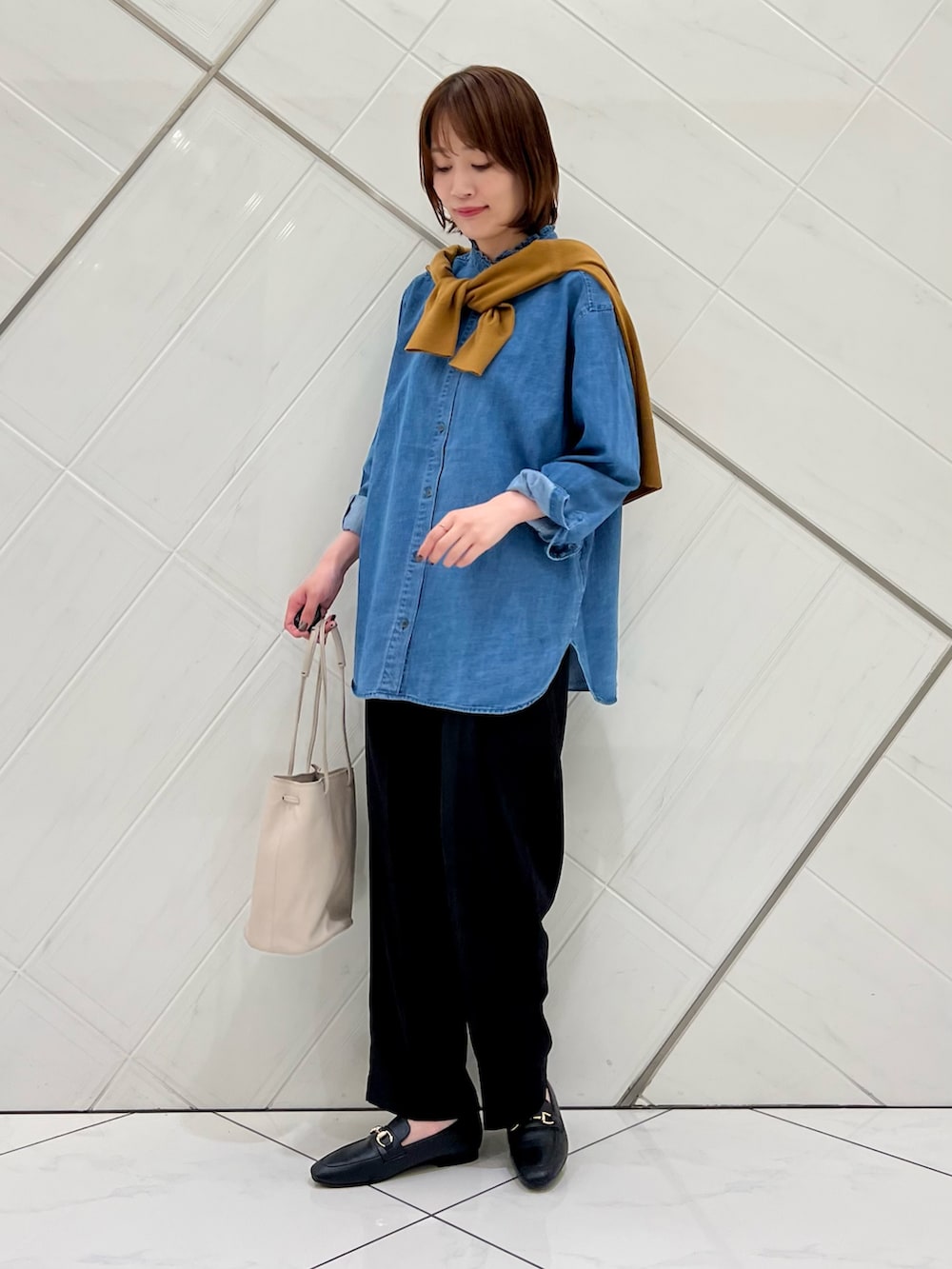 襟元のフリルがポイントのデニムシャツは