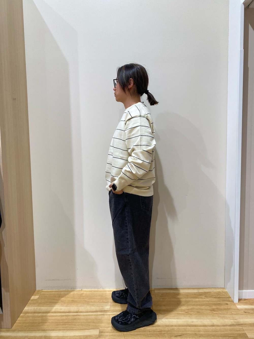 オフホワイトのボーダーは抜け感があって、ゆったりデニムと合わせるだけで今っぽい雰囲気に。