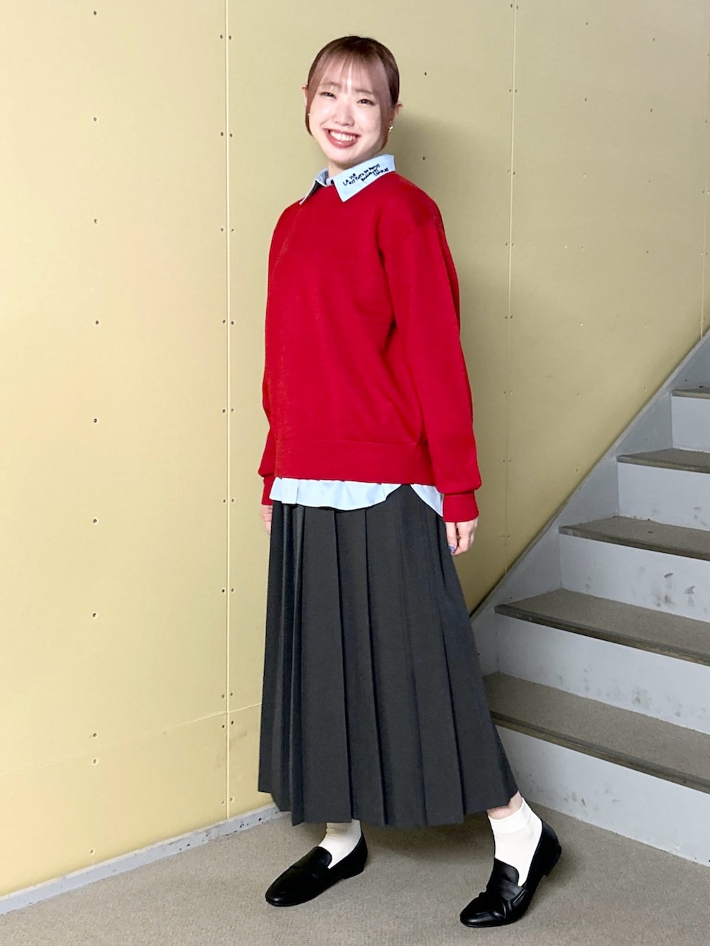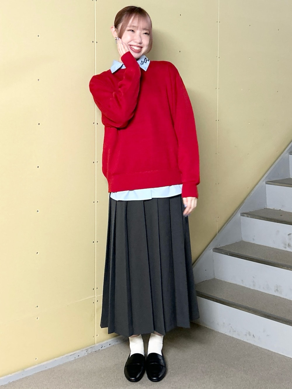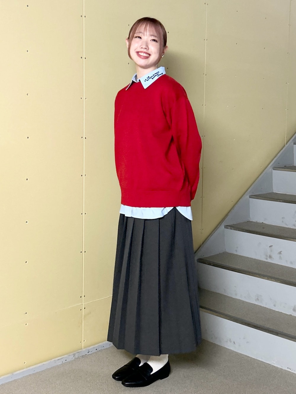 ブルーのシャツに赤のニットの組み合わせが絶対可愛いだろ!と思い、コーデを組みました😌 グレーのプリーツスカートとの相性も良く、とても可愛いくなったと思います😌😌