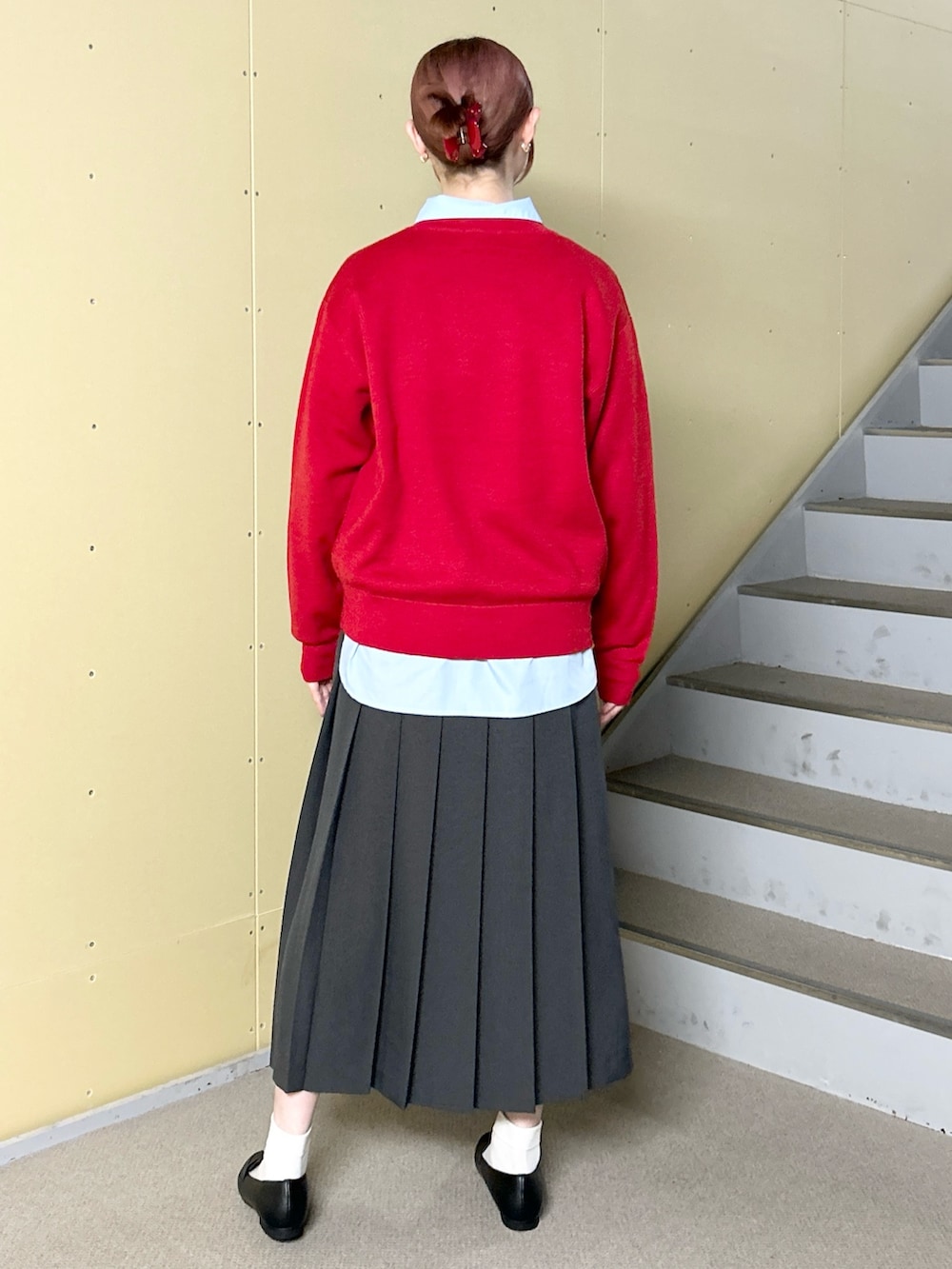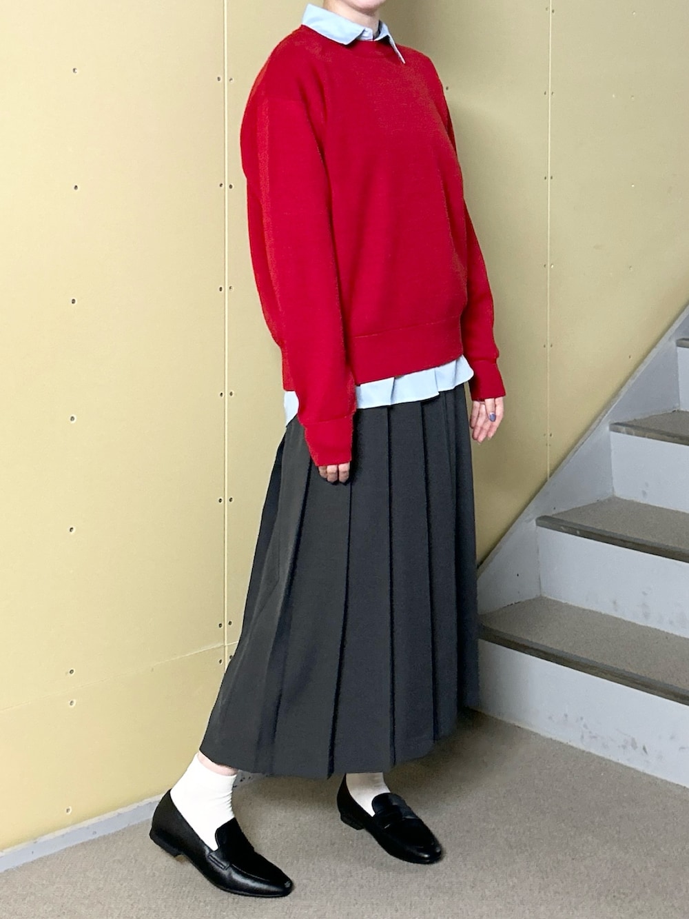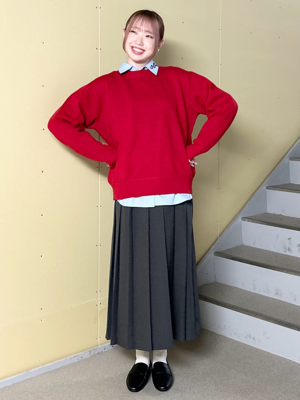 ブルーのシャツに赤のニットの組み合わせが絶対可愛いだろ!と思い、コーデを組みました😌 グレーのプリーツスカートとの相性も良く、とても可愛いくなったと思います😌😌