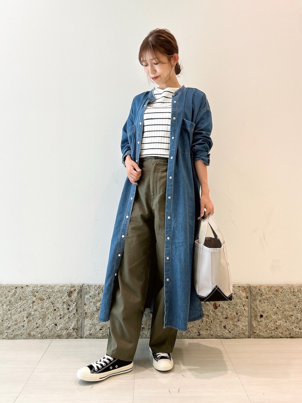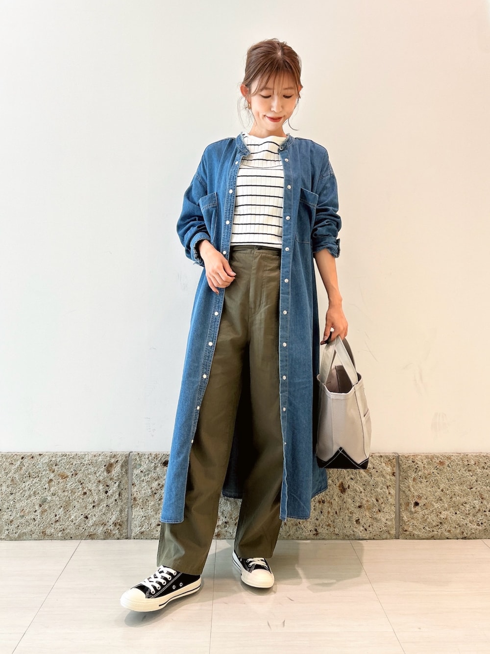 ボトムにはシンプルデザインが大人可愛いカーキのパンツを。