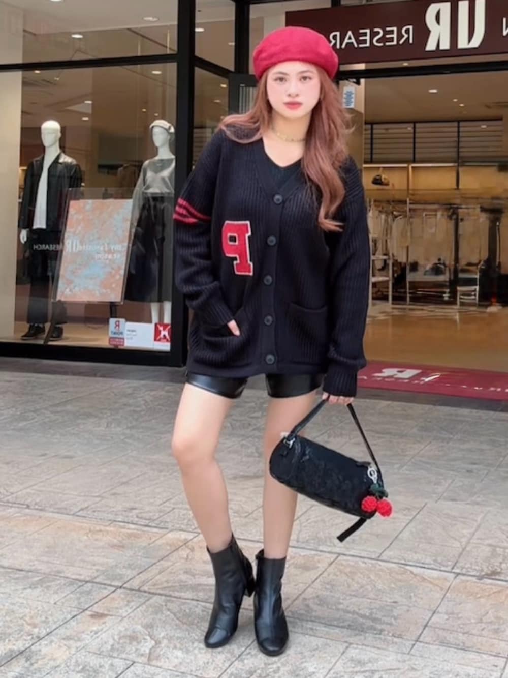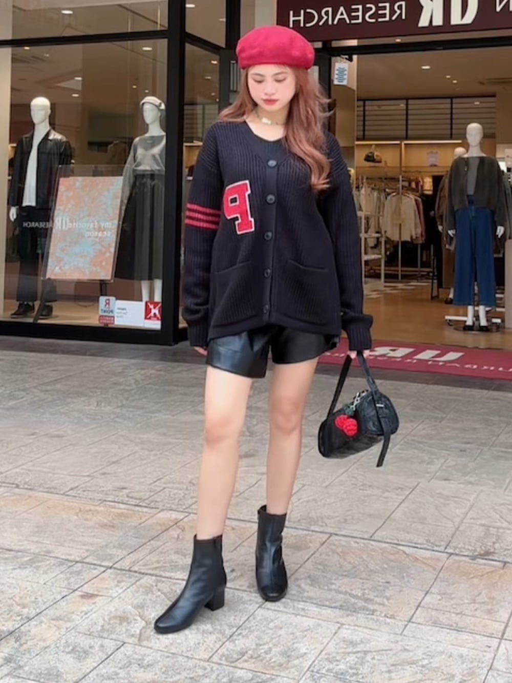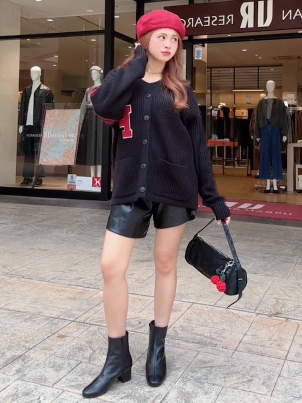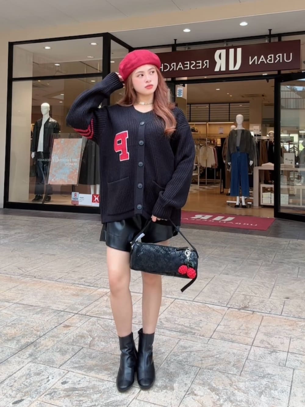 リラックス感のあるビッグカーデにショートパンツで抜け感を出し、ブーツで全体を引き締めたトレンドライクな着こなし。👢