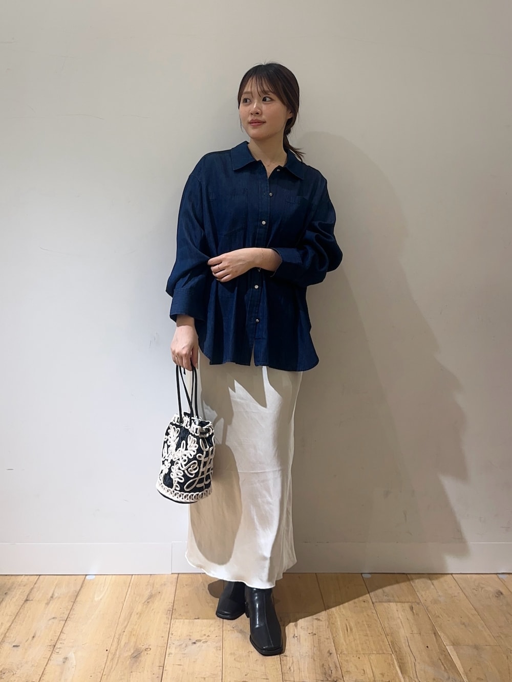 デニムシャツにサテンスカートを合わせてカジュアルになりすぎないコーデにしてみました!