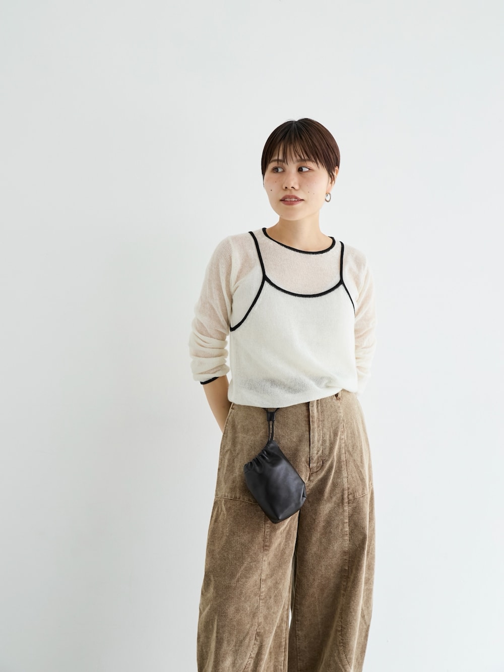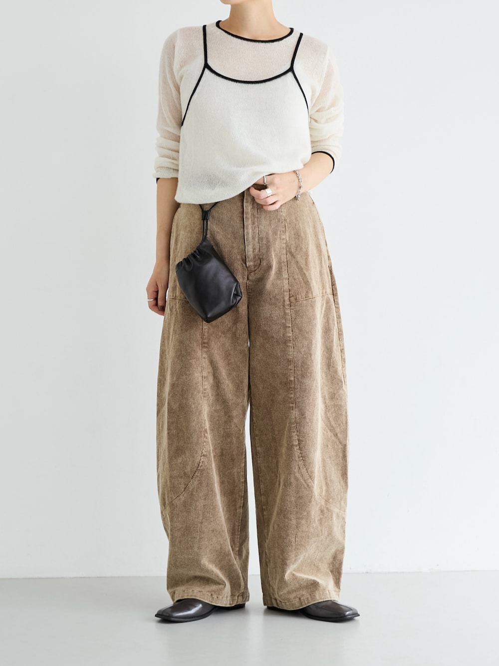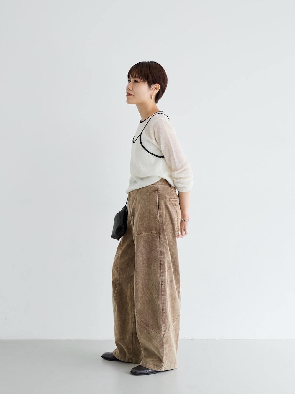 ニットが薄手なので温かみのあるボトムと合わせました。