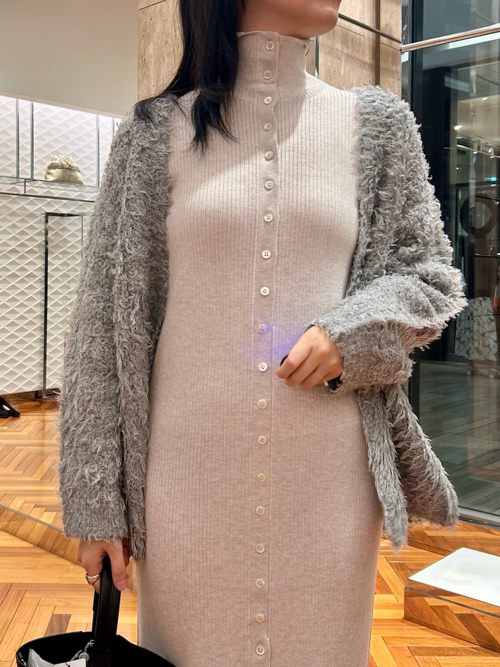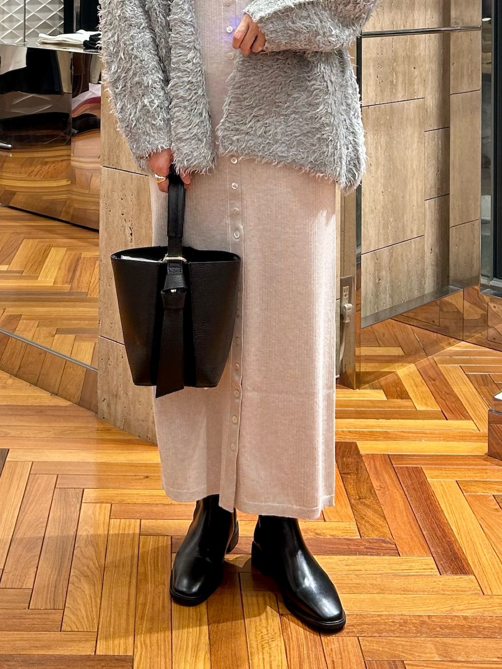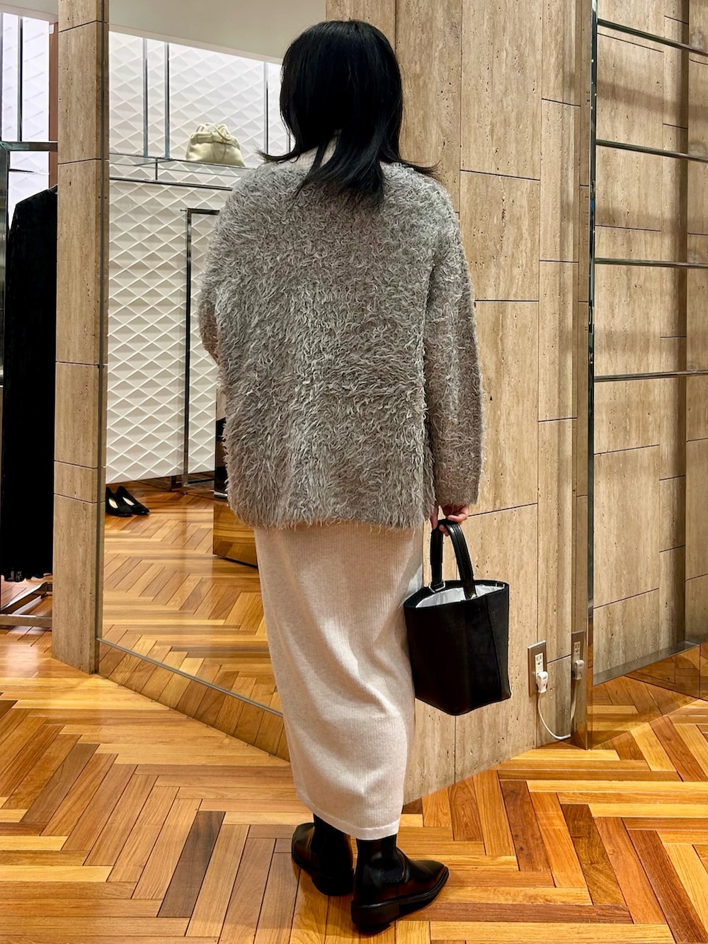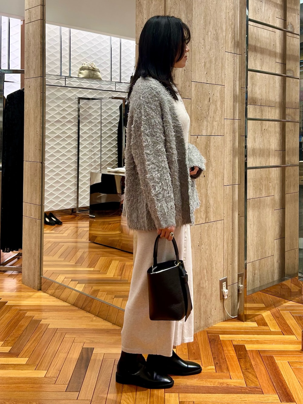 スッキリとしたラインが美しく、カーディガンとのサイズ感のギャップがかわいいコーデです◎