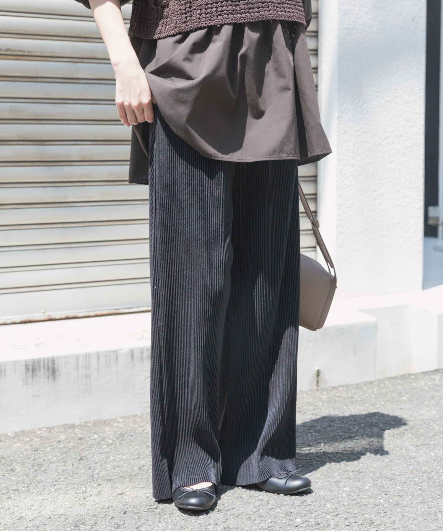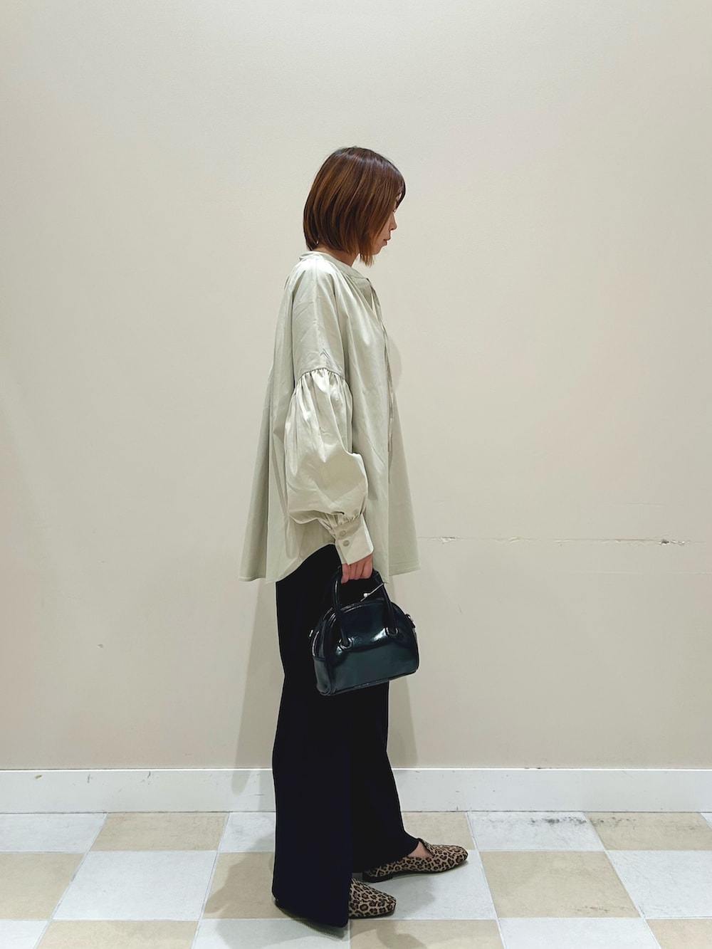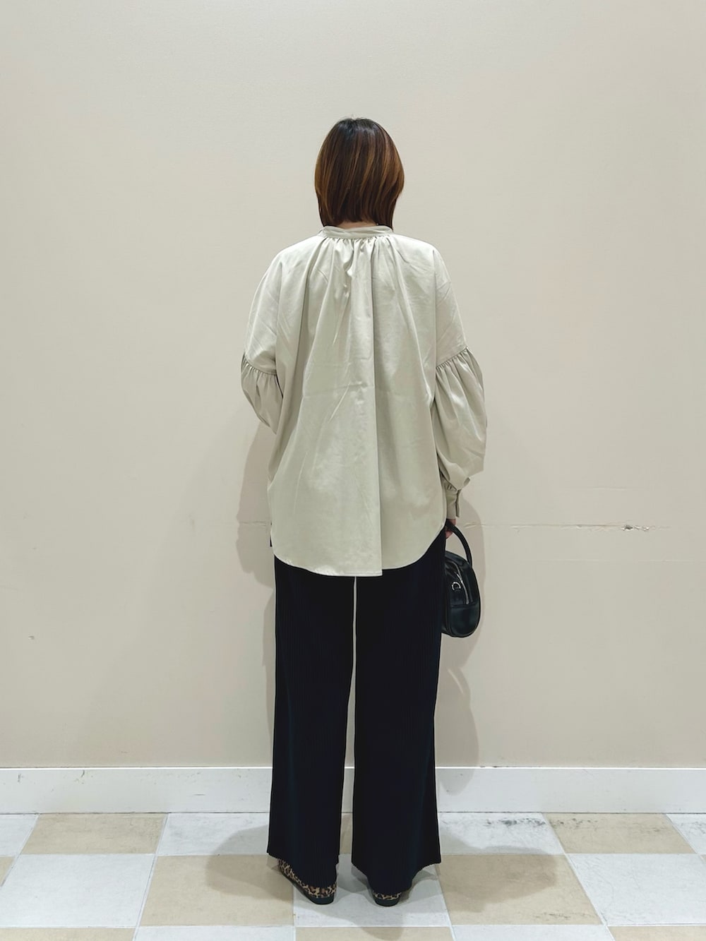 袖のデザインがポイントのゆったりシルエットのスキッパーブラウスにプリーツパンツでさらっとシンプルコーディネートです。