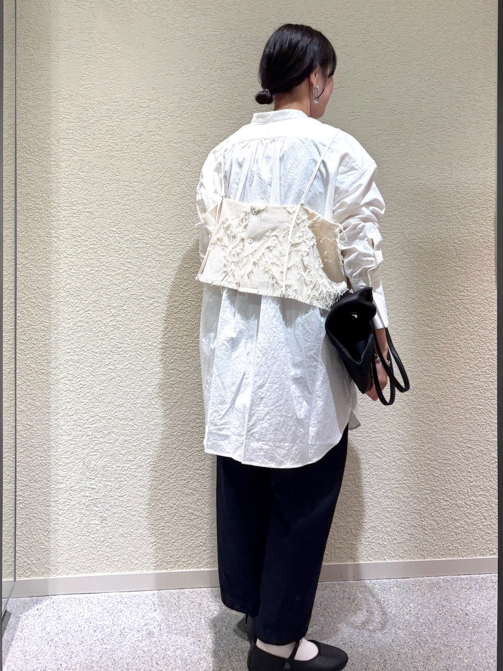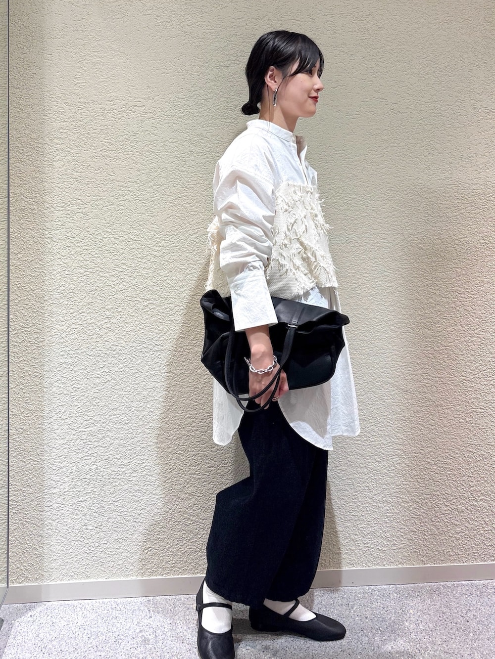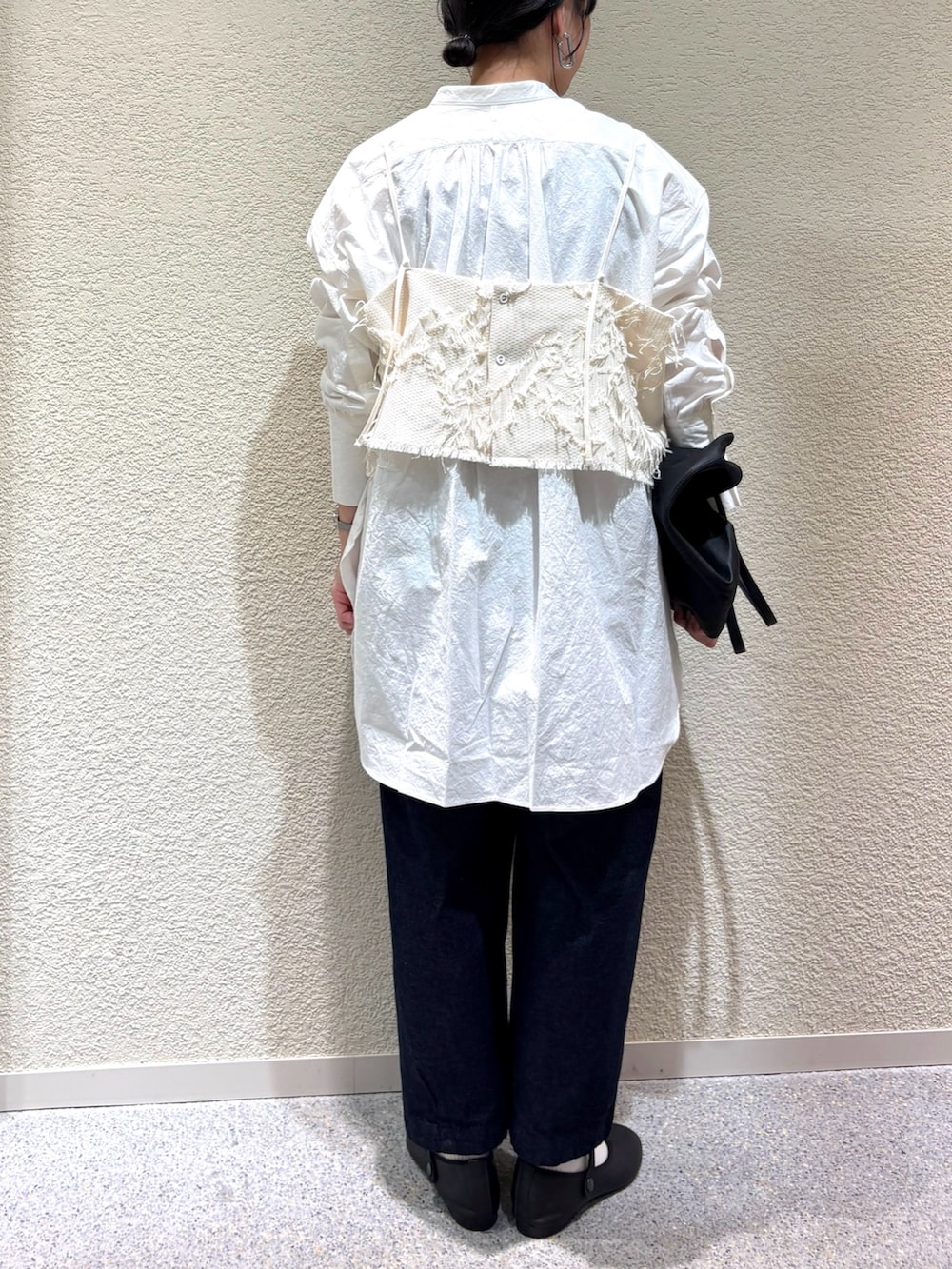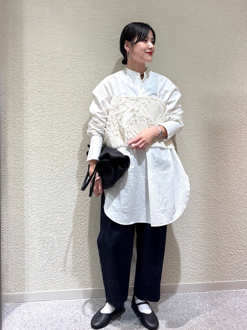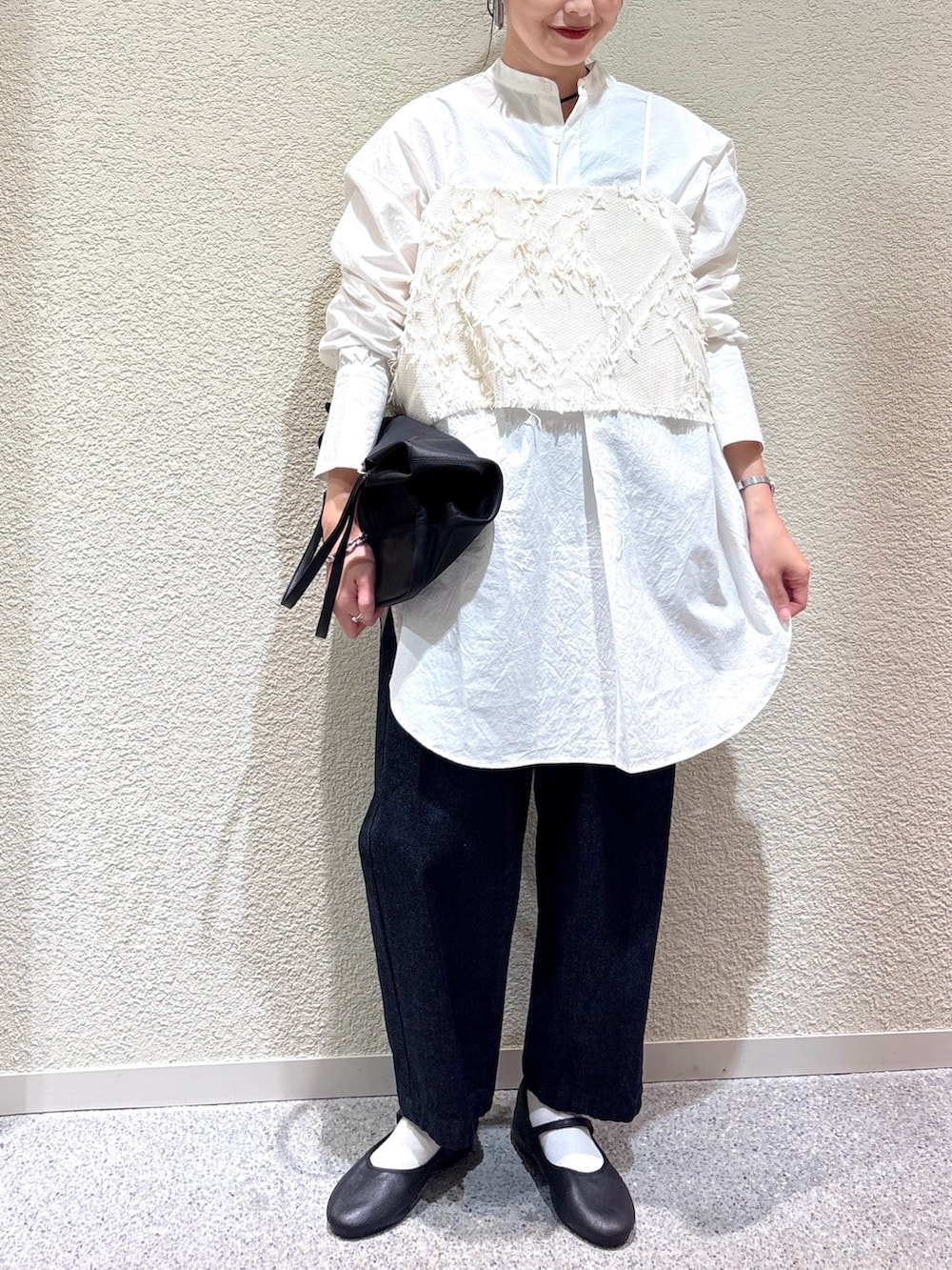 ・アイボリー×オフホワイトの淡い色合わせが柔らかさを演出し、インディゴデニムで全体をすっきり引き締め