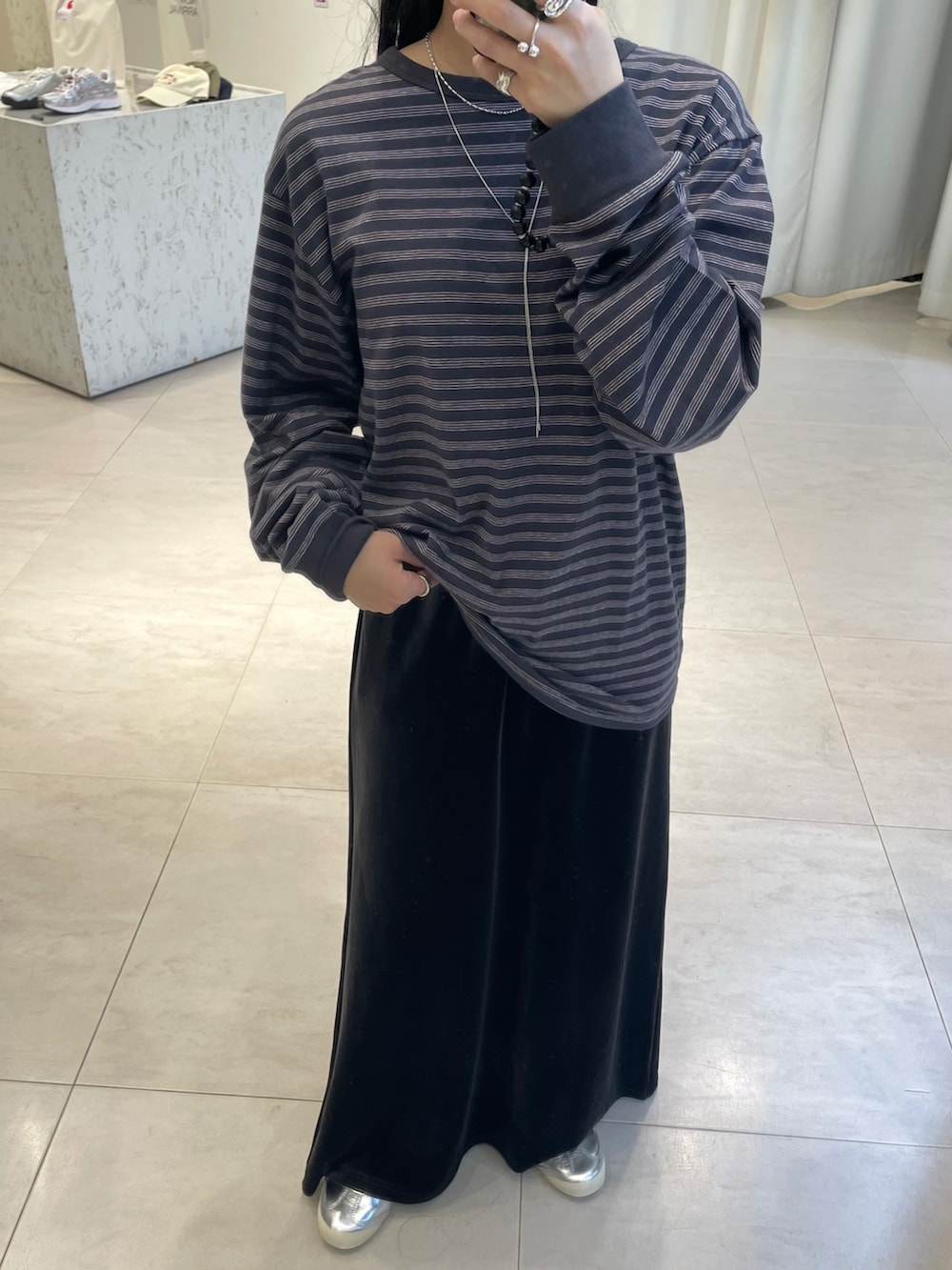 透け感もなく体のラインも拾いにくいロンTは1枚着でも◎シルバーの小物をポイントに秋らしいベロアスカートを合わせました。
