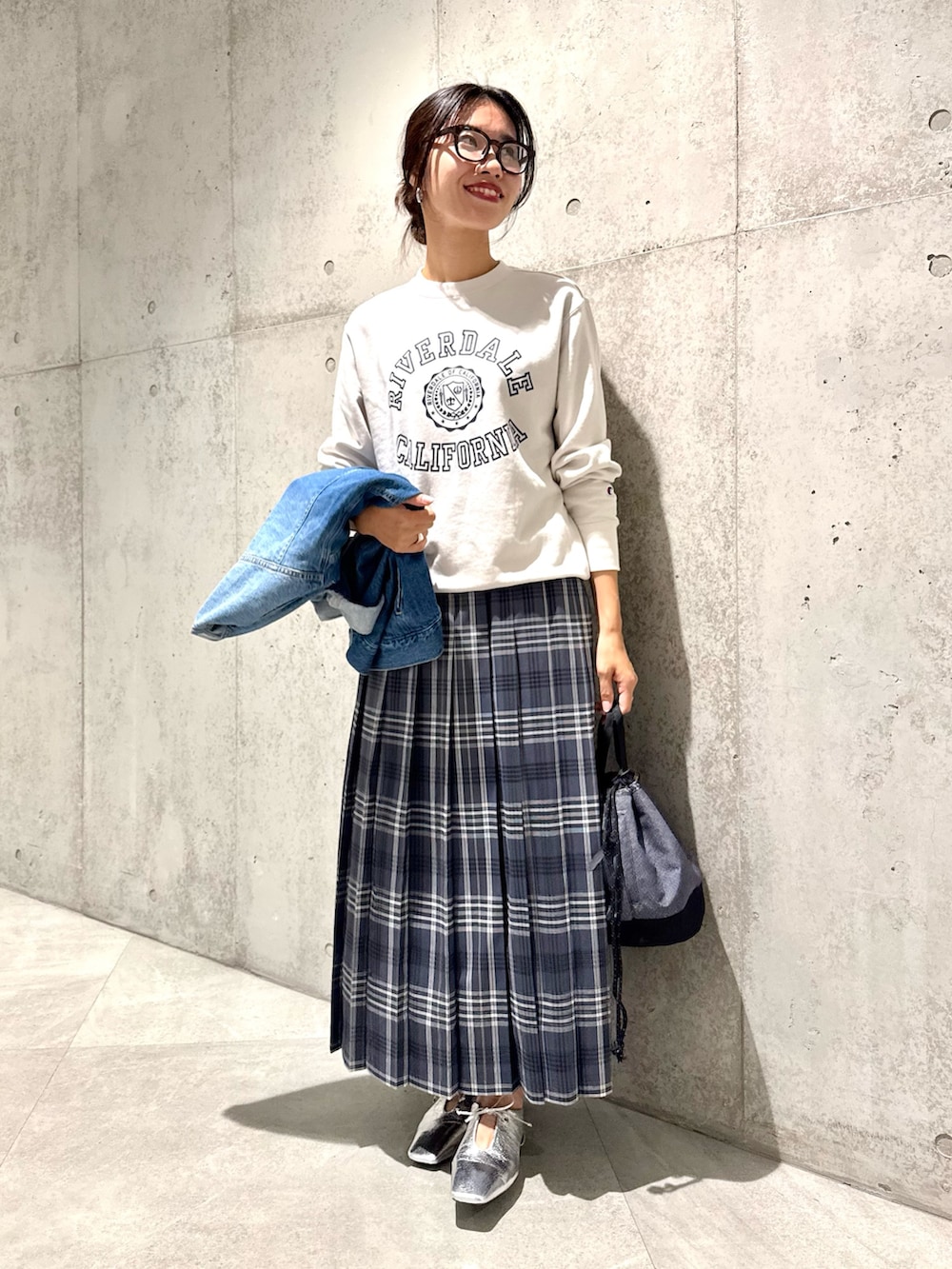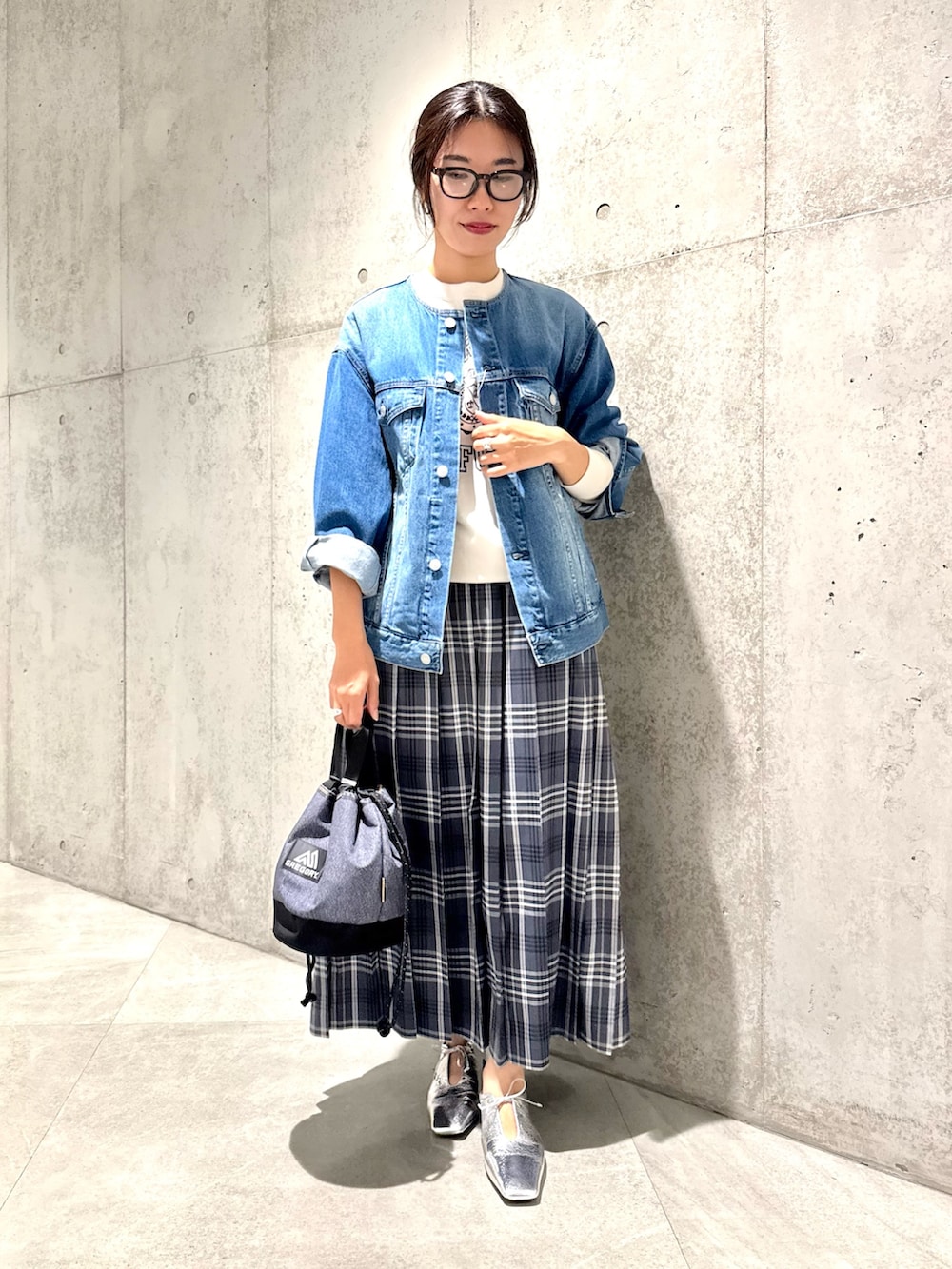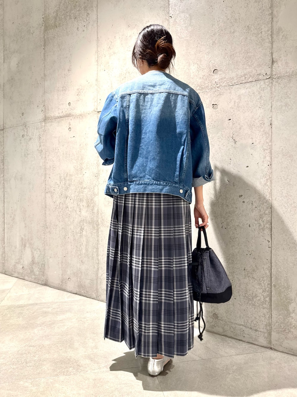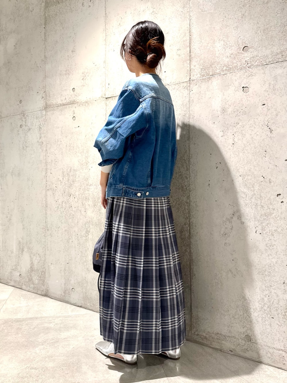 羽織ったデニムジャケットは、ノーカラーなのでごつくならないところが◎