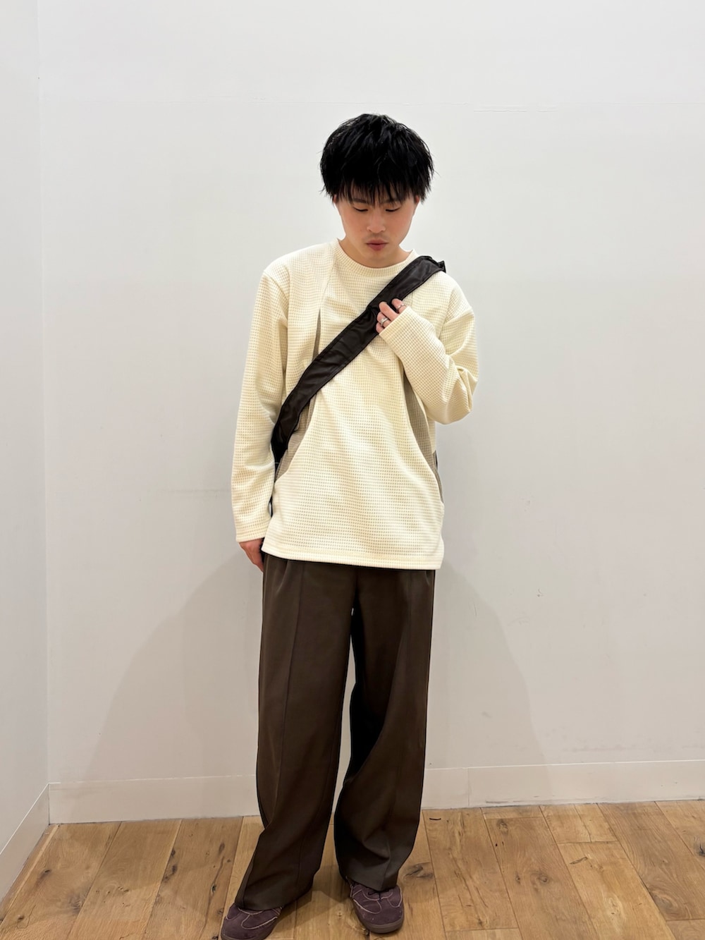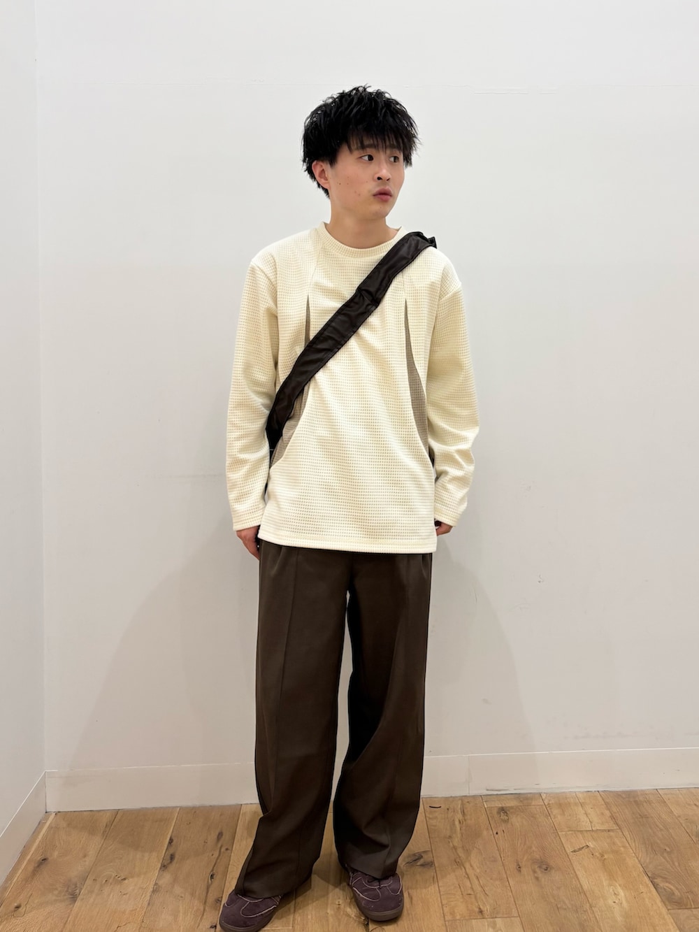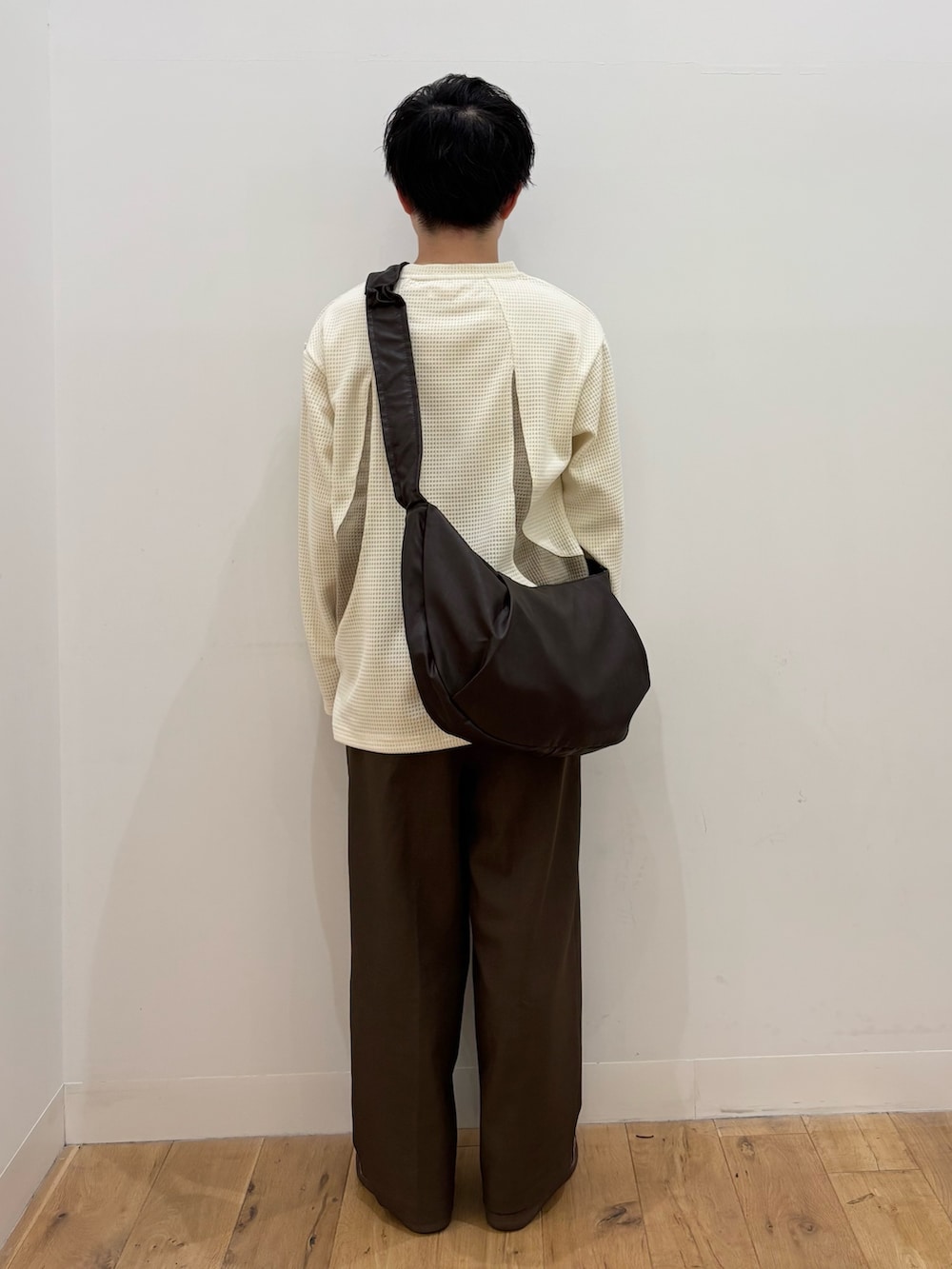 パンツ、バック、靴がブラウンでまとめているので、よりロンTのWhiteのカラーが引き立つコーディネートです!