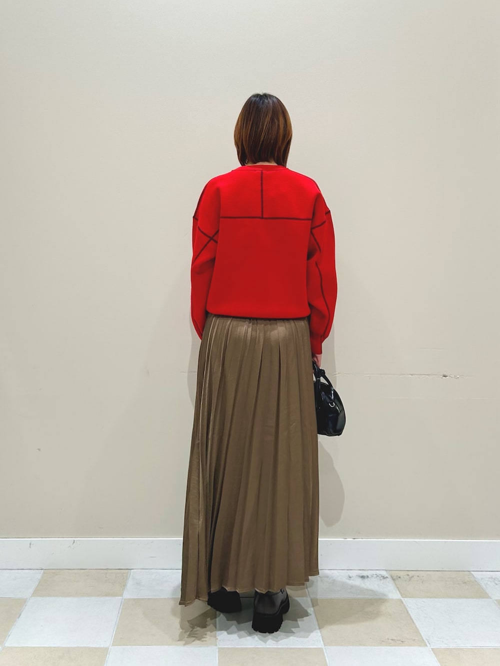 秋におすすめのカジュアルな雰囲気の赤ニットに光沢のキレイなプリーツスカート、ローファーを合わせました!